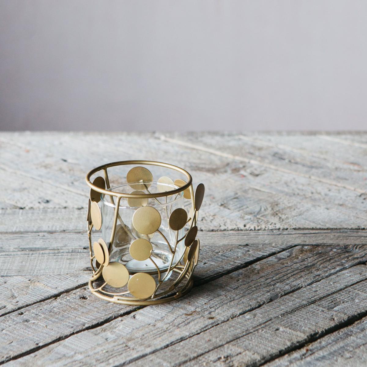 Winter berries vine around this glass tea light holder made of iron with a warm brass finish.