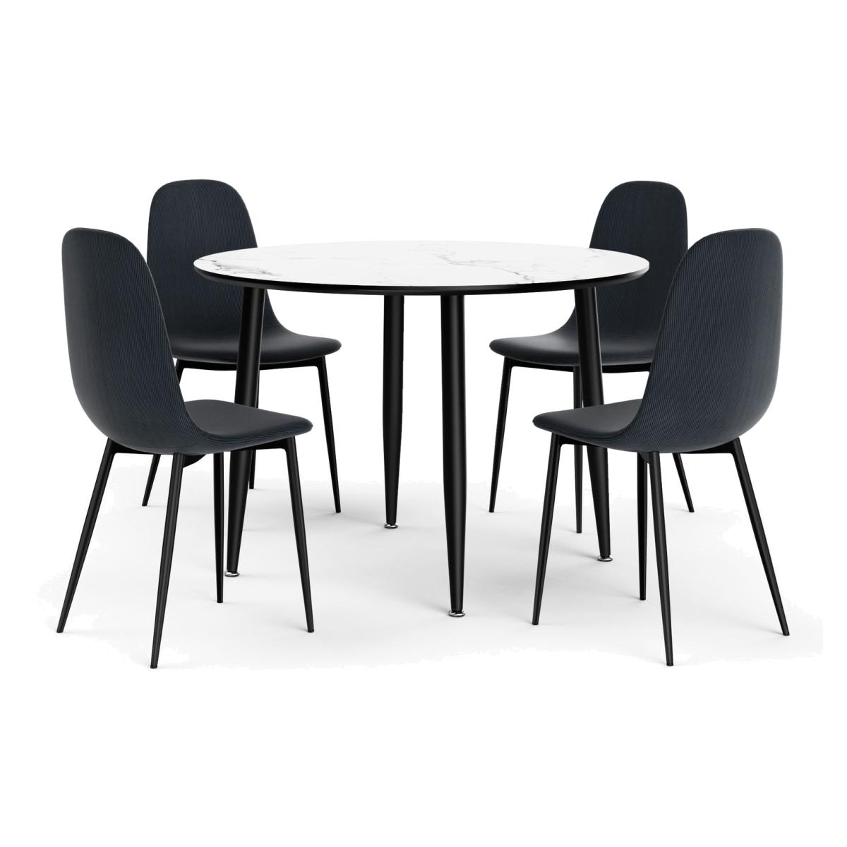 Infuse luxury style into your home with the Von Haus dining table and 4 chairs, set on mid-century inspired tapered legs to create a subtle centrepiece. The charcoal blue cord upholstery of the chairs complements the tables matte faux marble tabletop effortlessly, bringing an opulent feel. Elevate your kitchen or dining room with our 4 seater table and chairs, designed for aesthetics and stability, form and function. The robust metal table legs are finished with non-slip adjustable rubber feet, ensuring sturdy dinner party-proof use in any home. Meanwhile the gentle curvature, soft-touch polyester, and foam padding of the chairs promise a comfortable dining experience. Add a touch of luxe to mundane weeknight meals, large family gatherings, and lavish dinner parties.