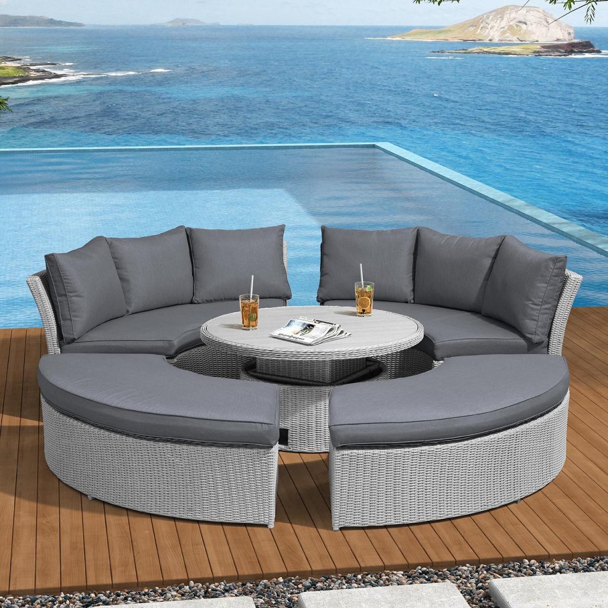 The Nova - Windsor Rising Corner Sofa Dining Set - White Wash is the ultimate set for dining, entertaining and relaxing. This unique set combines 2 rounded sofa benches with 2 curved footstools and a rising table for modular furniture that can be set up in multiple positions for the ultimate lounge set. This furniture is ideal for entertaining as it offers somewhere to dine and relax, without adding extra furniture and taking up extra garden space. This is possible as the table can be adjusted to from a low coffee table, ideal for relaxing, or a casual dining table, ideal for al fresco dining. The table can be adjusted in a few simple motions and is perfect for multiple purposes. Not only can the set be used as a sofa set and a casual dining set but, when the table is lowered, the glass can be removed and replaced with a circular padded cushion which is included, then with all pieces pushed together this set becomes a luxrious daybed ideal for sunbathing and sprawling out. The furniture is crafted using rustproof powder coated aluminium frames as well as a 7mm PE synthetic rattan weave which is fully weatheproof and can be left outside all year round, enduring temperatures of +40°C and -20°C. This set comes with padded cushions throughout which help to improve the comfort of the furniture. Whilst these cushions are not fully weatherproof, they will survive a light shower and can be cleaned easily should spills occur. We do, however, recommend storing the cushions indoors when not in use. Set Includes: 2 x Curved Sofa Benches 2 x Curved Footstools 1 x Rising Table Key Features: Padded Cushions Throughout Tempered Safety Glass Powder Coated Aluminium Frames 100% Weatherproof PE Rattan.