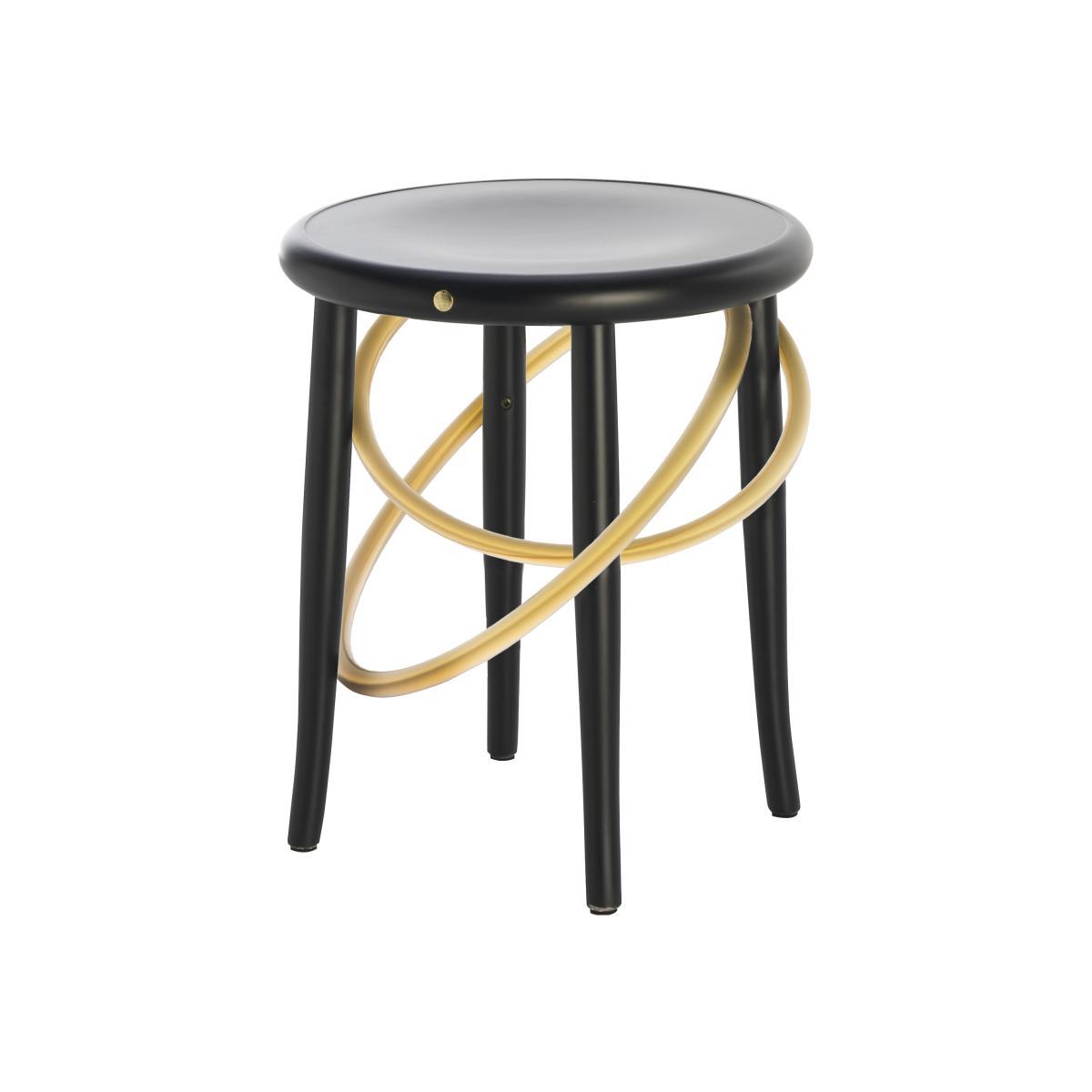 This family of stools, designed by Martino Gamper in 2015, is brought to life by a playful circus theme and jugglers. The curved element, found in all Wiener GTV Design's work, is introduced unexpectedly, while fitting in perfectly with the project, in the form of a chain comprising two brass rings strung around the feet. This encompassing metal apron sketches a series of delicate interlacing sinuous and dynamic lines. The iconic silhouette of the Wiener GTV Design stool, anchored in all our memories, is brought fully up to date with the addition of these rings. At the crossroads between tradition and innovation, the Circus stool offers original lines while alluding to the brand's origins. The Circus stool's legs are crafted from bent beechwood. The seat is made of beechwood plywood. It comes in a multitude of colours: please ask us.
