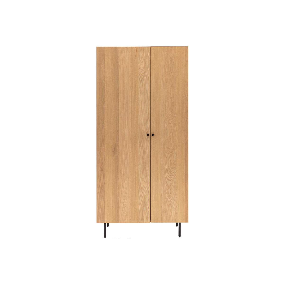 I’m a big fan of this wardrobe for its simple, streamlined silhouette and warm oak finish - it feels right at home in both modern Scandi schemes and pared-back industrial interiors. Its slim profile makes it ideal for smaller bedrooms or hallway nooks, while the black metal legs and knobs add a subtle contrast that ties in nicely with other metal accents. To style it, keep the surroundings light and uncluttered: pair with a pared-back mirror or a slim console table in similar wood tones. Inside, use matching hangers and woven boxes on the top shelf to maintain order, and consider adding a low-pile rug underneath to anchor the space. A single ceramic vase or framed artwork on one side will complete the look without overwhelming the clean lines of the unit.