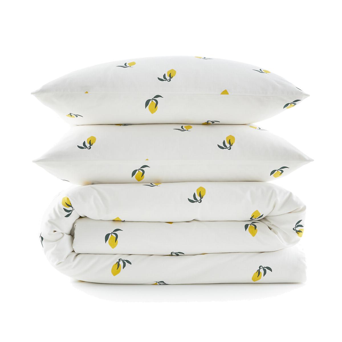 A fresh, tangy lemon print that's sure to brighten up any interior. The Citron set is created by La Redoute Intérieurs. Cotton is part of our daily lives. We love it for its suppleness and softness. Easy Care, it is ideal for the beds of young and old alike!Product Details • 100% cotton • 50% virgin cotton, 50% recycled cotton • 144 thread count • Printed with yellow lemons on a white background front and back • Straight buttoned hem Care Advice • Machine washable at 40°CDimensions • Duvet cover 140 x 200cm + 1 pillowcase 63 x 63cm : Single • Duvet cover 200 x 200cm + 2 pillowcases 63 x 63cm : Double • Duvet cover 240 x 220cm + 2 pillowcases 63 x 63cm : Super King • Duvet cover 260 x 240cm + 2 pillowcases 63 x 63cm : Super King • Recycled cotton. Using recycled cotton is all about conserving resources and reducing waste. • OEKO-TEX® Standard 100. Standard 100 certification by OEKO-TEX® tests textile products for harmful substances via an independent, international label.