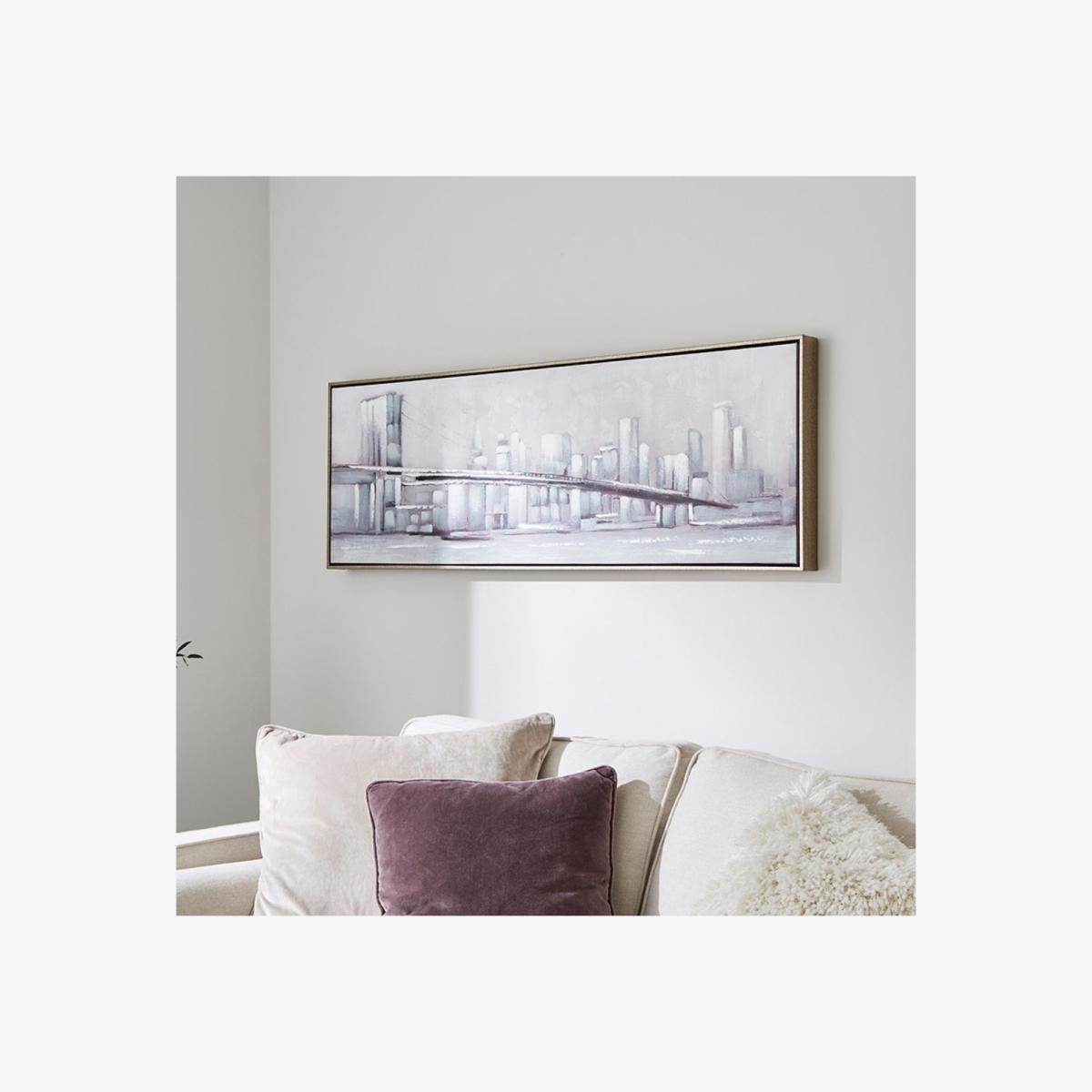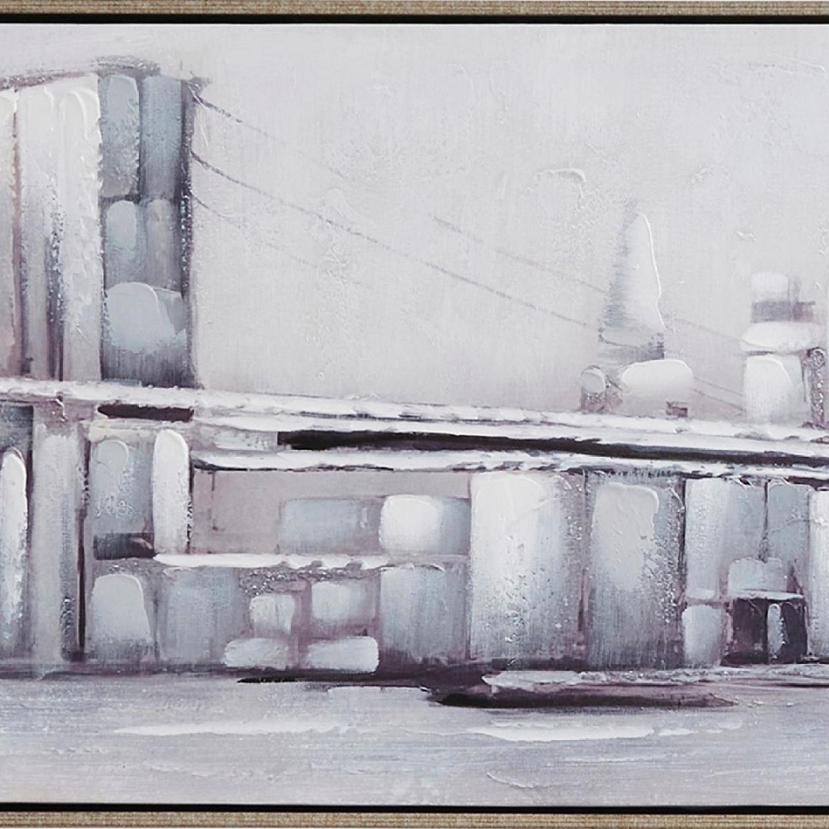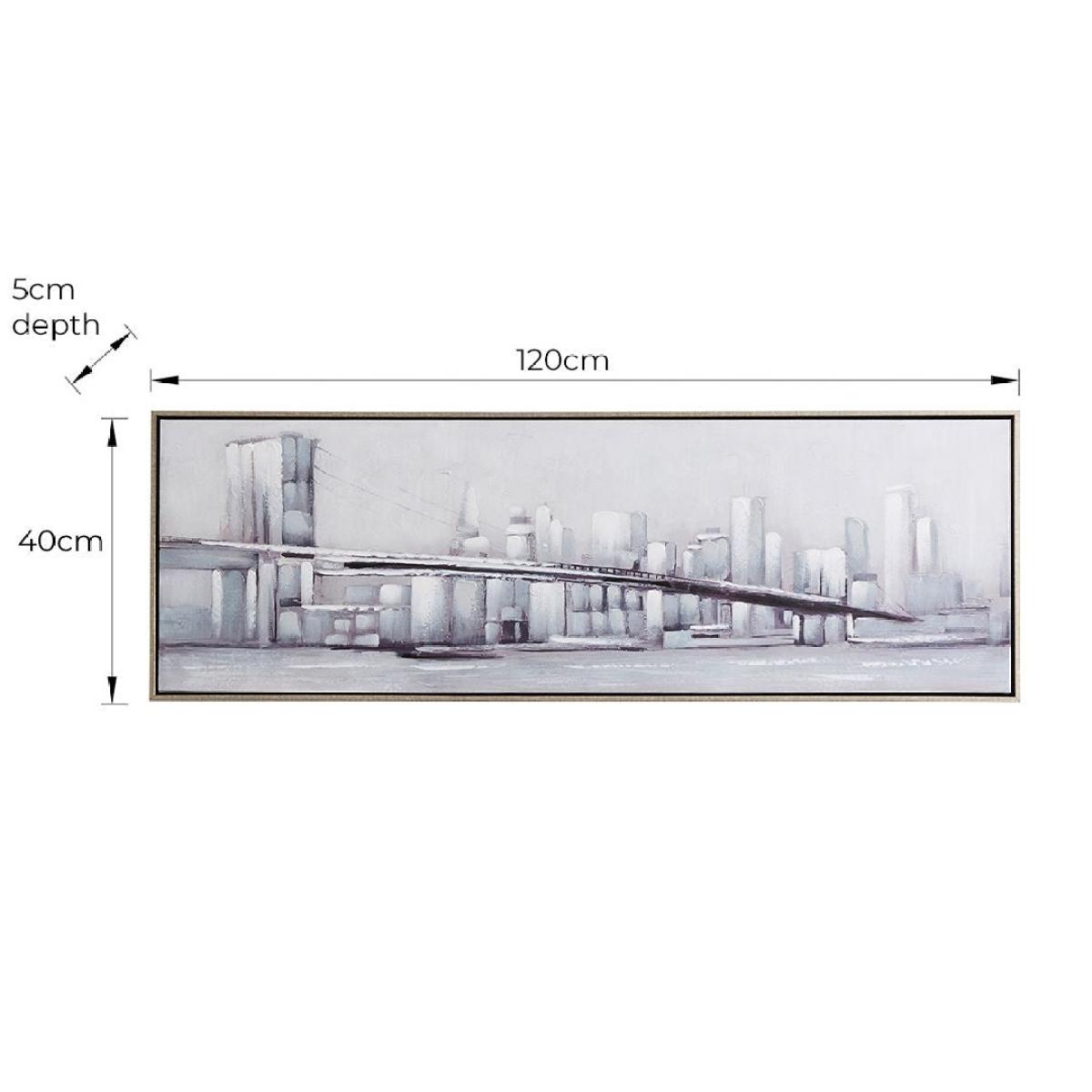 City Life framed canvas wall art, hand-painted with a silver frame. Capture the energy and architecture of New York with the City Life framed canvas wall art. This long rectangular piece features a hand-painted oil depiction of the iconic Brooklyn Bridge, brought to life in a moody, monochromatic palette of cool bluey-grey tones. The brushstrokes add texture and depth, evoking the atmosphere of a misty city morning. Finished in a sleek silver frame, this piece blends urban charm with refined style—perfect for modern interiors that appreciate both art and architecture. City Life framed canvas wall art, hand-painted with a silver frame. Capture the energy and architecture of New York with the City Life framed canvas wall art. This long rectangular piece features a hand-painted oil depiction of the iconic Brooklyn Bridge, brought to life in a moody, monochromatic palette of cool bluey-grey tones. The brushstrokes add texture and depth, evoking the atmosphere of a misty city morning. Finished in a sleek silver frame, this piece blends urban charm with refined style—perfect for modern interiors that appreciate both art and architecture.