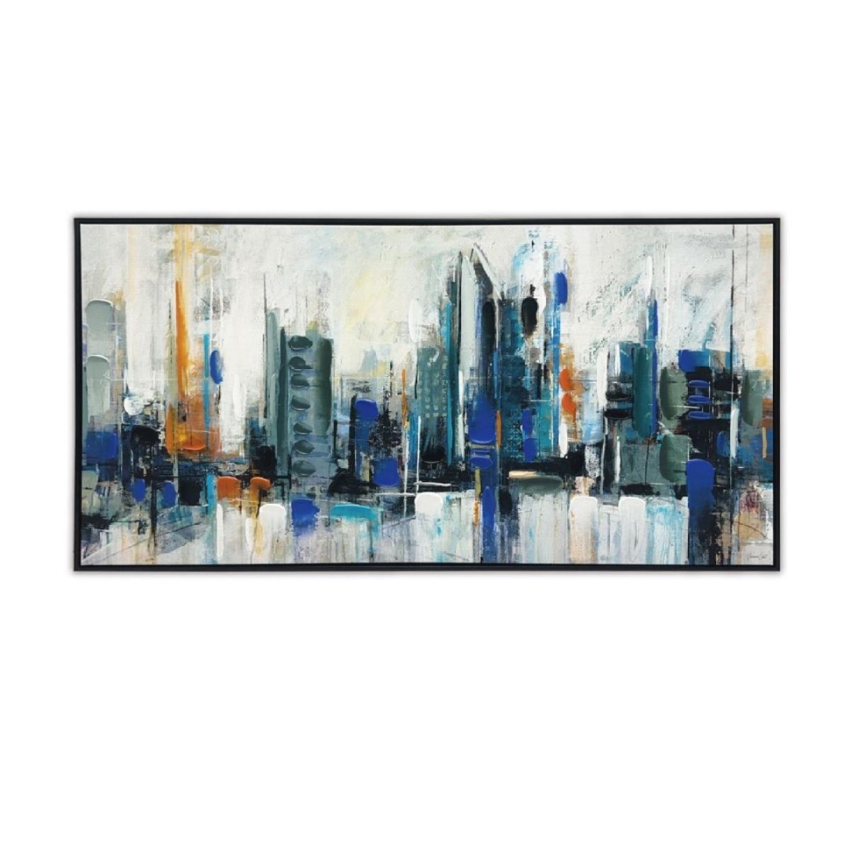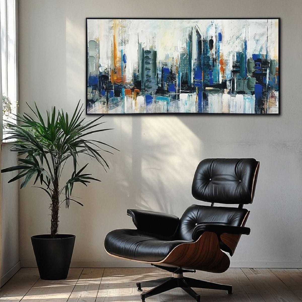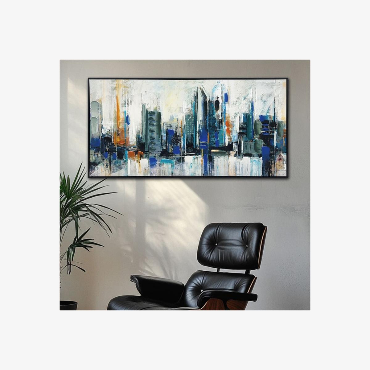 This city skyline piece makes a great focal point in contemporary or urban-inspired interiors thanks to its bold, abstract design and vibrant colour palette. It works especially well in living rooms, home offices, or bedrooms with neutral tones, adding a splash of energy without overwhelming the space. For styling tip: consider pairing it with minimalistic furniture and accentuating with metallic or glass accessories to enhance its modern vibe. Hanging it at eye level above seating areas or a console table creates impact, while a well-chosen frame adds a tailored finish. Overall, it’s a versatile piece that brings a metropolitan edge to various interior styles.