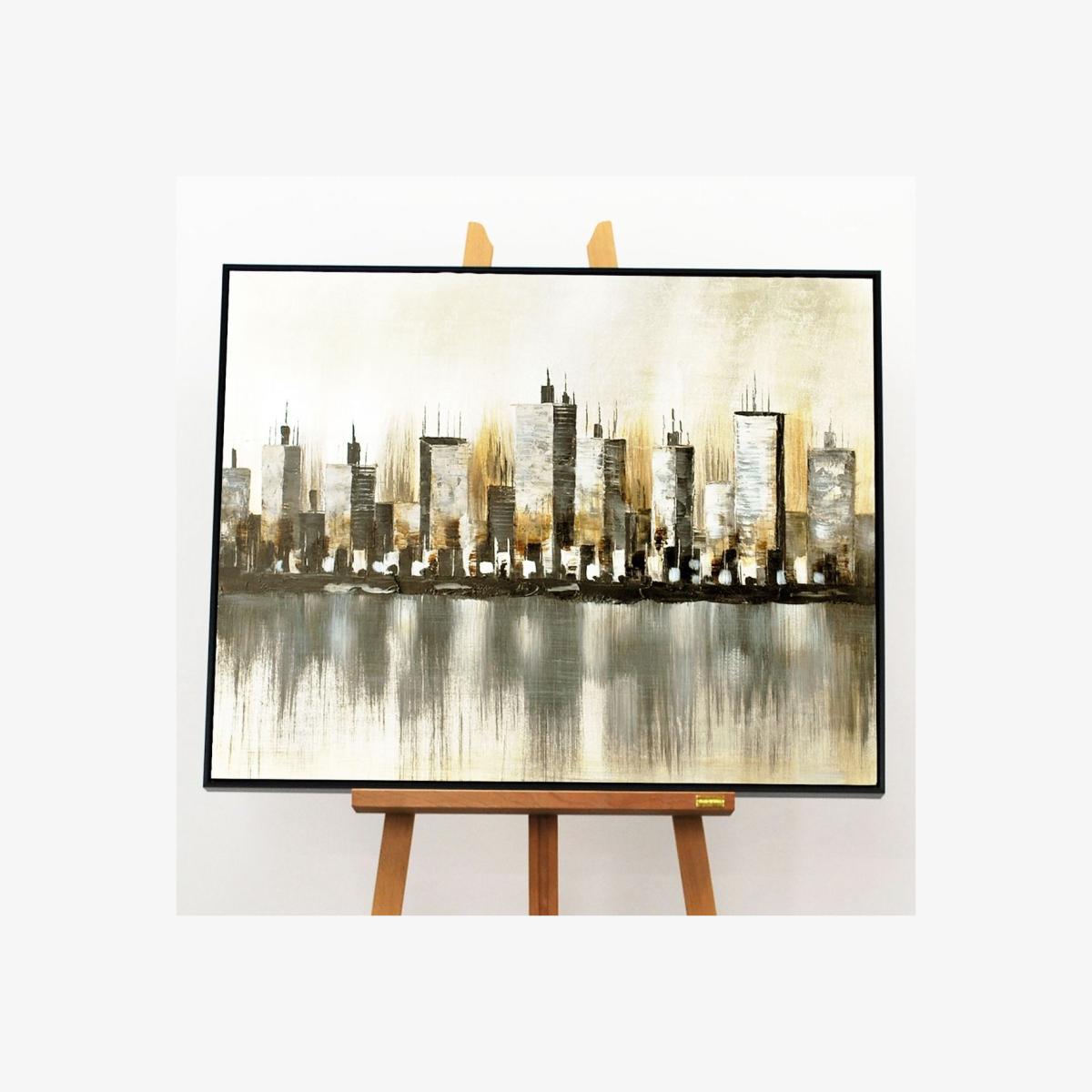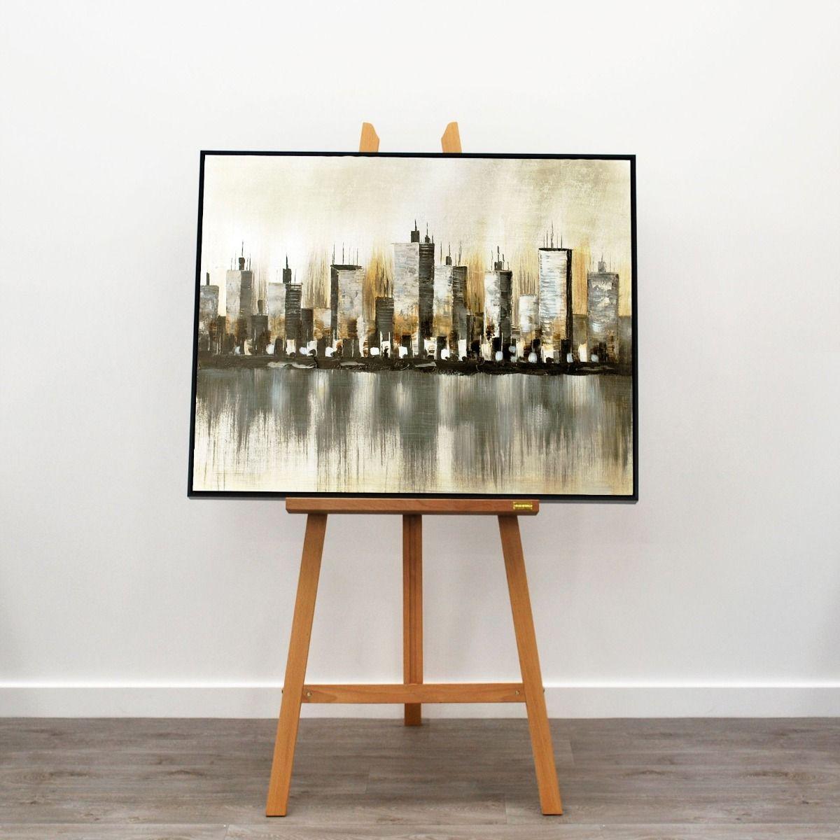 Modern skyline scene hand-painted onto canvas with a contemporary brushed silver frame. Perfect for modernising your home, this stylish piece captures a stylish view across a river onto a dazzling cityscape. An abstract, hand-painted design framed in a contemporary brushed silver frame features earthy, natural tones. A large print perfect for contemporary living areas or above bed headboards. Modern skyline scene hand-painted onto canvas with a contemporary brushed silver frame. Perfect for modernising your home, this stylish piece captures a stylish view across a river onto a dazzling cityscape. An abstract, hand-painted design framed in a contemporary brushed silver frame features earthy, natural tones. A large print perfect for contemporary living areas or above bed headboards.