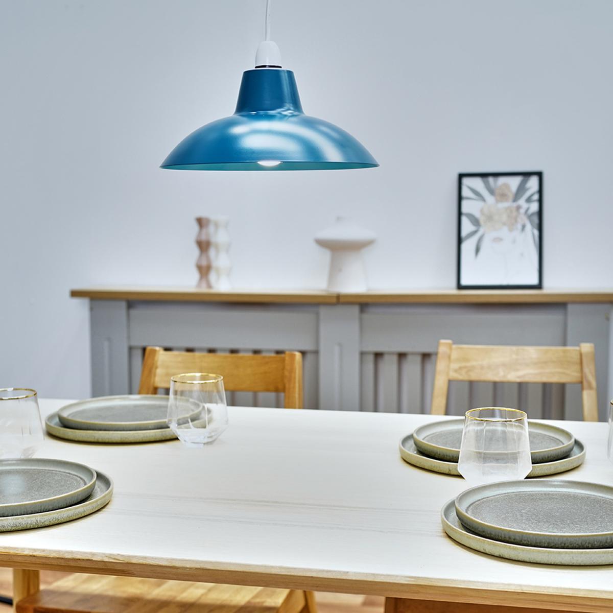 I love this pair of French blue pendants for their clean, contemporary look with a charming vintage twist. The colour works particularly well in bright, airy spaces or as a pop of colour in more neutral interiors, making them versatile for both modern and eclectic styles. Practical styling tips include hanging them at different heights for visual interest or grouping them over a kitchen island or dining table for added impact. They also complement various materials such as wood or metal perfectly, making them adaptable to different design schemes. Overall, they’re a stylish and functional choice that can elevate the look of any room with their playful yet understated appeal.