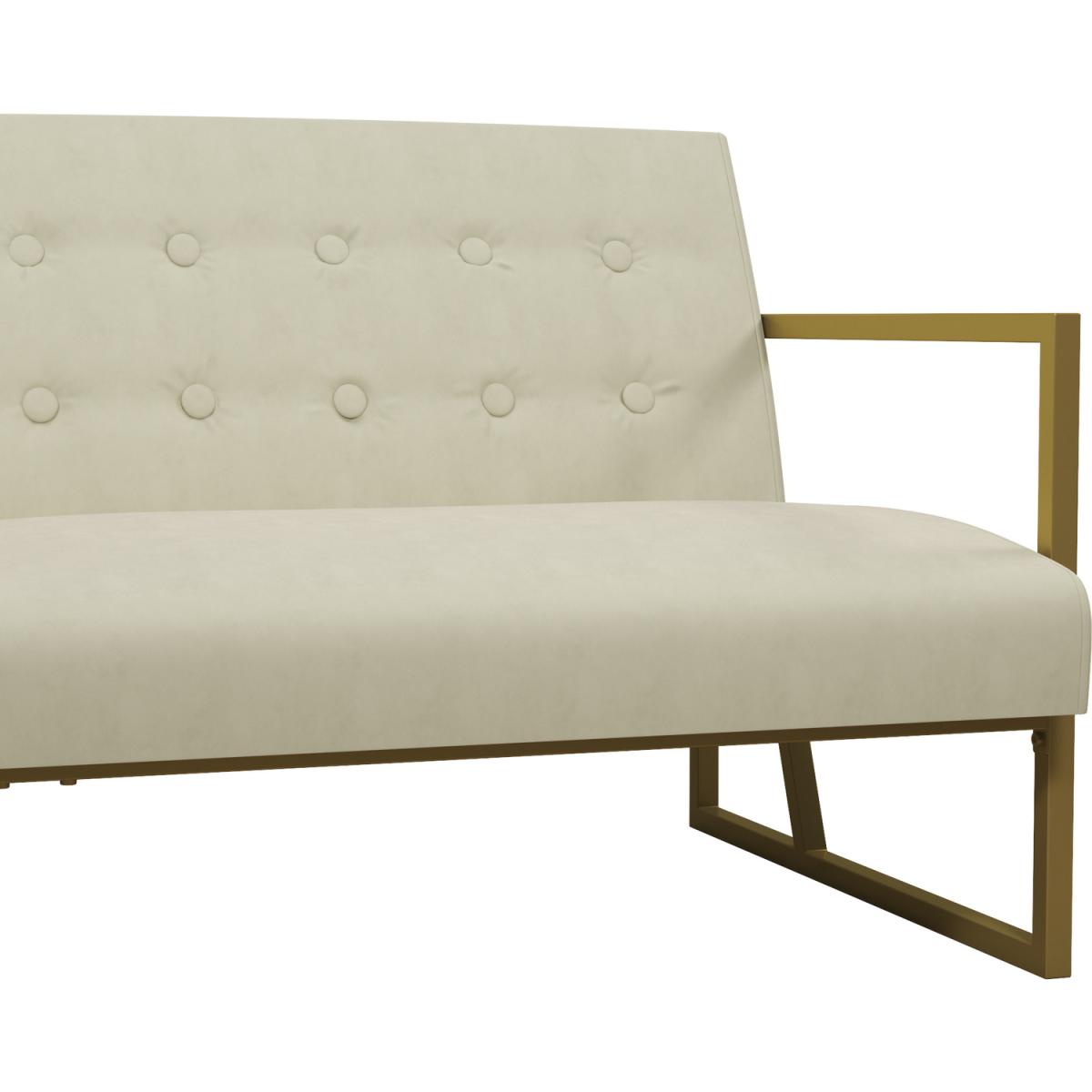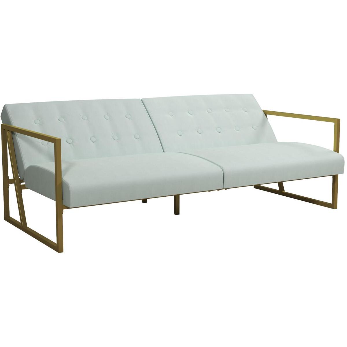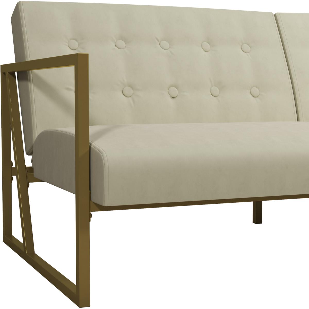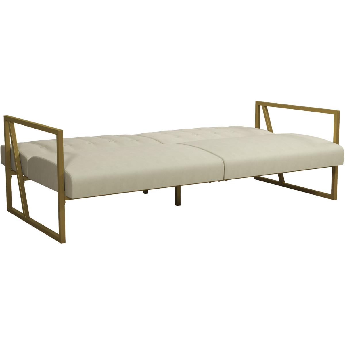 Take note the Cosmo. Living Lexington Modern Sofabed is Mid-Century design in its full glory. This sofa features a swanky gold frame and lush velvet button-tufted upholstery. It is compact and practical ideal for small spaces with a multifunctional split-back that can be reclined to kick it or lowered all the way down for overnight guests.