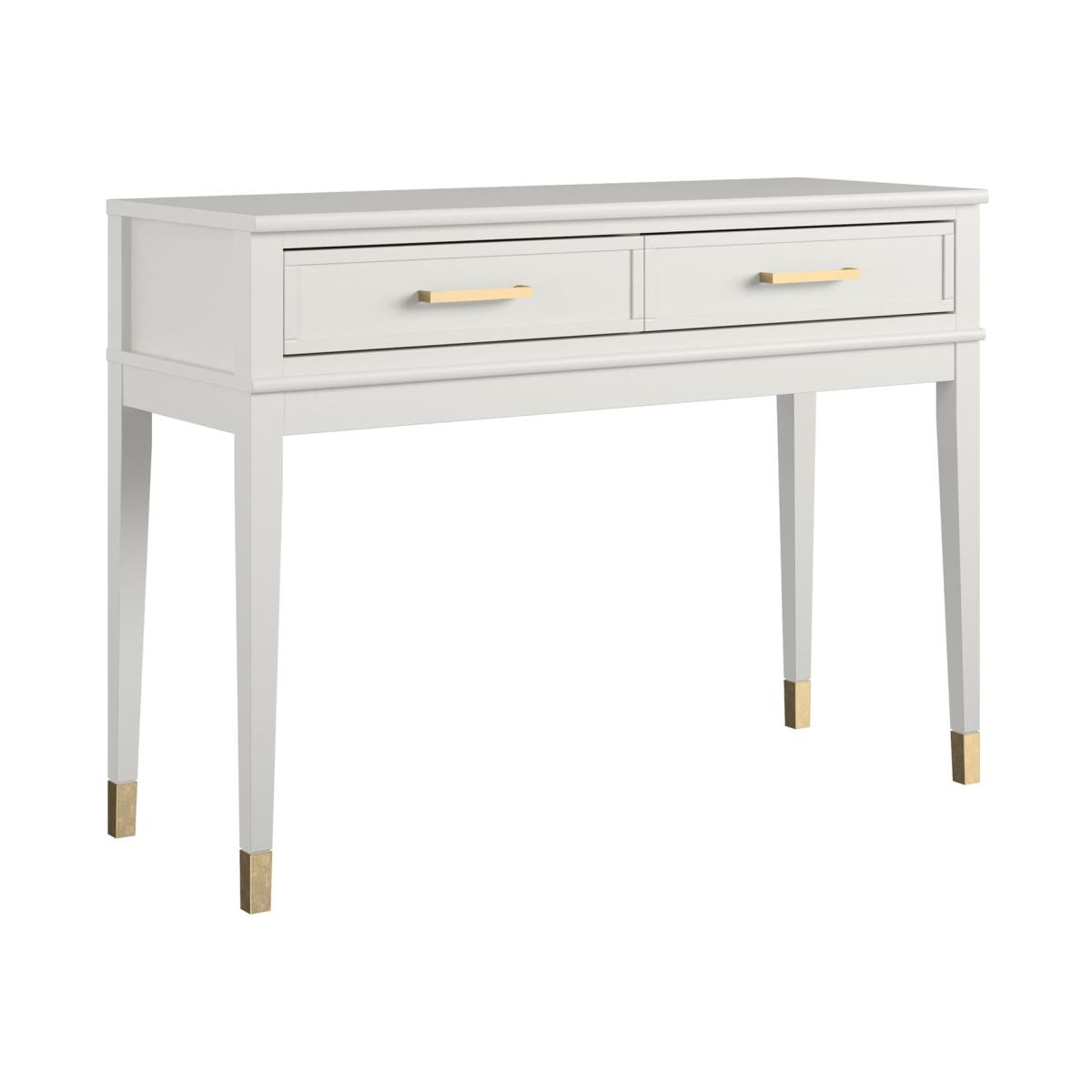 Give your living room a glow up with the Cosmo. Living by Cosmopolitan Westerleigh Console Table. Accented by trendy gold hardware and dipped feet, the Westerleigh includes two spacious drawers to hold all of your things.