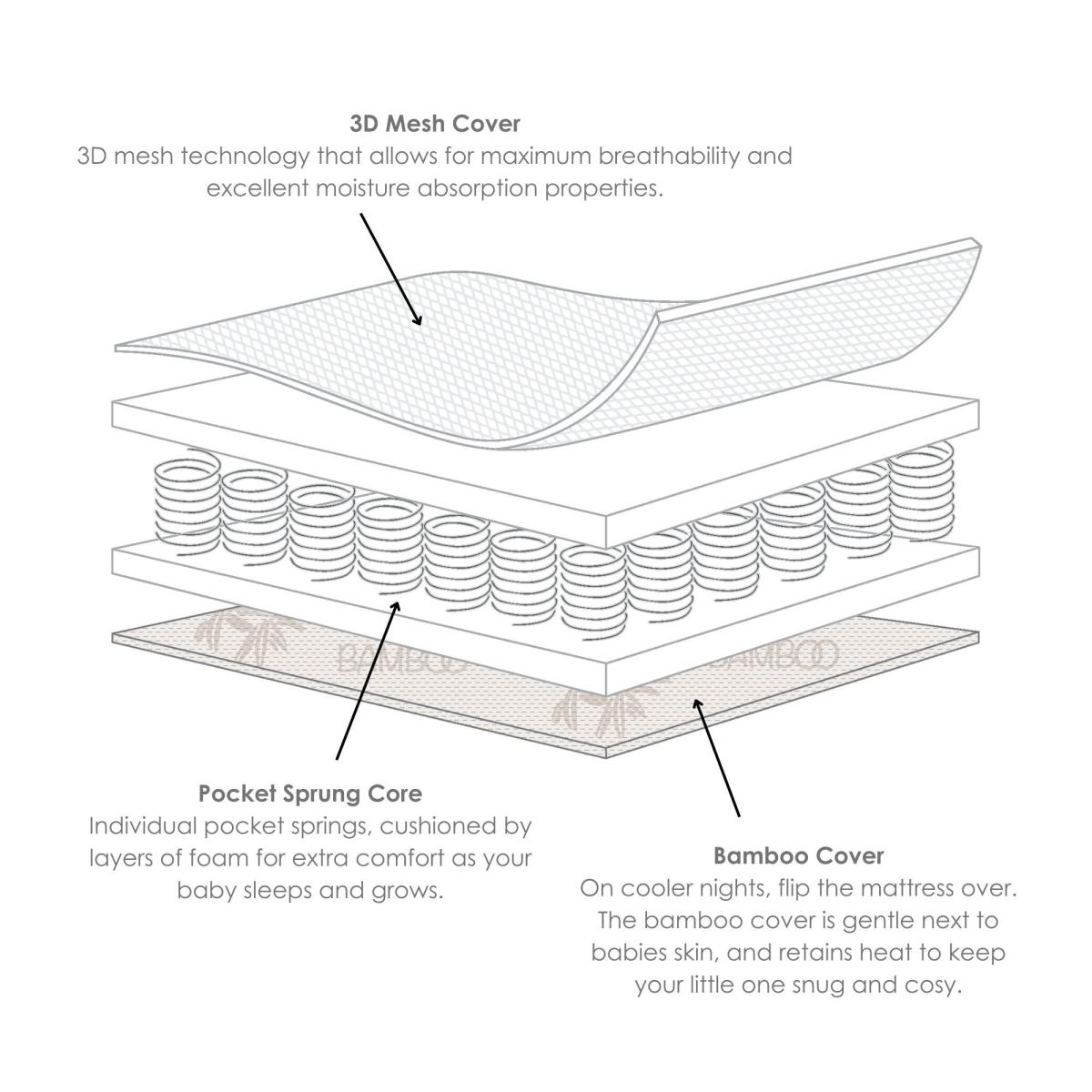 * Foam and pocket spring* Reversible* Fits most cot beds* Breathable mesh panel* Machine washable cover Ensure your little one enjoys a peaceful night’s sleep with this Hypoallergenic Foam Mattress. Designed with delicate skin in mind, the gentle foam filling provides a safe haven for babies with allergies or sensitivities. Featuring individual pocket springs, it offers tailored support that adapts as your baby grows, promoting healthy sleep. This mattress fits standard cot beds perfectly and boasts a reversible design: one side features a breathable 3D Mesh panel for summer coolness, while the bamboo-covered side keeps them warm in winter. Plus, maintaining cleanliness is a breeze with the removable, machine-washable cover. Please note we are unable to deliver this item to Northern Ireland.