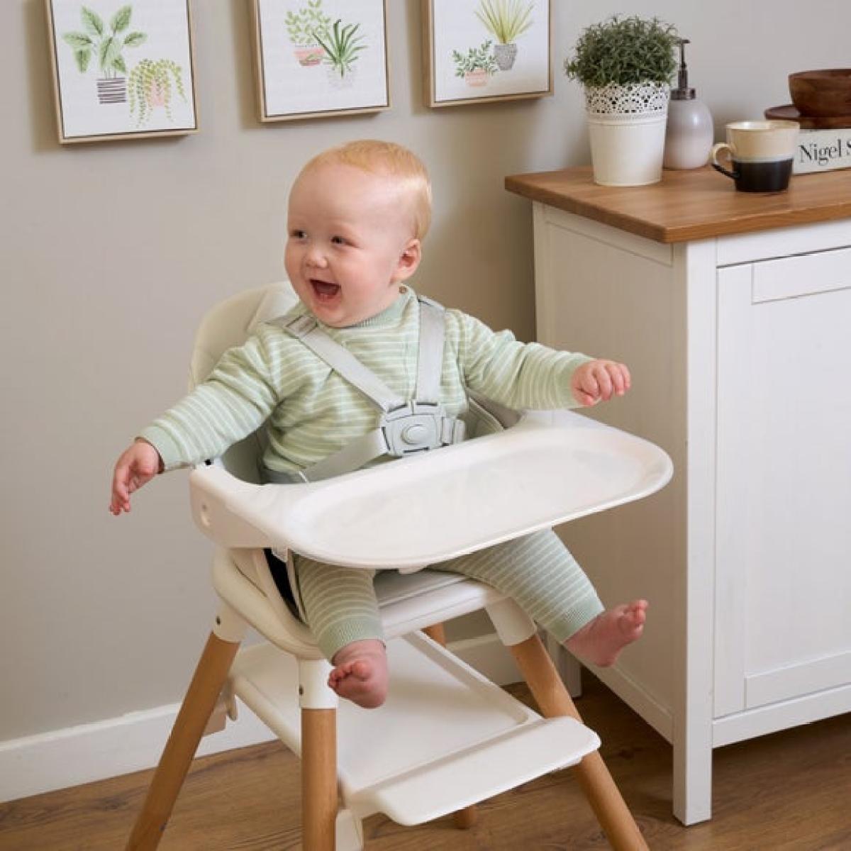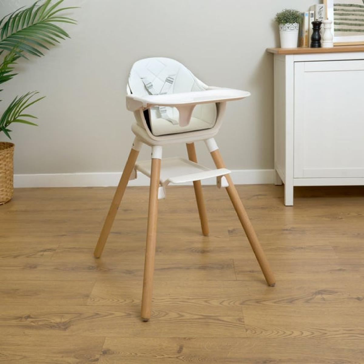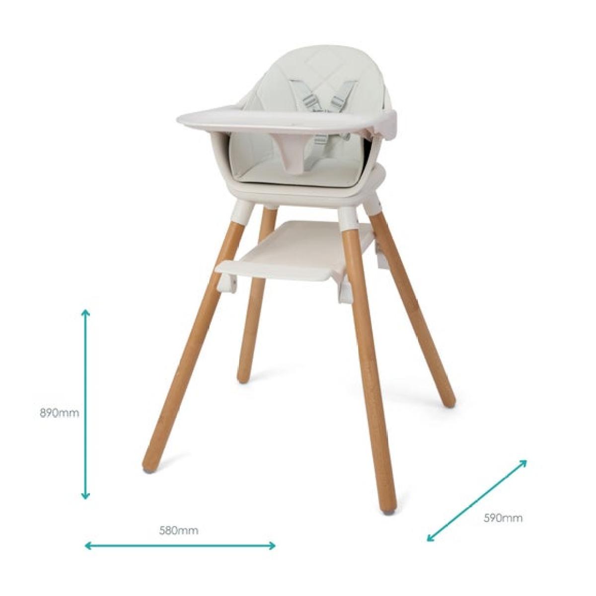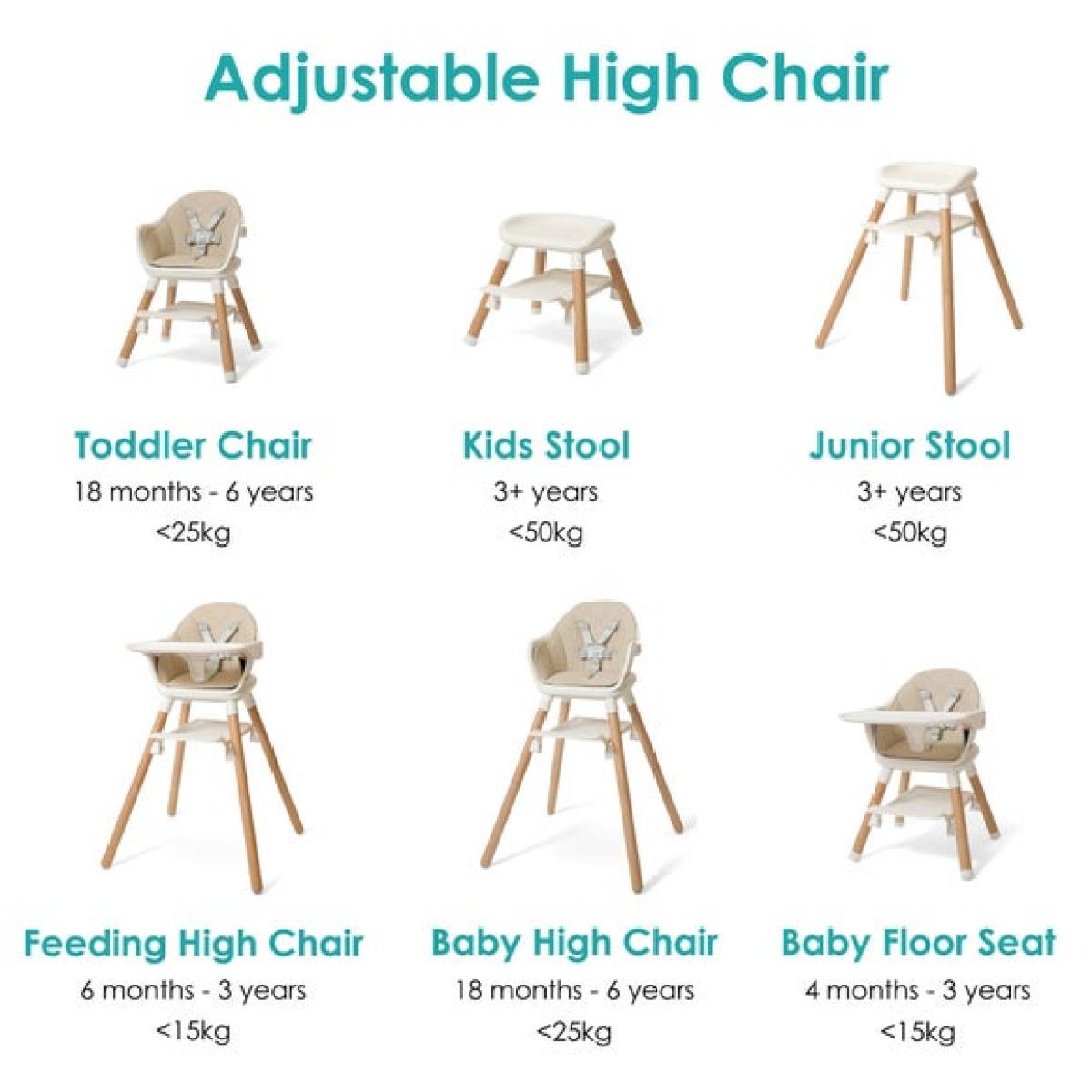 * Wooden high chair * Suitable for 6 age ranges * Faux leather seat * Wipe clean surface From first giggles to big kid breakfasts, this clever chair is designed to grow with your little one from 4 months all the way to 6 years. In the early days (around 4 to 6 months), it starts as a supportive floor seat, helping your baby sit upright and explore the world around them. As they begin weaning (typically from 6 months), it transforms into a sturdy high chair for safe, comfy mealtimes. By 18 months, it becomes a toddler chair – perfect for snack time, crafts, or story sessions. And once they hit 3 years and beyond, it cleverly converts into a junior stool, giving them a grown-up seat at the table or a perch for play.