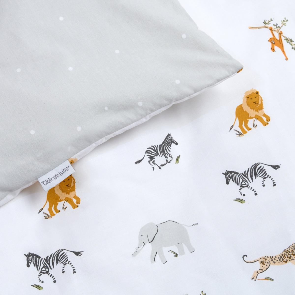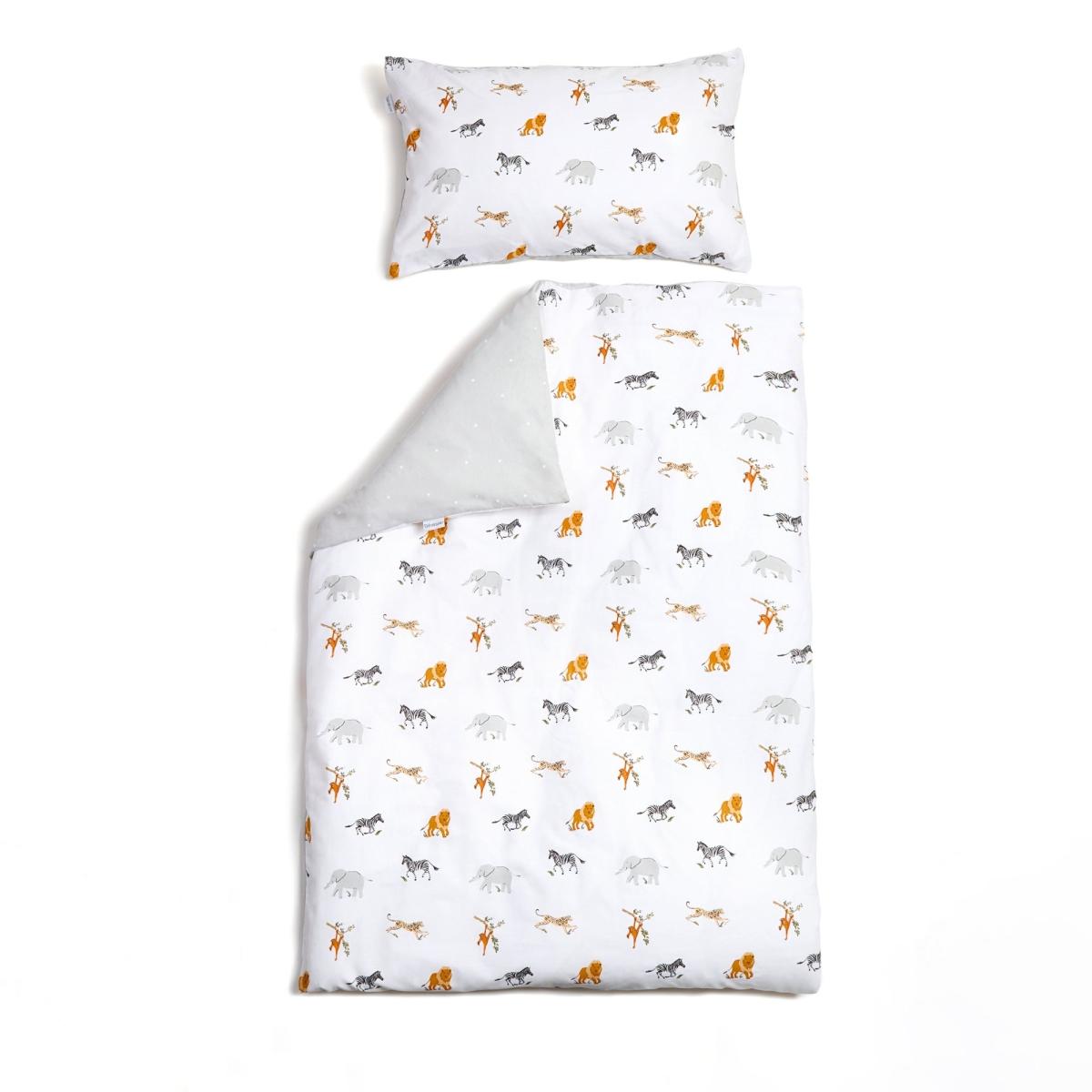 * Duvet cover and pillowcase* Fits most cot/toddler beds* Machine washable* Popper fastening Create a calm and cosy sleep space for your little one with the Jungle Dream Toddler Bedding Set. Featuring a fun, safari design on one side and a soothing grey polka dot reverse, it’s perfect for any jungle-themed bedroom. Crafted from breathable, cotton-rich fabric, this set is both durable and soft, offering comfort for your toddler and peace of mind for you. It’s fully machine washable at 40 degrees, making it easy to keep fresh and clean. Designed to fit most cot and toddler beds, this set includes a duvet cover and pillowcase for effortless style and convenience. A dreamy bedding solution for your little adventurer! Please note we are unable to deliver this item to Northern Ireland.