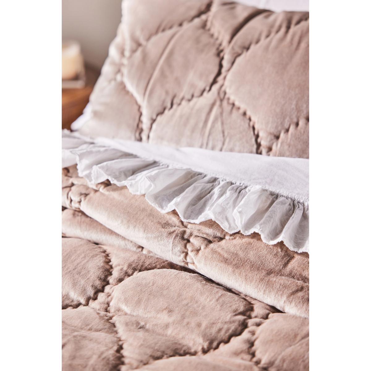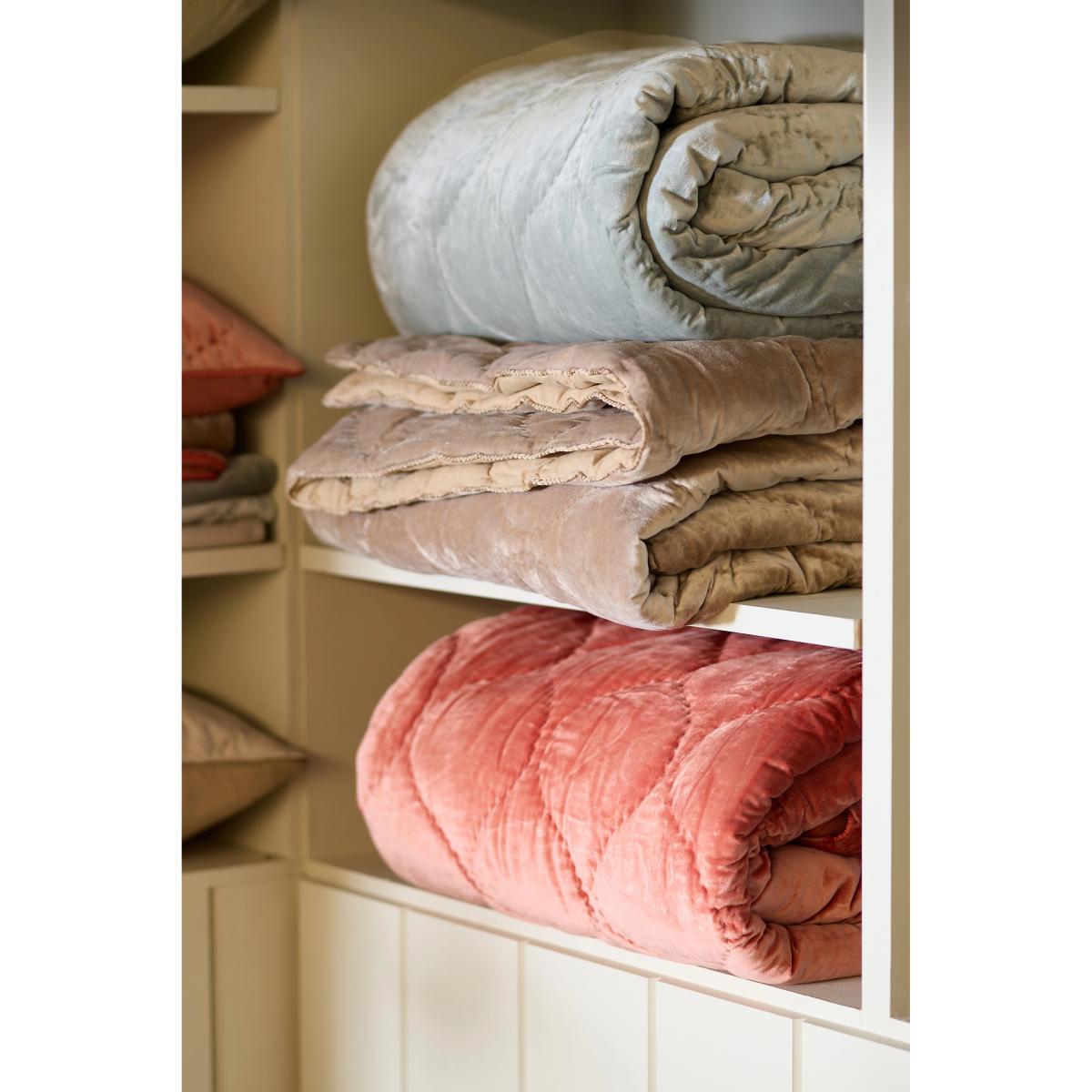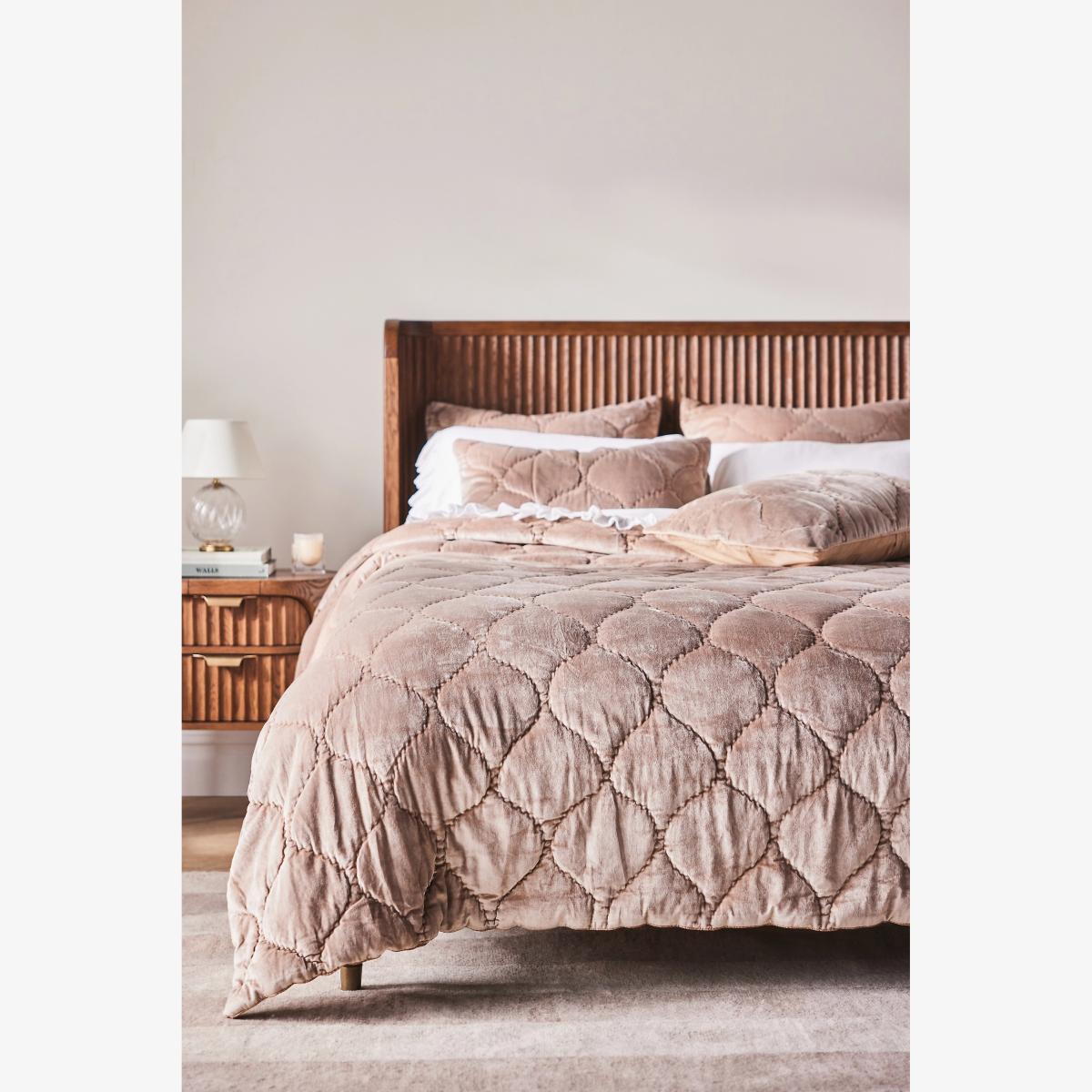 I love this bedspread for its plush cotton velvet texture combined with satin quilting, which adds a subtle sheen and gives it a luxe feel without being overly formal. It works well in both contemporary and traditional interiors, especially those with a neutral or muted colour palette, as it can add texture and interest. Practical styling tips include layering it with contrasting throws or patterned cushions to create dimension, or using it as a cosy covering for those chillier evenings. It’s an excellent piece for adding warmth and softness to a bedroom, while still maintaining a chic, streamlined look.
