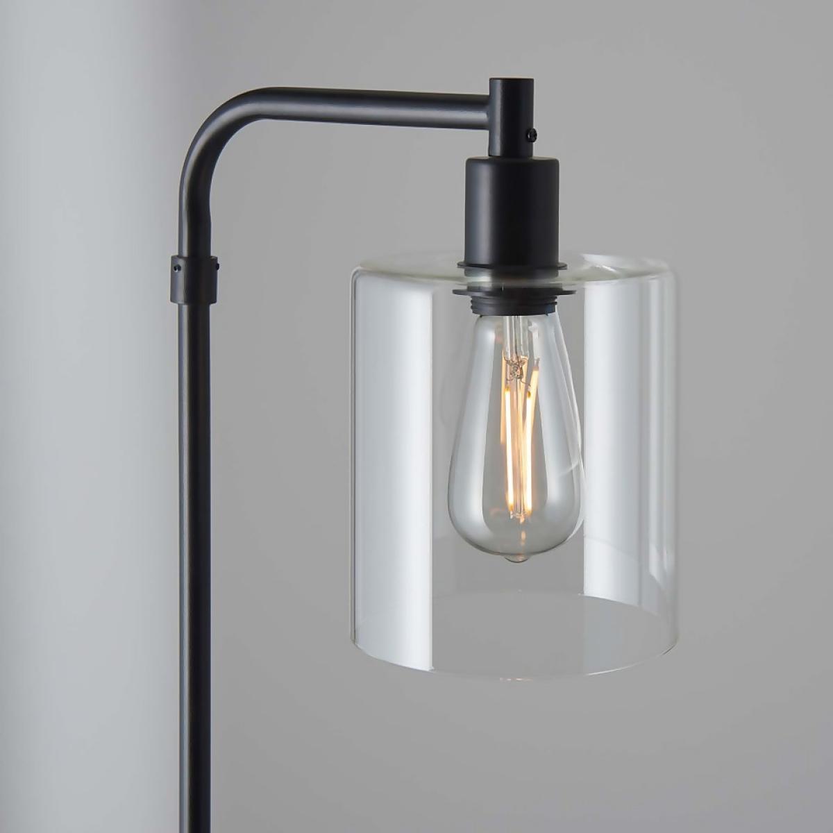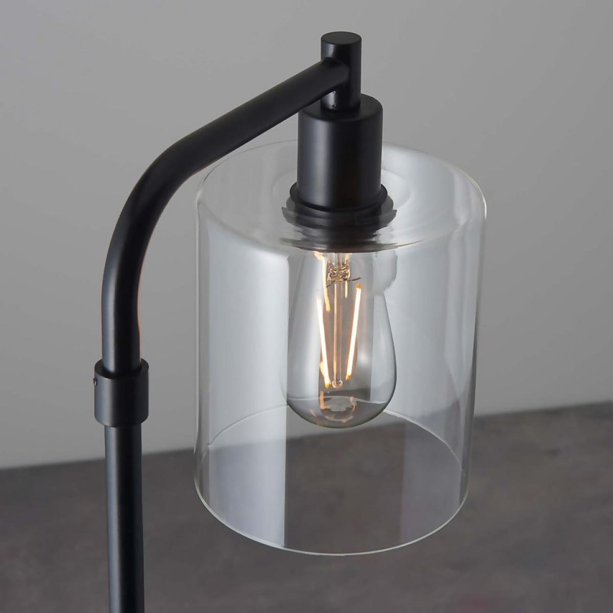 A modern floor light for contemporary interiors. Matt black painted finish with clear glass shade and inline foot switch.
