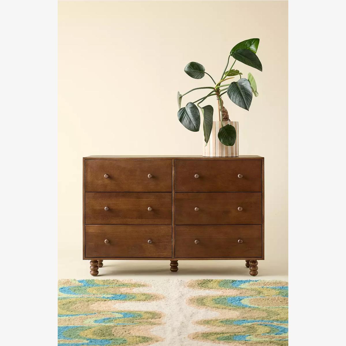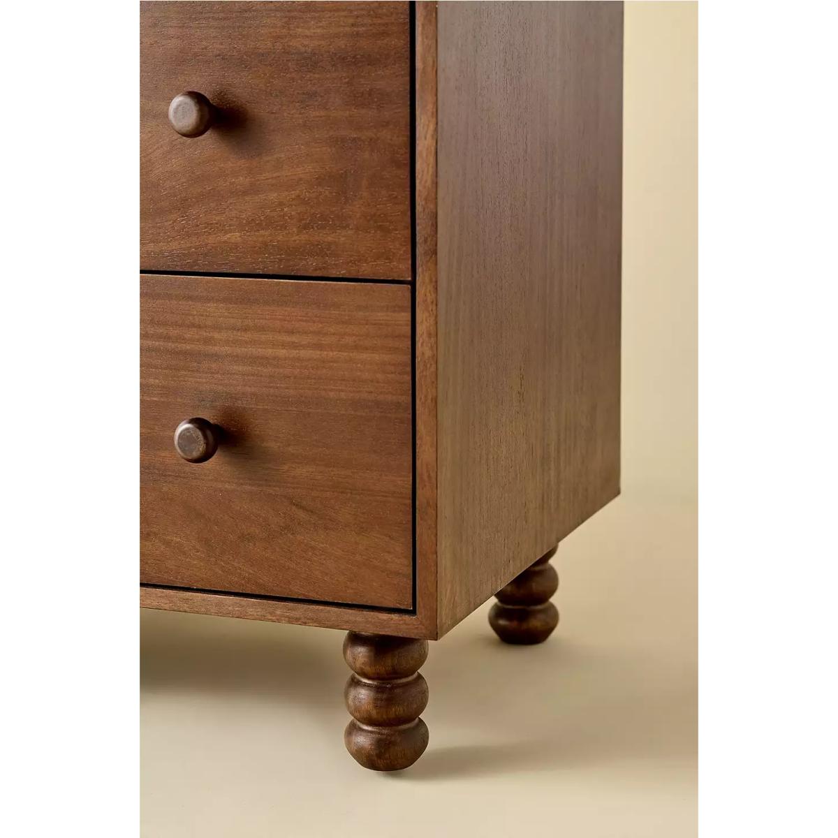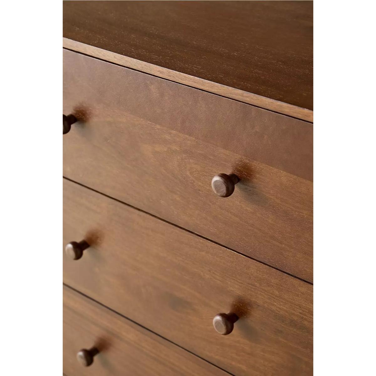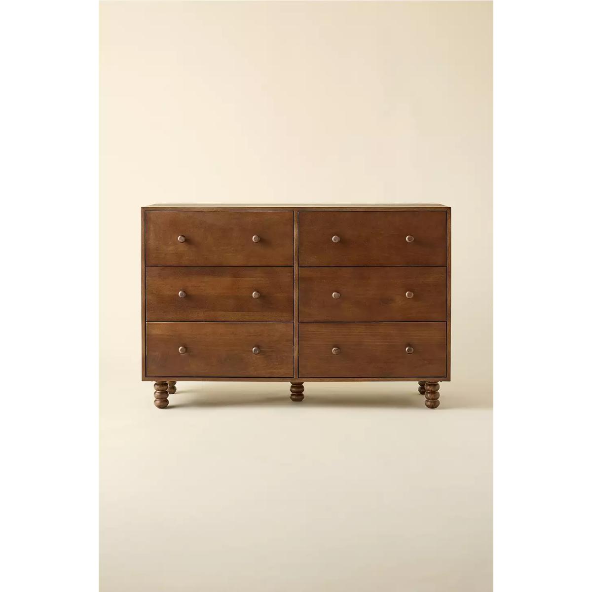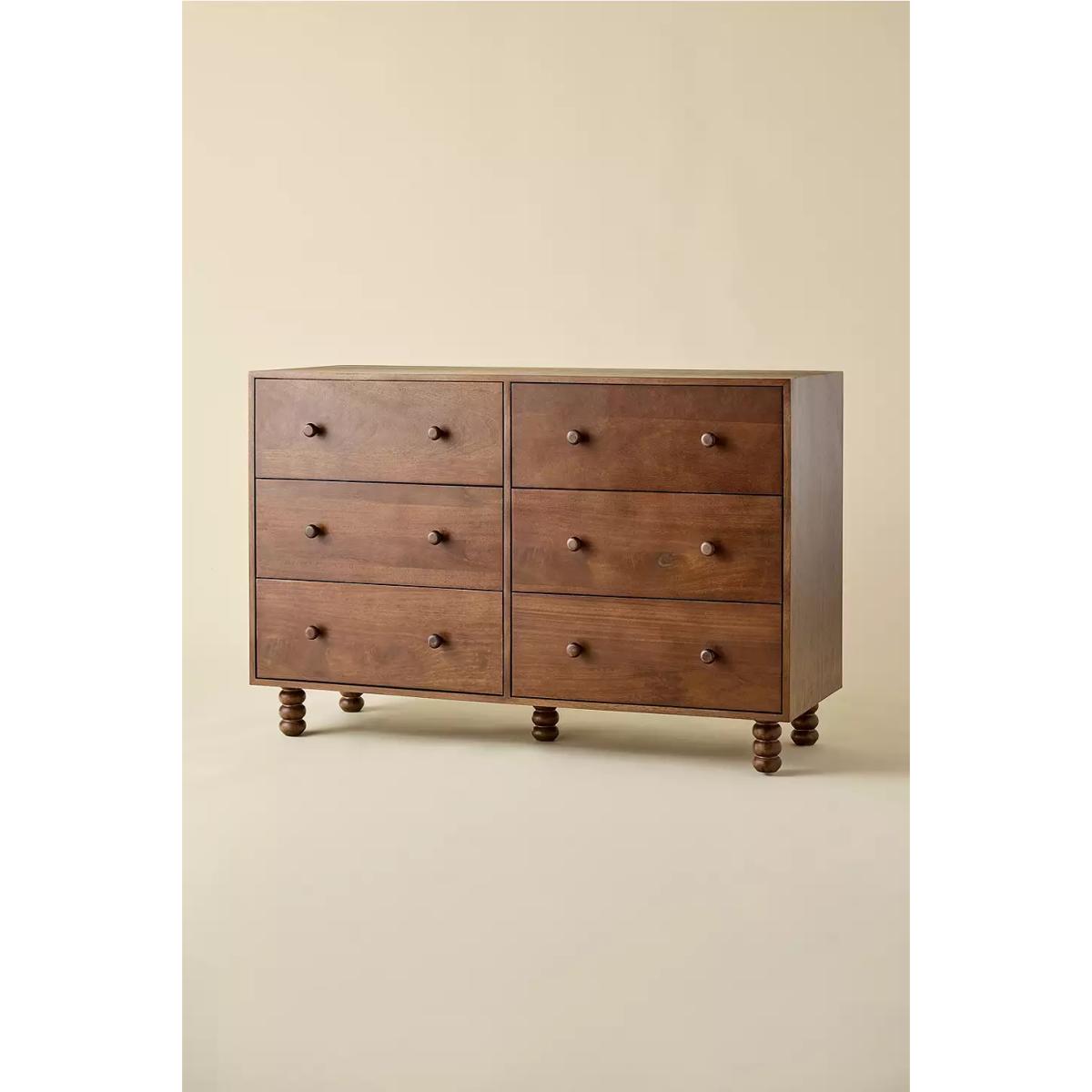 Store your clothes the mid-century way with the Clara dresser. Crafted from mango and birch wood with matching knobs. Sturdy rectangular dresser with six equal sized pull-out drawers and four bobbled legs creating a sturdy base. **Content + Care** \- MDF, Mango wood, Birch wood, Iron hardware \- Wipe clean **Size** \- Dimensions: L: 127 x W: 46 x H: 84 cm \- Leg height/Clearance: 12 cm, removable \- Drawer dimensions: L: 56 x W: 35 x H: 17 cm \- Weight limit: 10.1 lbs per drawer \- Weight: 213.8 lbs \- Shipping package dimensions: L: 137 x W: 56 x H: 81 cm \- Shipping package weight: 231 lbs
