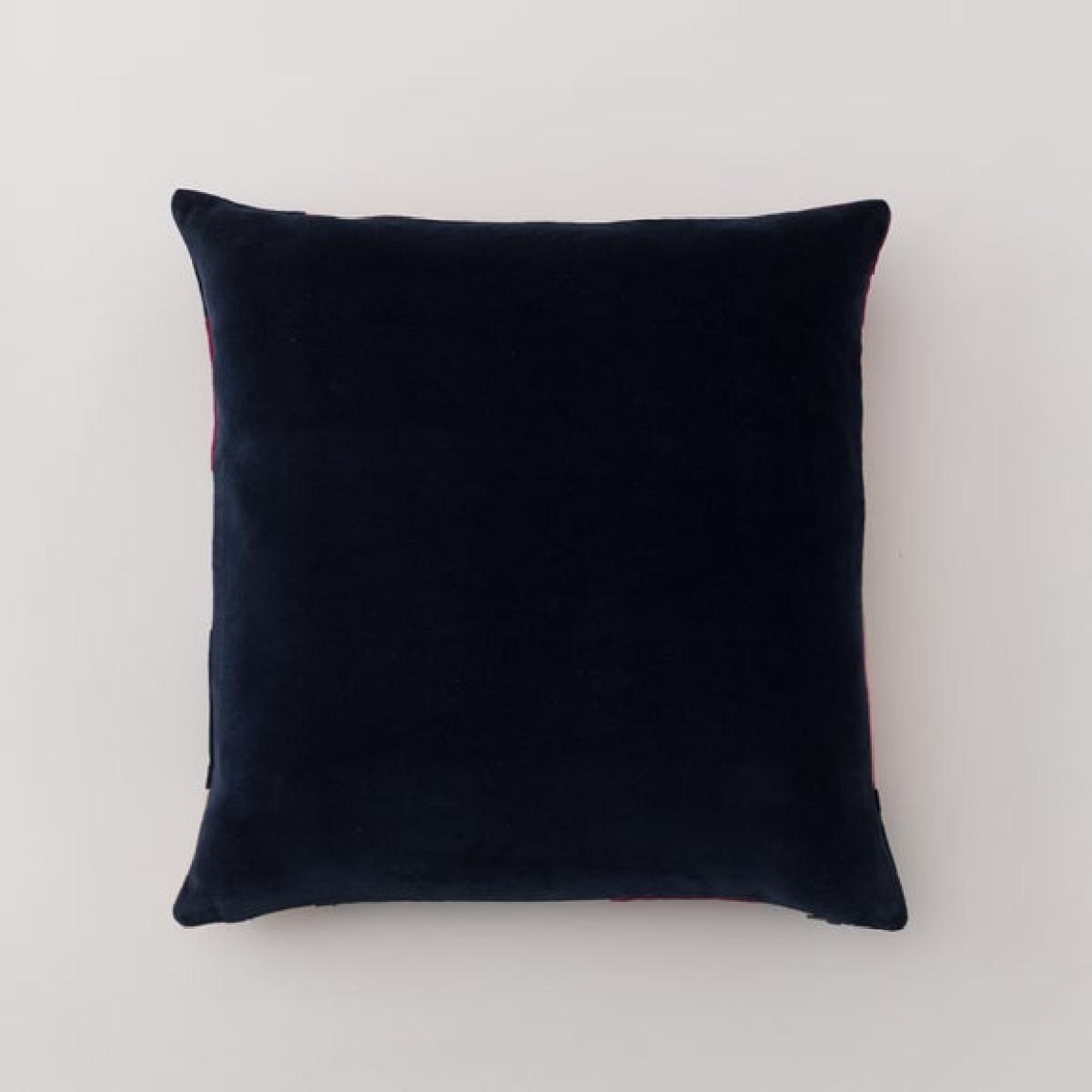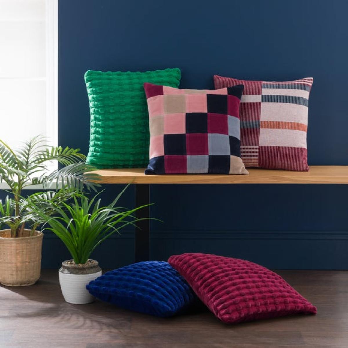 * Modern patchwork design * Plump Filling * Piped Edge Detailing * Cotton Velvet Fabric * Machine Washable Cover Add artistic flair and plush comfort to your interior with the Clara Cubed Patchwork Cushion. This eye-catching square cushion features a bold checkerboard design made from individually stitched panels of cotton velvet in rich red and inky blue tones. The luxurious texture and harmonious colour contrast create a statement piece that’s as stylish as it is inviting. Finished with refined piped edging and a plain reverse for versatile styling, this cushion comes with a feather-filled insert for supreme comfort. The removable cover is machine washable for easy care. Layer with other Clara cushions in complementary shades to create a vibrant, cohesive arrangement.