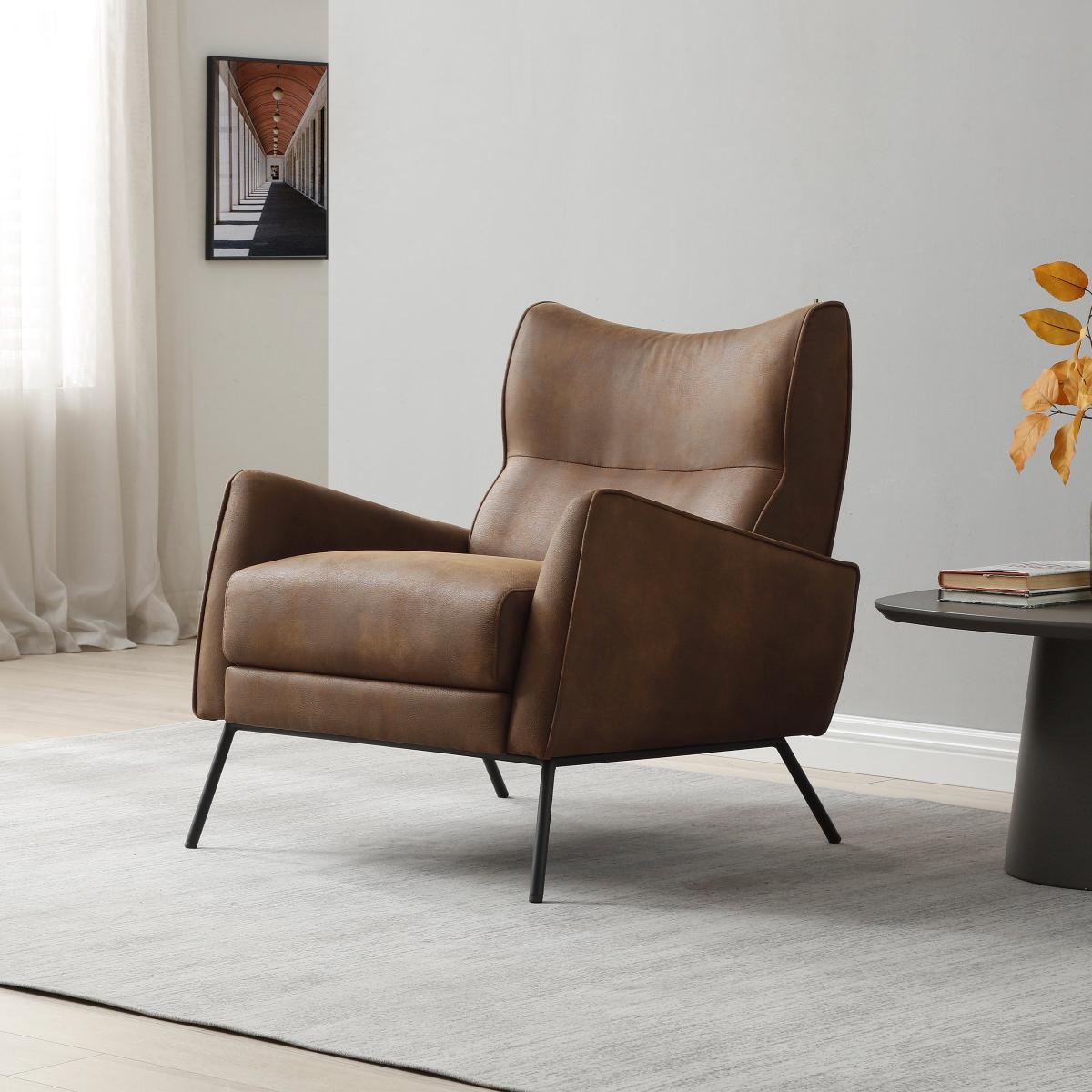 This armchair’s faux leather in a warm tan adds a touch of contemporary sophistication, making it a versatile piece for a variety of interiors. I love how its clean lines and minimalist design work well in both modern and mid-century inspired spaces. It’s a practical choice for living rooms, studies, or bedrooms - the faux leather is easy to clean and resilient. For styling, consider pairing it with textured cushions or a cosy throw to soften the sleek look, and place it near a side table or lamp to create an inviting reading nook. This chair’s neutral tone also makes it a flexible foundation to build colour accents around, from bold cushions to patterned rugs.
