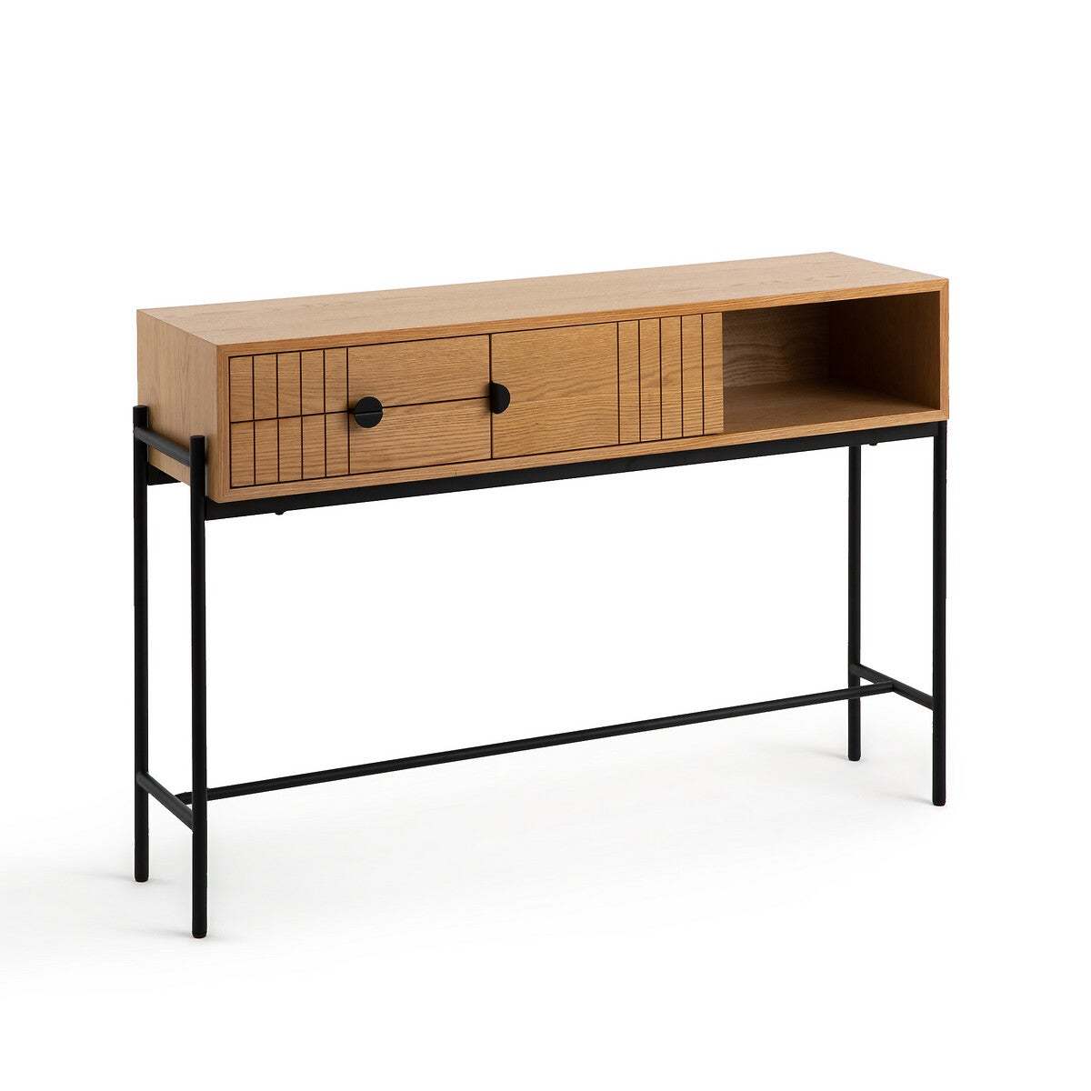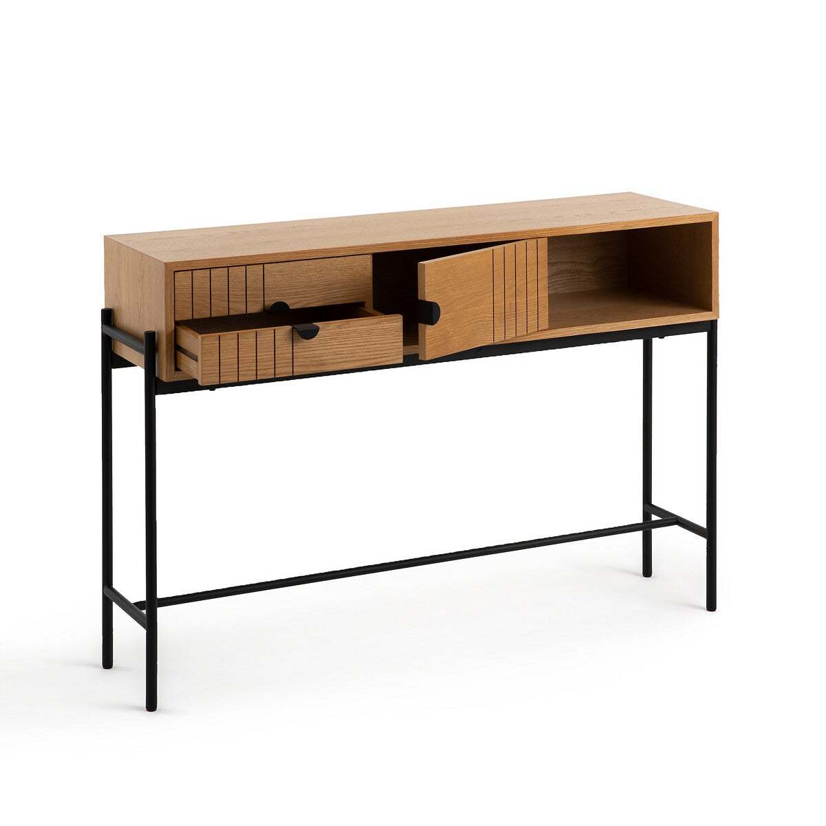 Clara oak console table with storage. This console offers you additional well thought-out storage, perfect for storing and protecting small objects. You'll love the combination of wood and metal in its contemporary design.