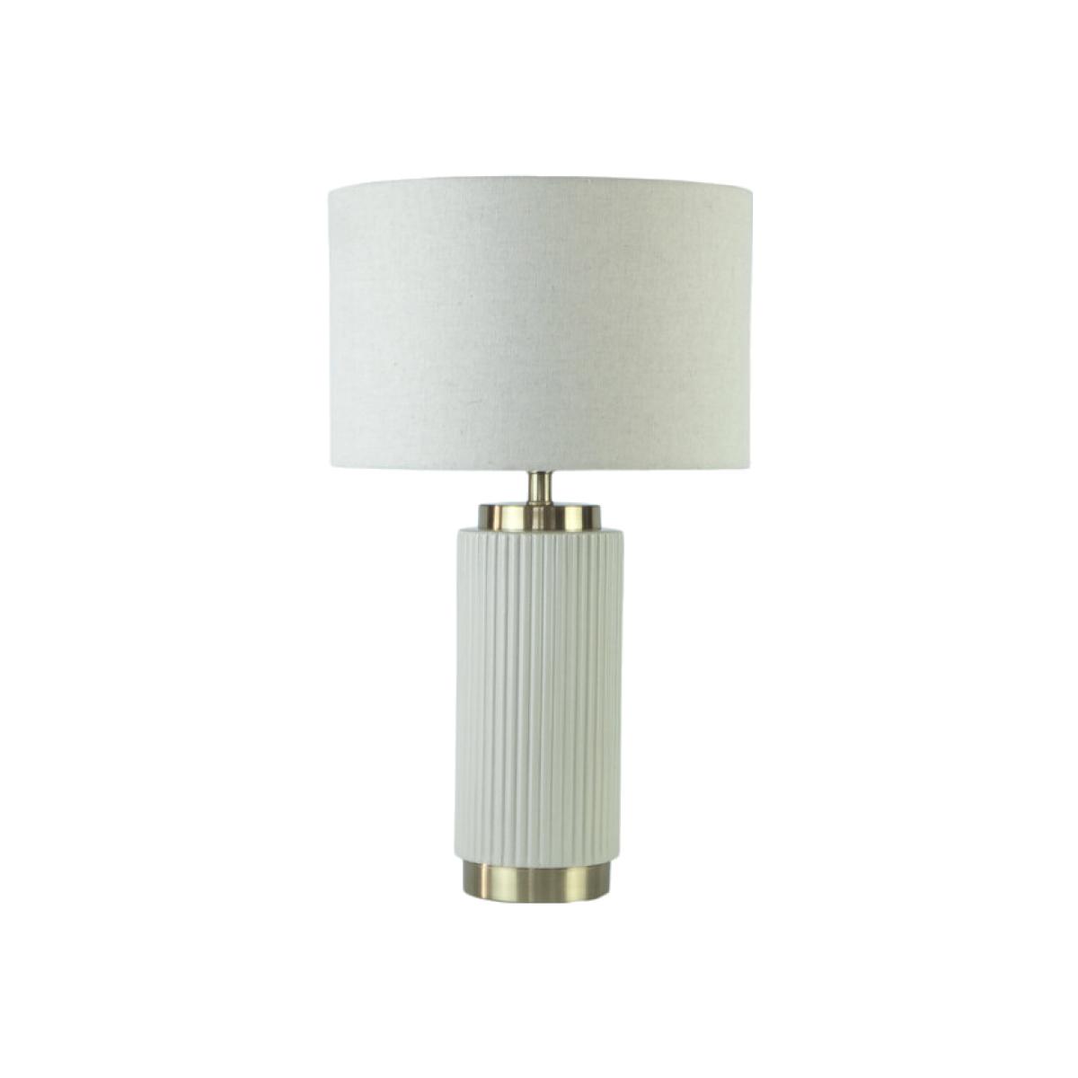 The Clara Table Lamp is a simple yet sophisticated light that will add some class to your home as well as illuminating your room. The white ceramic base features metallic gold caps on the bottom and top, above which a large shade brings an entirely modern finish. This lamp is perfect for a living room or bedroom, where it can cast a glow about your space in the evenings.