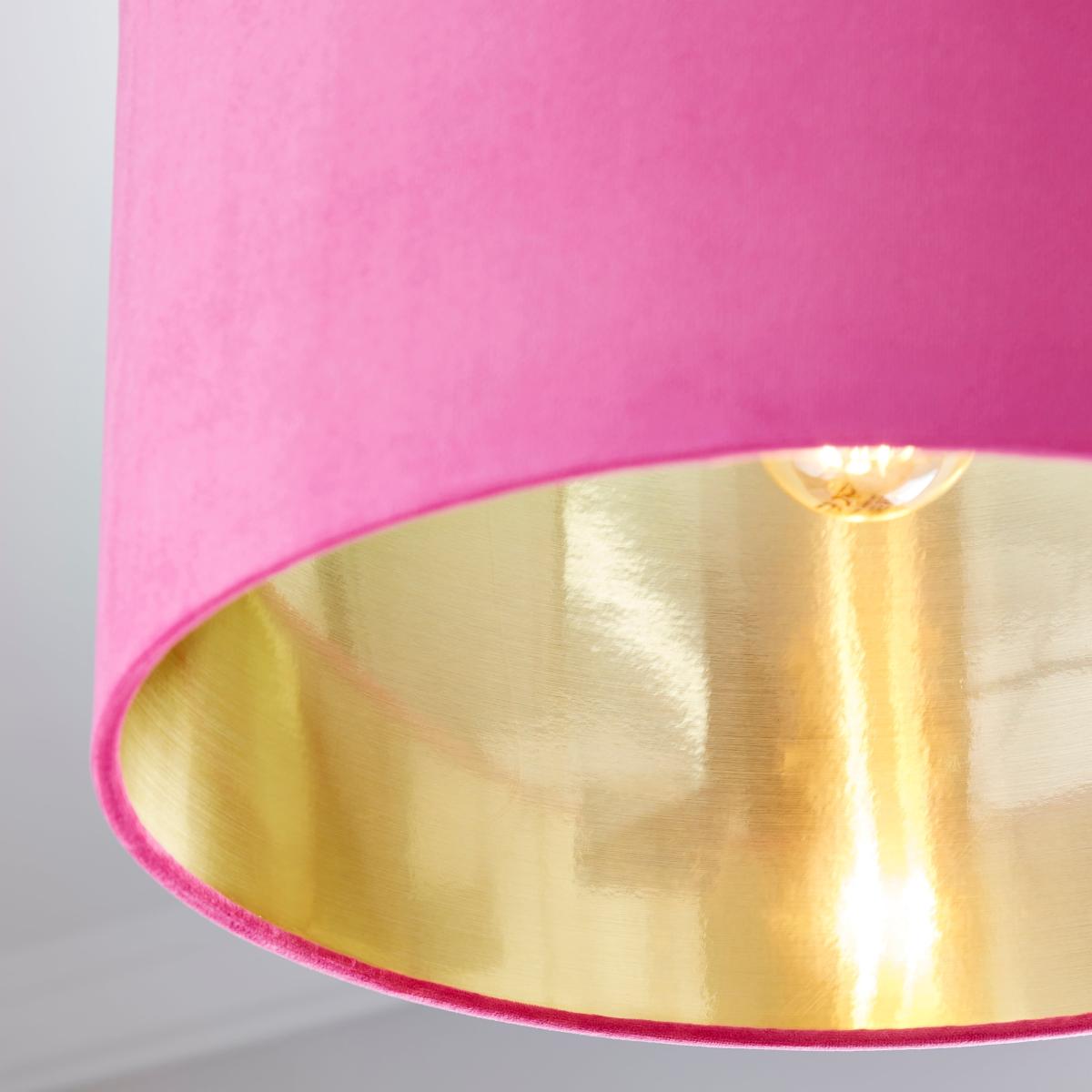 The fuchsia velvet drum lamp shade is a bold and contemporary choice that instantly adds colour and texture to any room. I love how its rich velvet finish introduces a touch of luxury while the vivid hue makes it a statement piece. It works exceptionally well in modern, eclectic, or even glamorous interiors, particularly when paired with brass or gold accents. For styling, consider keeping surrounding decor neutral to let the shade stand out, or pair with darker furnishings for a dramatic effect. It’s practical too - the drum shape offers a wide, even light dispersion that’s perfect for living rooms or bedrooms wanting a centrepiece that’s both functional and stylish.