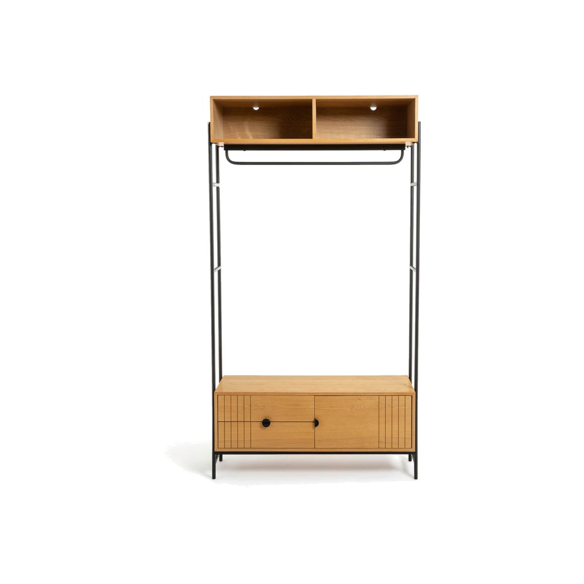 I love this wardrobe for its sleek, minimalist design that works particularly well in modern or contemporary interiors. Its open and airy structure makes it ideal for bedrooms with a relaxed, clutter-free aesthetic, or even in a stylish walk-in wardrobe. The combination of wood and metal creates a versatile look that can be paired with both natural textures and more industrial elements. Practical styling tips include adding woven baskets or fabric bins in the storage compartments for organisation, and using hooks or slim hangers on the rail to keep things tidy. This piece works well in smaller spaces too, as its open design prevents it from feeling bulky, while still providing essential storage.