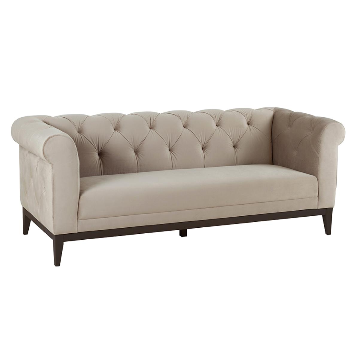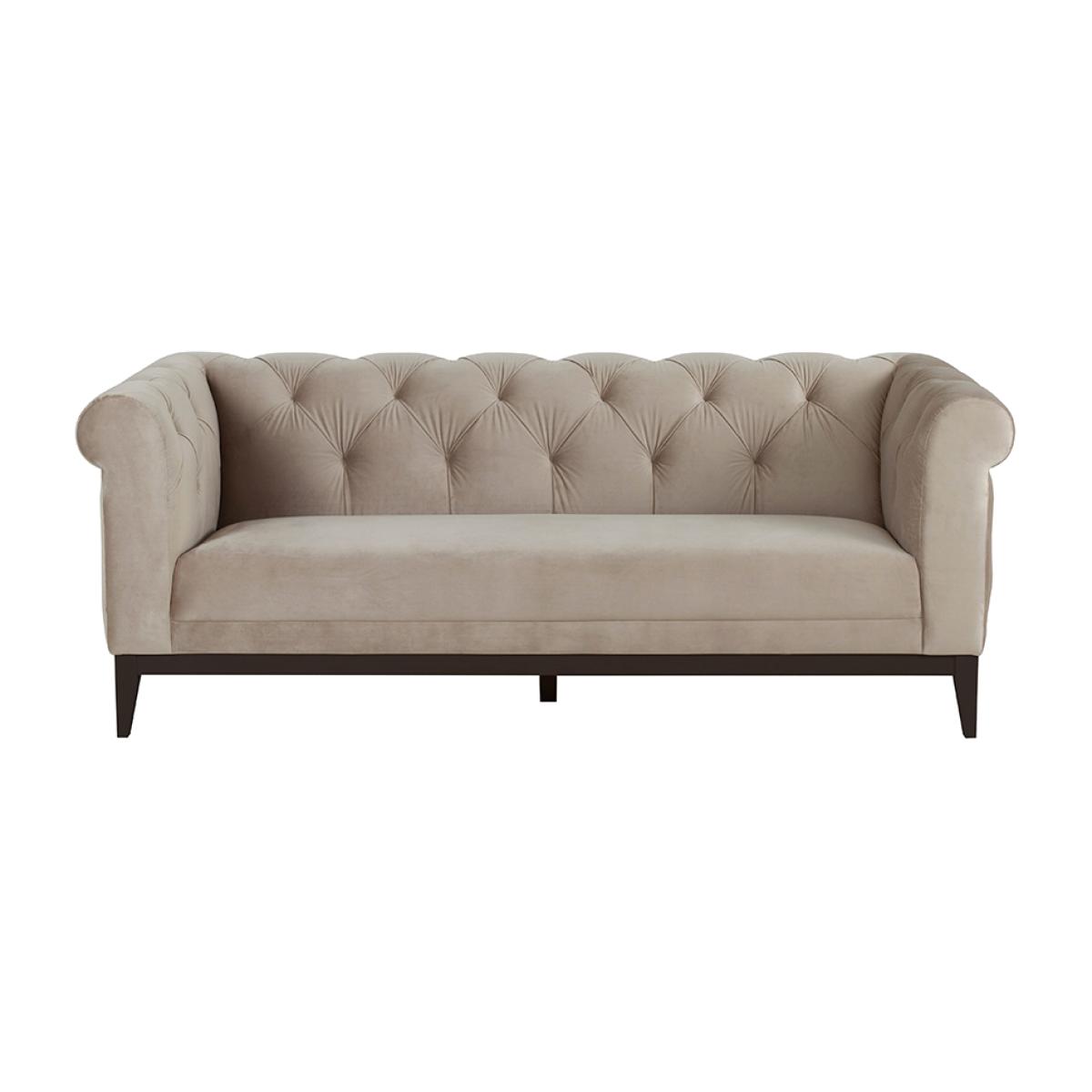 Contemporary buttoned sofa with fixed seat and backrest. Generous, deep foam and fibre filling. Sprung seat and backrest. Solid ash frame with black stain. Velvet upholstery fabric. Free returns on sofas if you change your mind within 7 days. Simply notify us, put the sofa back in the box, and we will collect and send you a full refund. (This offer excludes Scottish highlands and islands & any Ireland addresses).