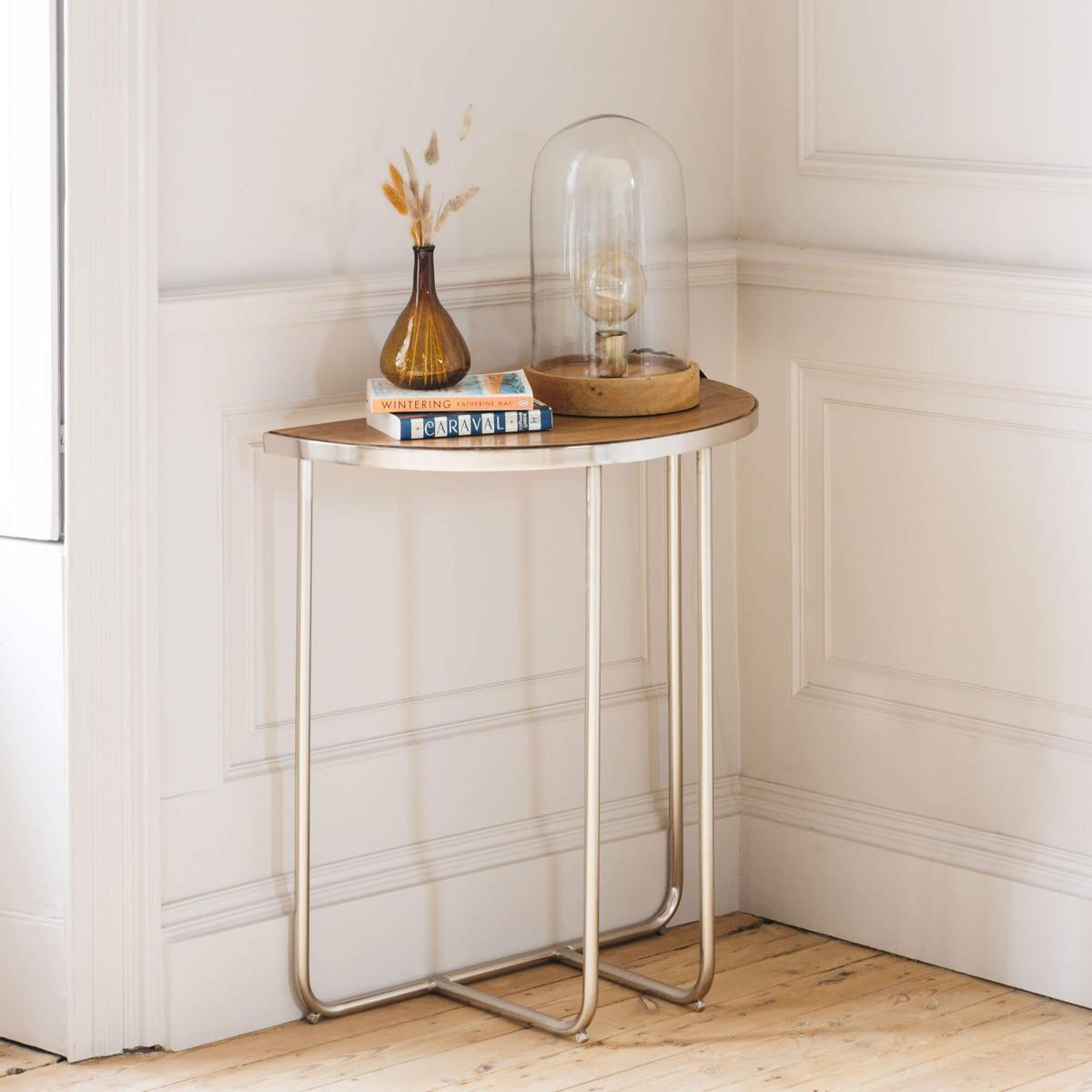 Crafted from mango wood with an industrial pipework frame, the Clarence Side Table features a moon shape to settle against a sofa or as a downsized console table for smaller spaces.