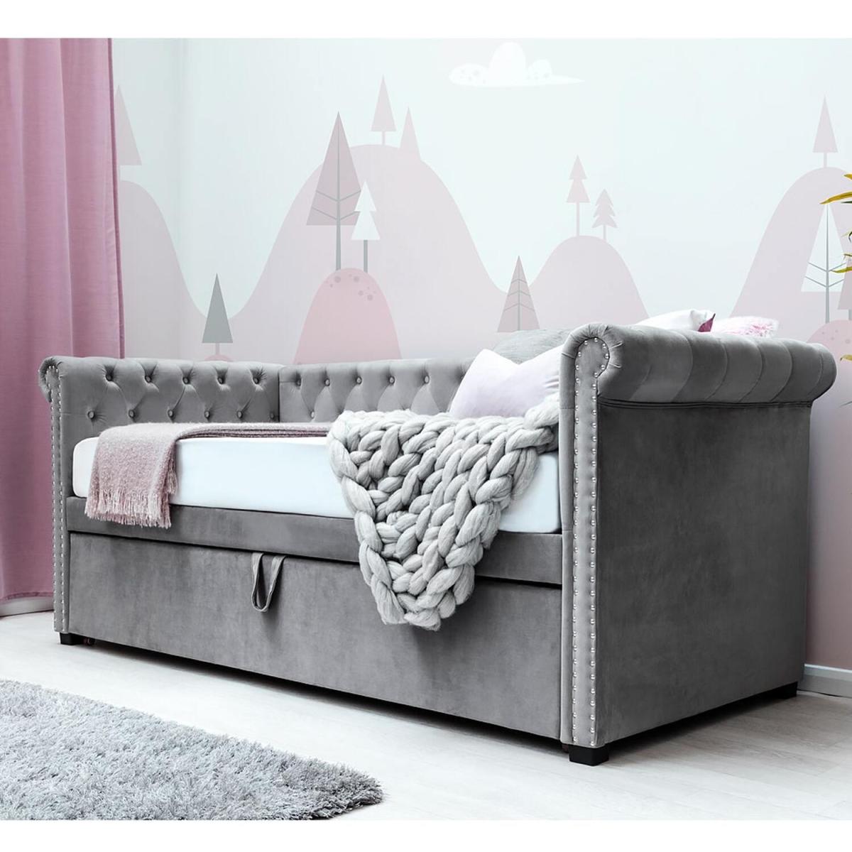 Inspired by the classic Chesterfield sofa design, we bring you our Clarendon day bed frame. Mirroring the iconic Chesterfield design, the bed features scroll armrests with silver nail head detailing, as well as hand tufting and buttoning which extends across the backrest. The clever design of this bed means it looks the part of a sofa, whilst the seating area is the same size as a UK single bed. It also features a pull out drawer, which again fits a UK standard single size mattress (3ft). You have the option to either use it as a storage drawer or a second sleeping area. This design means it is ideal for spare rooms, or in the main living area of an apartment or flat.