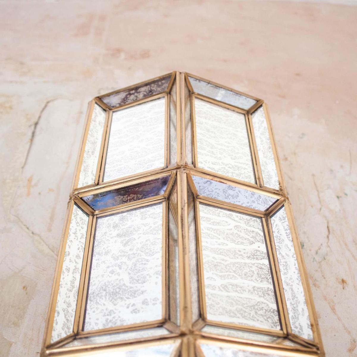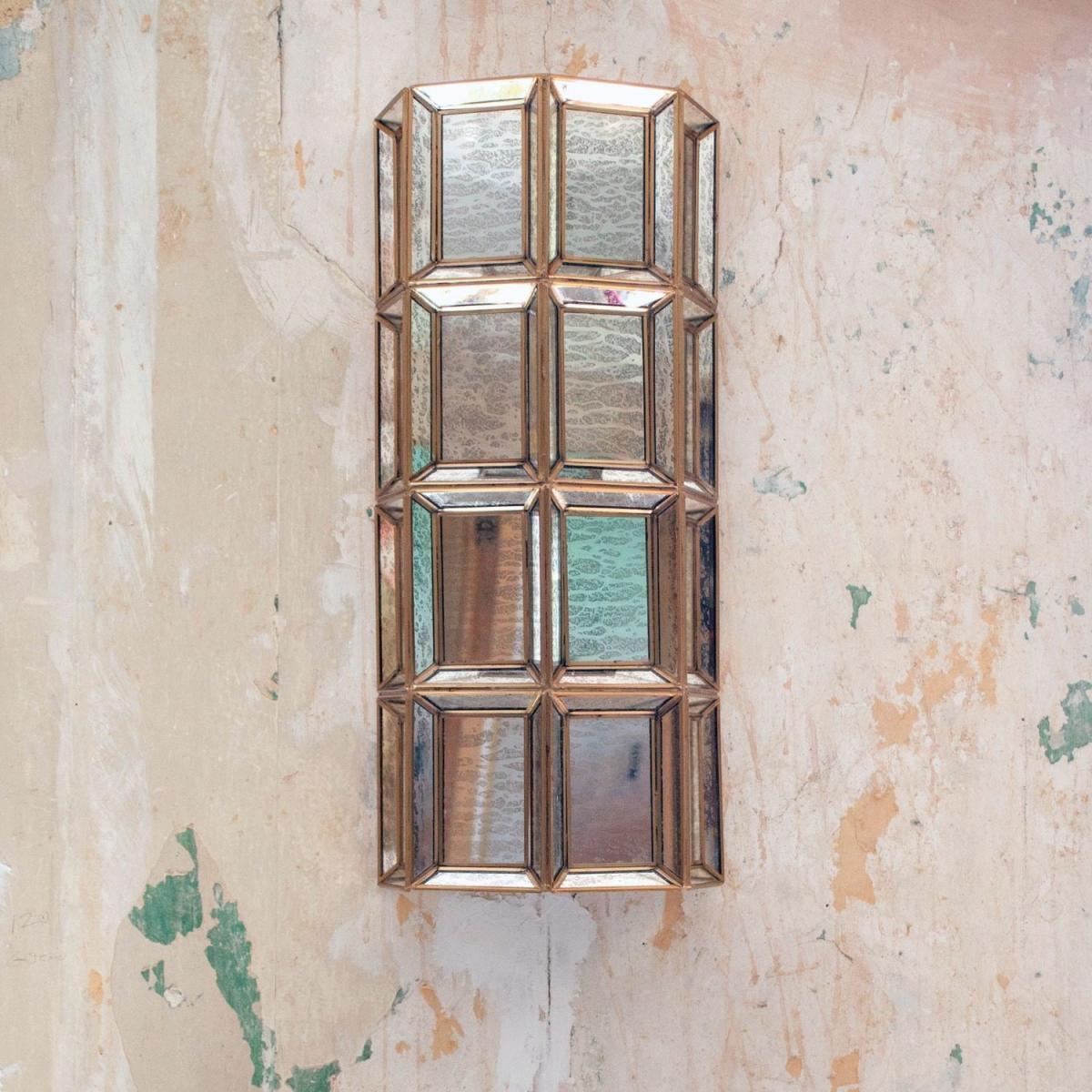 A handcrafted art deco inspired wall light made from mottled glass and held together in an iron frame with a rustic brass finish.