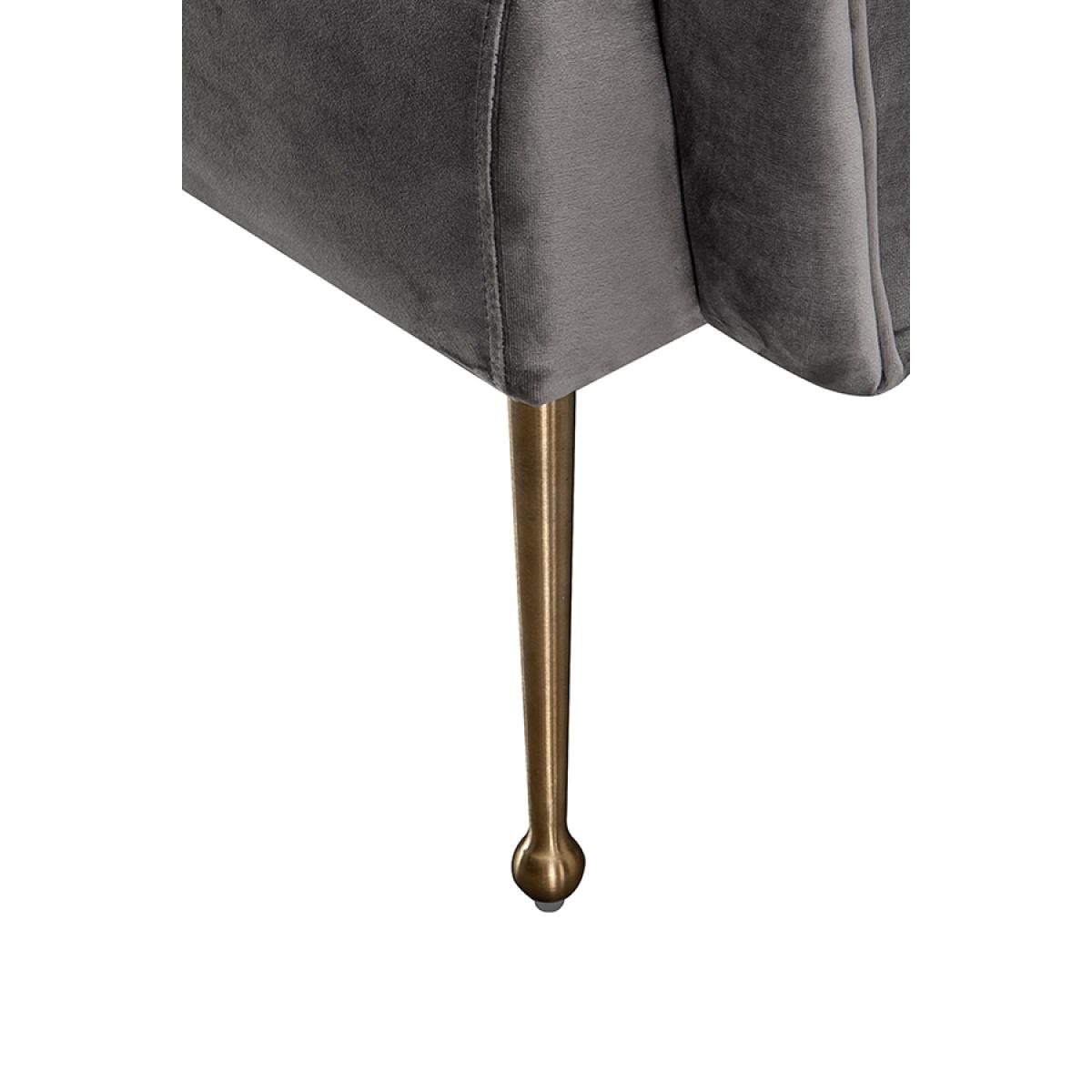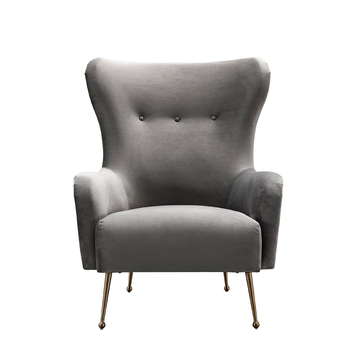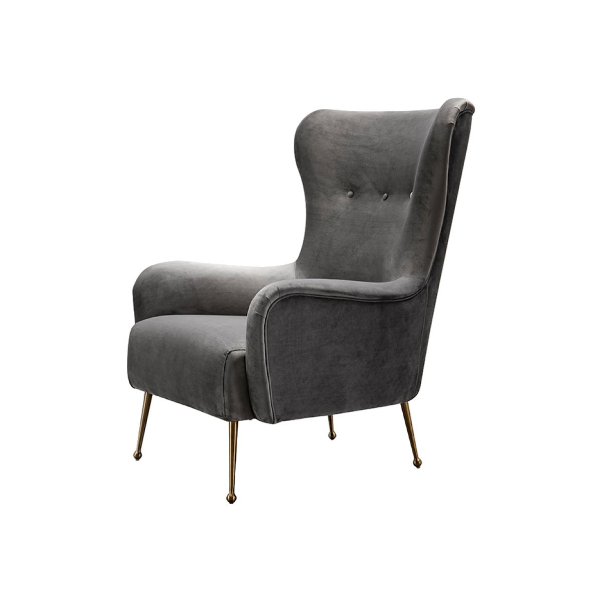 An elegant, sculptural armchair inspired by highly collectable Mid-Century American furniture. Distinctive buttoned, winged backrest. Stainless steel legs with brushed brass finish. Comfortable foam and fibre seat with sprung base. Velvet upholstery fabric. Delivered assembled.