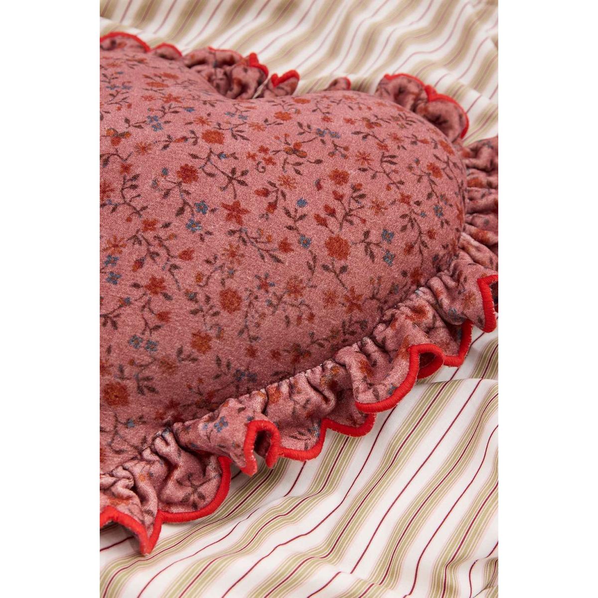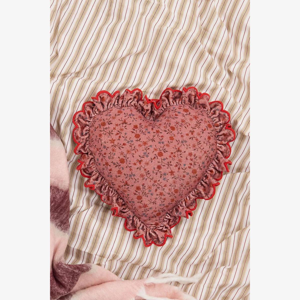 Romantic heart-shaped cushion with delicate ruffle trims. Crafted from cotton with a soft filling and topped with a pretty floral print. **Content + Care** \- Outer: 100% Cotton \- Filling: 100% Polyester \- Spot clean **Size** \- 40cm x 40cm