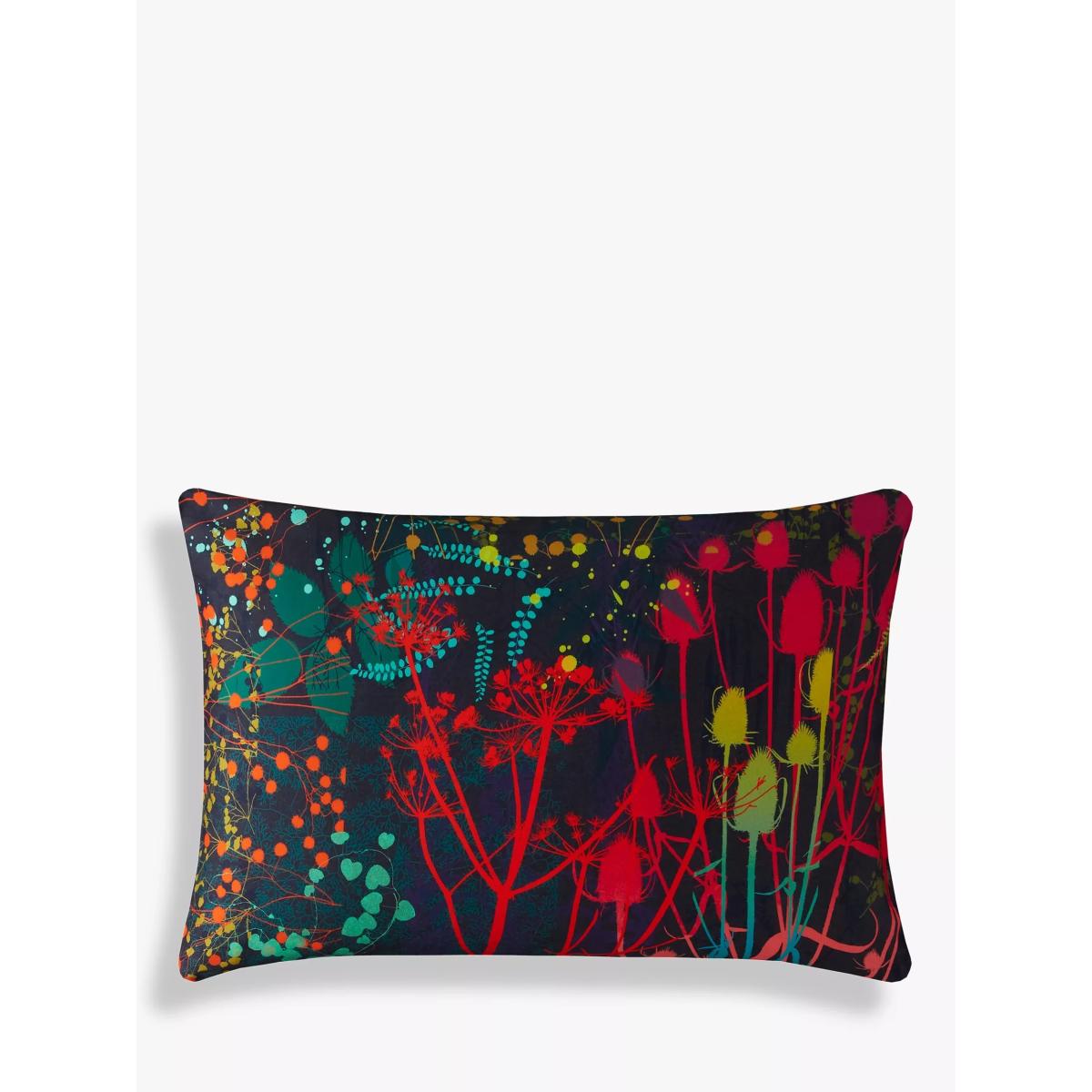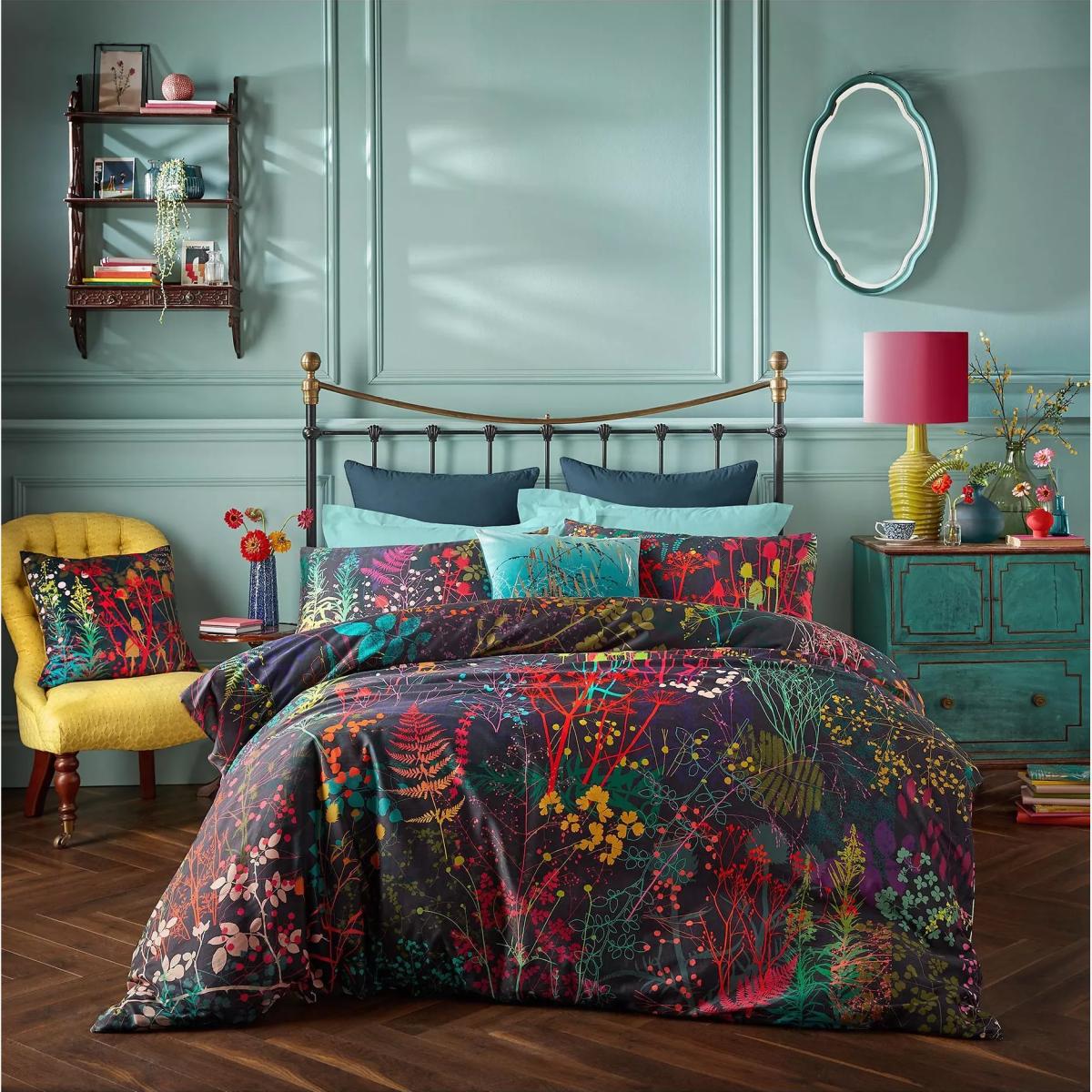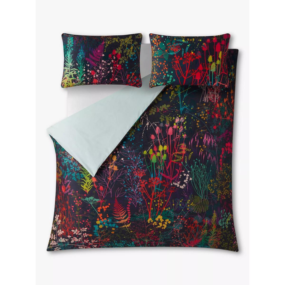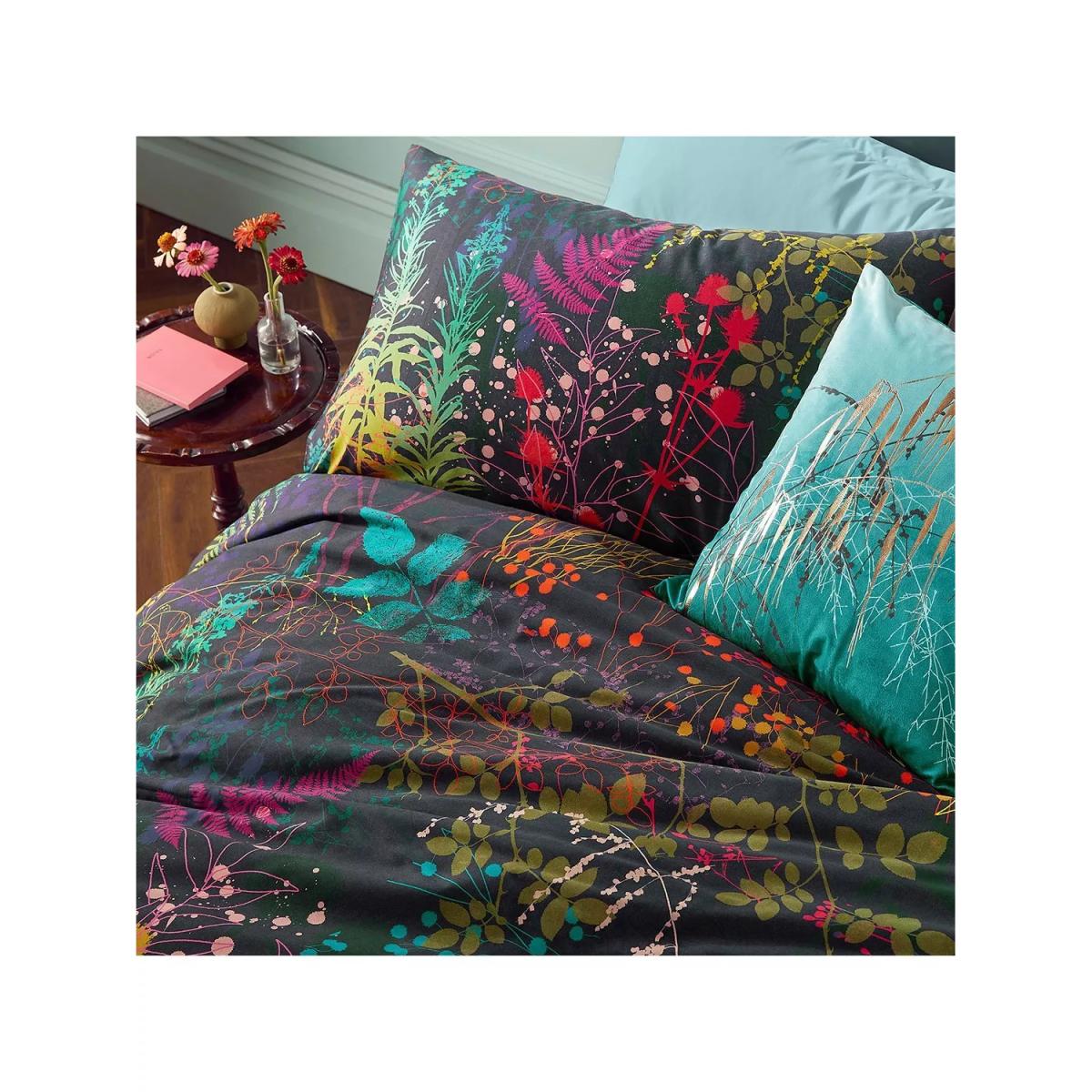 Serendipity cotton bedlinen is a joyful kaleidoscope of rainbow hues and botanical patterns. Delicate leaves, vines, stems and flowers float across this gorgeous bed linen, in a wave of rich, zesty tones from hot pink to kingfisher blue with spots of orange, mustard and teal. The design is a snapshot of Clarissa’s craft - after hours of screen printing these serendipitous patterns emerge on the printing table backing cloth. The result is pure painterly magic. Printed onto a luxurious 220 thread count cotton sateen, with a pair of coordinating standard pillowcases (one in the single set) and presented in a smart box. Bedding sizes To fit duvet/pillow size (cm) Standard pillowcase to fit 50cm x 75cm Double duvet cover to fit 135cm x 200cm Double duvet cover to fit 200cm x 200cm Kingsize duvet cover to fit 225cm x 220cm Super kingsize duvet cover to fit 260cm x 220cm