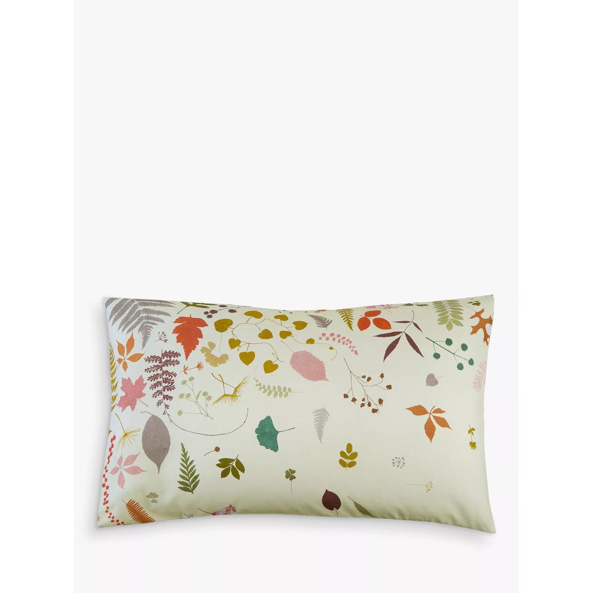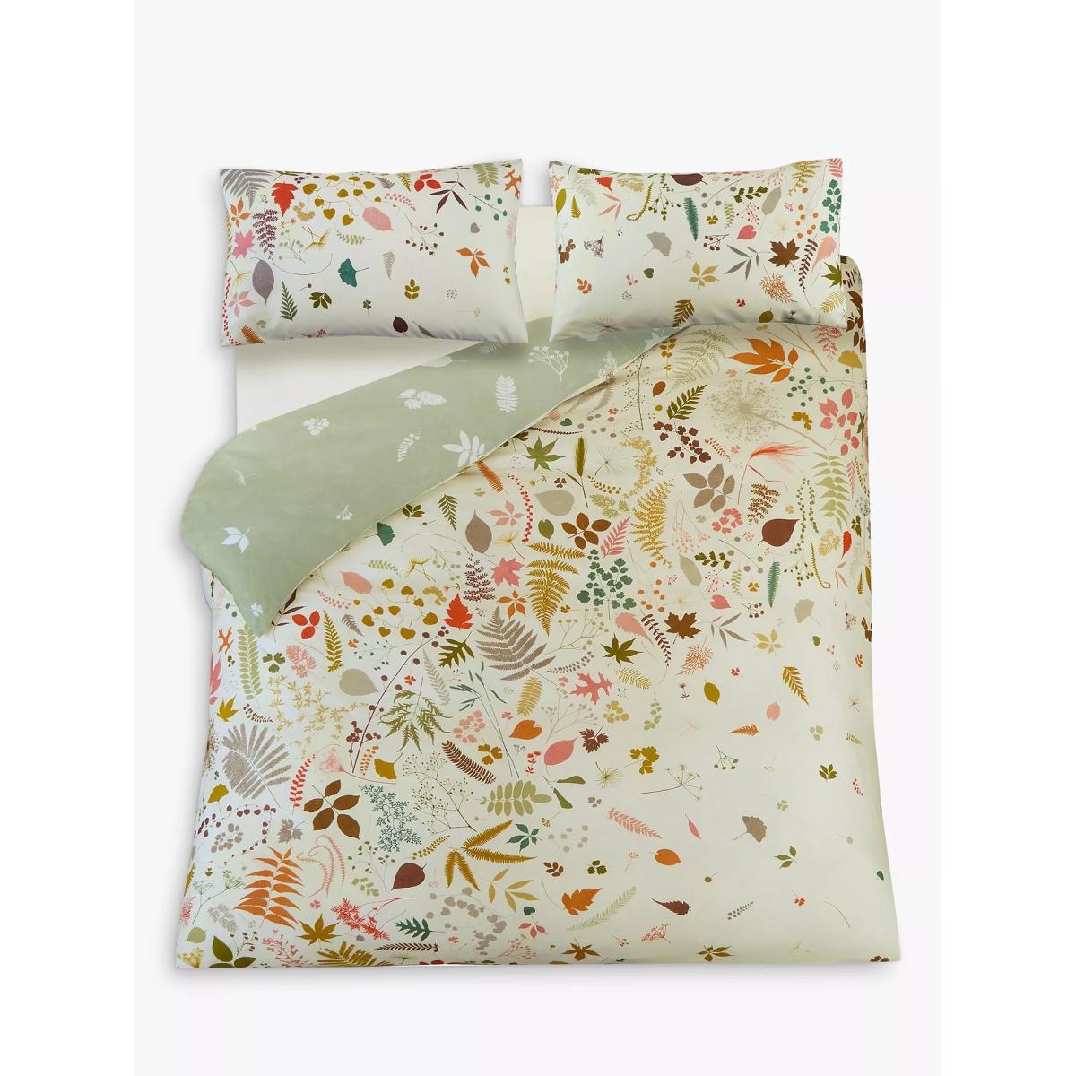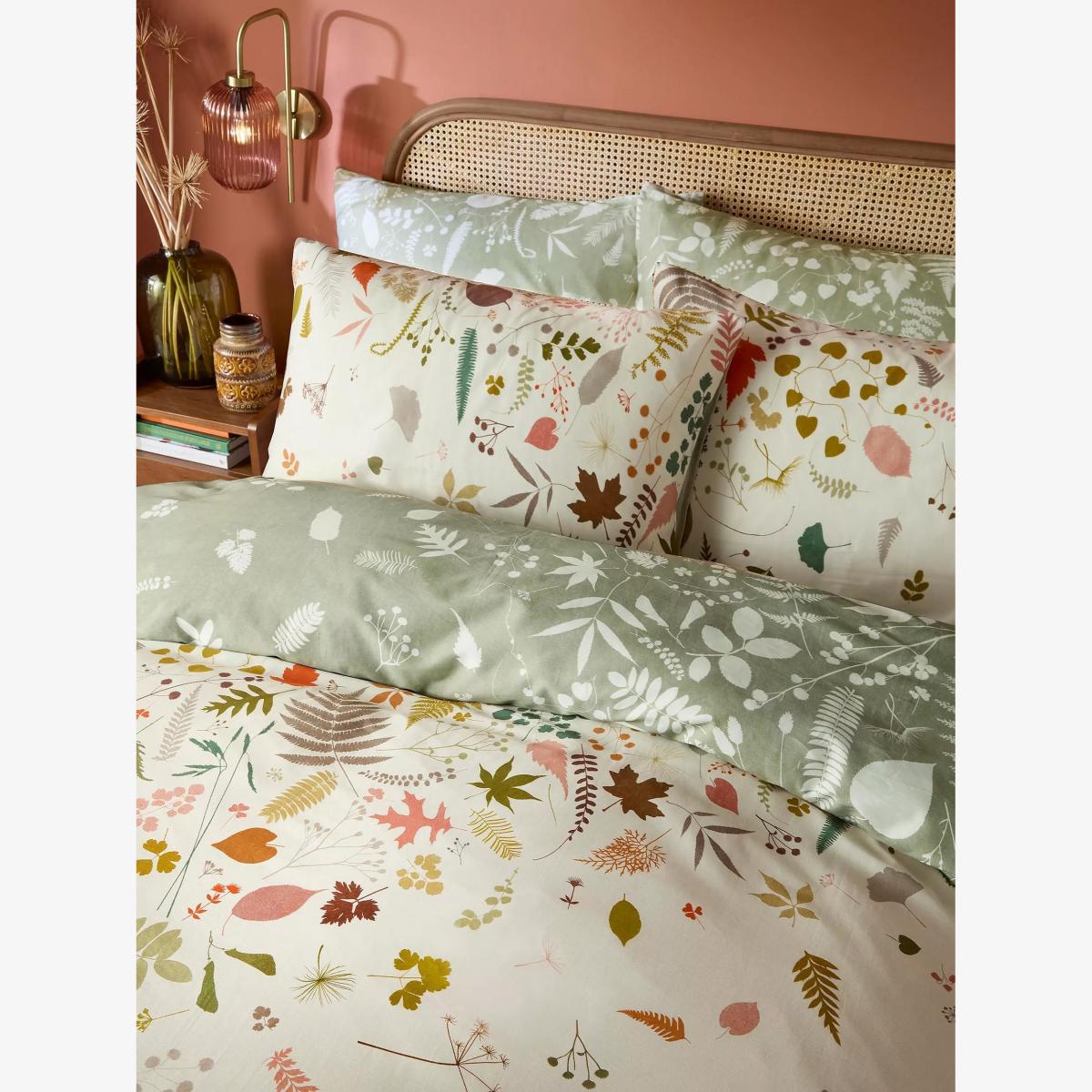 Reminiscent of a peaceful forest stroll, this cotton sateen Woodland Walk bedding captures a palette of warm fallen leaves, seedheads and dried woodland treasures. The soft sage green reverse offers a more subtle variation, giving the choice of two different looks to update your bedroom. This design is digitally printed on 220 thread count cotton and comes with matching pillowcases - one in the single set and two in the double, king and super king sets. Standard pillowcases are also available to buy separately, in pairs. Bedding sizes To fit duvet/pillow size (cm) Standard pillowcase to fit 50cm x 75cm Double duvet cover to fit 135cm x 200cm Double duvet cover to fit 200cm x 200cm Kingsize duvet cover to fit 225cm x 220cm Super kingsize duvet cover to fit 260cm x 220cm