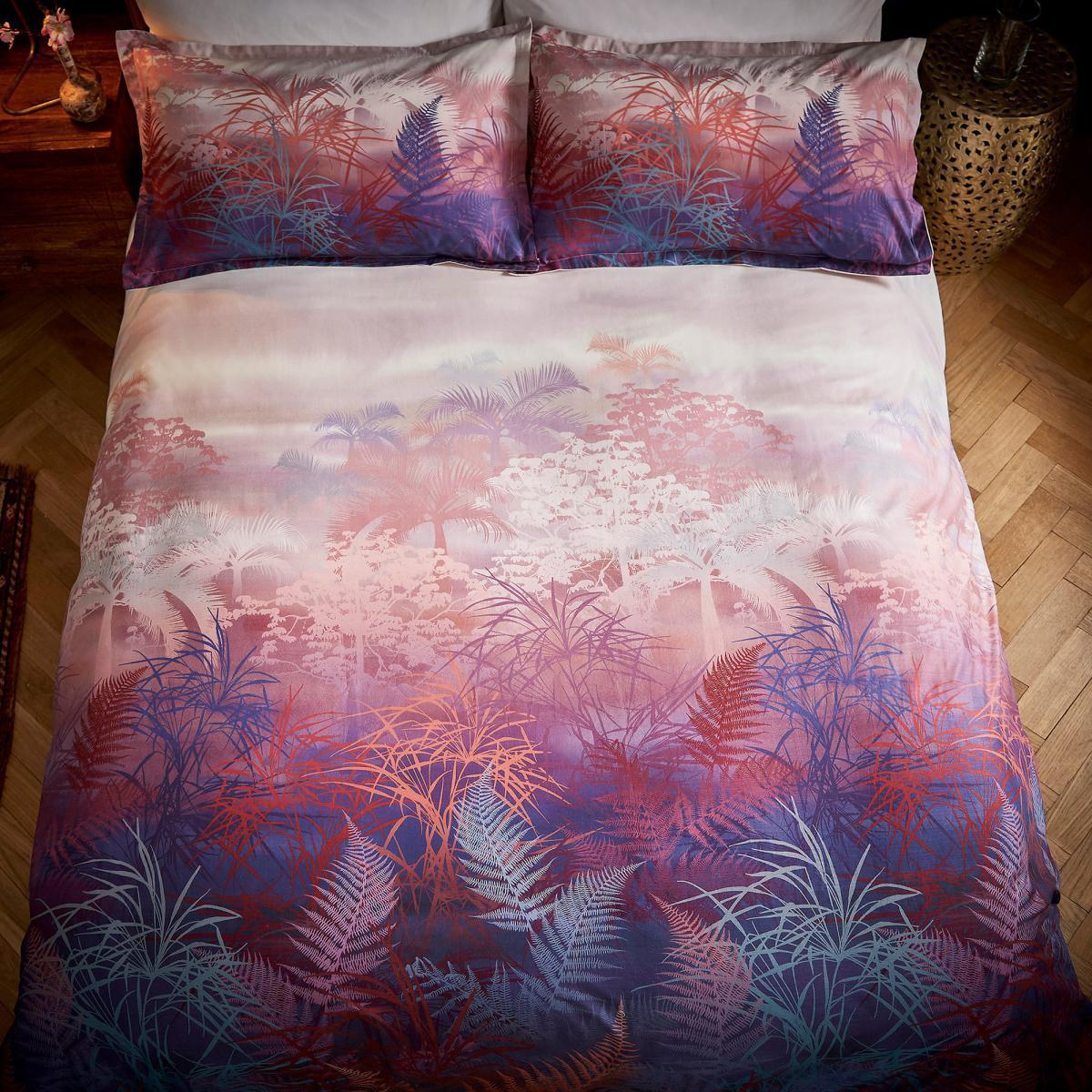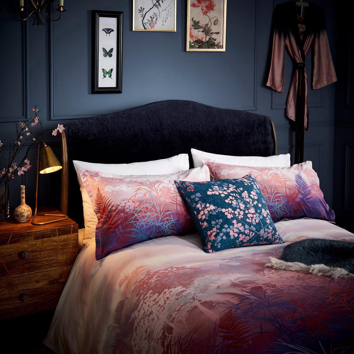 The Kimono bed linen is a fusion of influences. Finding synergy between the misty painted scenes on Japanese kimonos and images of tropical palms, bamboos and ferns captured on her own trip to the Costa Rican cloud forest, Clarissa has created a breath-taking design using ombres that pass from navy to plum to greyed off pastel pinks. Care Instructions:.
