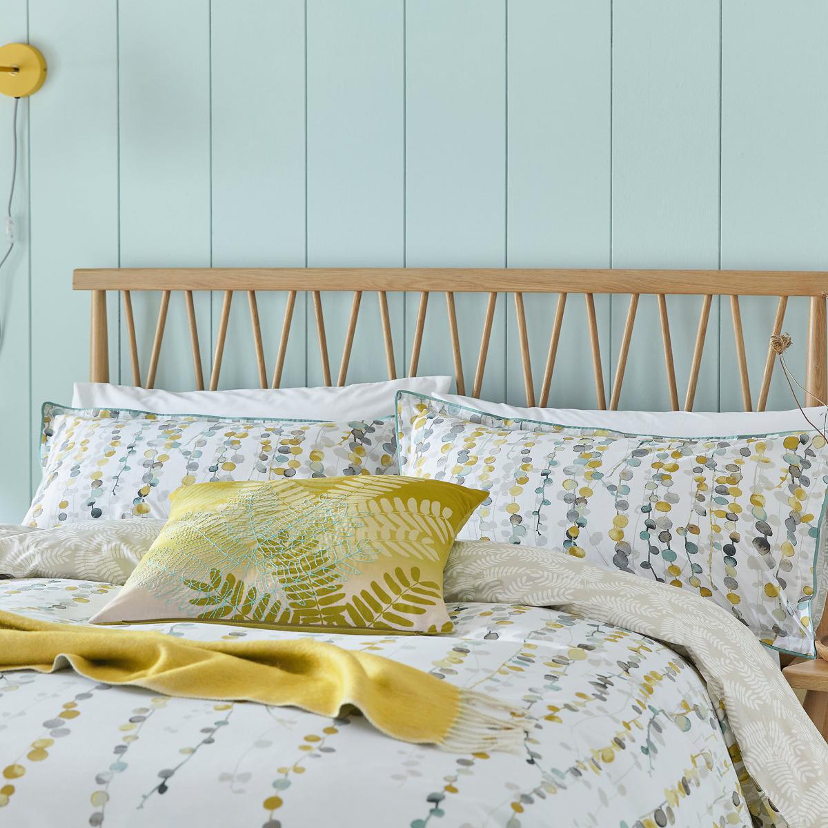 This bed linen is inspired by one of the plants found growing in Clarissa’s studio – a space which is fast becoming part greenhouse! The design, hand painted in watercolour by Clarissa, depicts the plant’s trailing vines in hues of turmeric and shades of soft, grey green with a neutral delicate acacia leaf pattern on the reverse. Care Instructions:.
