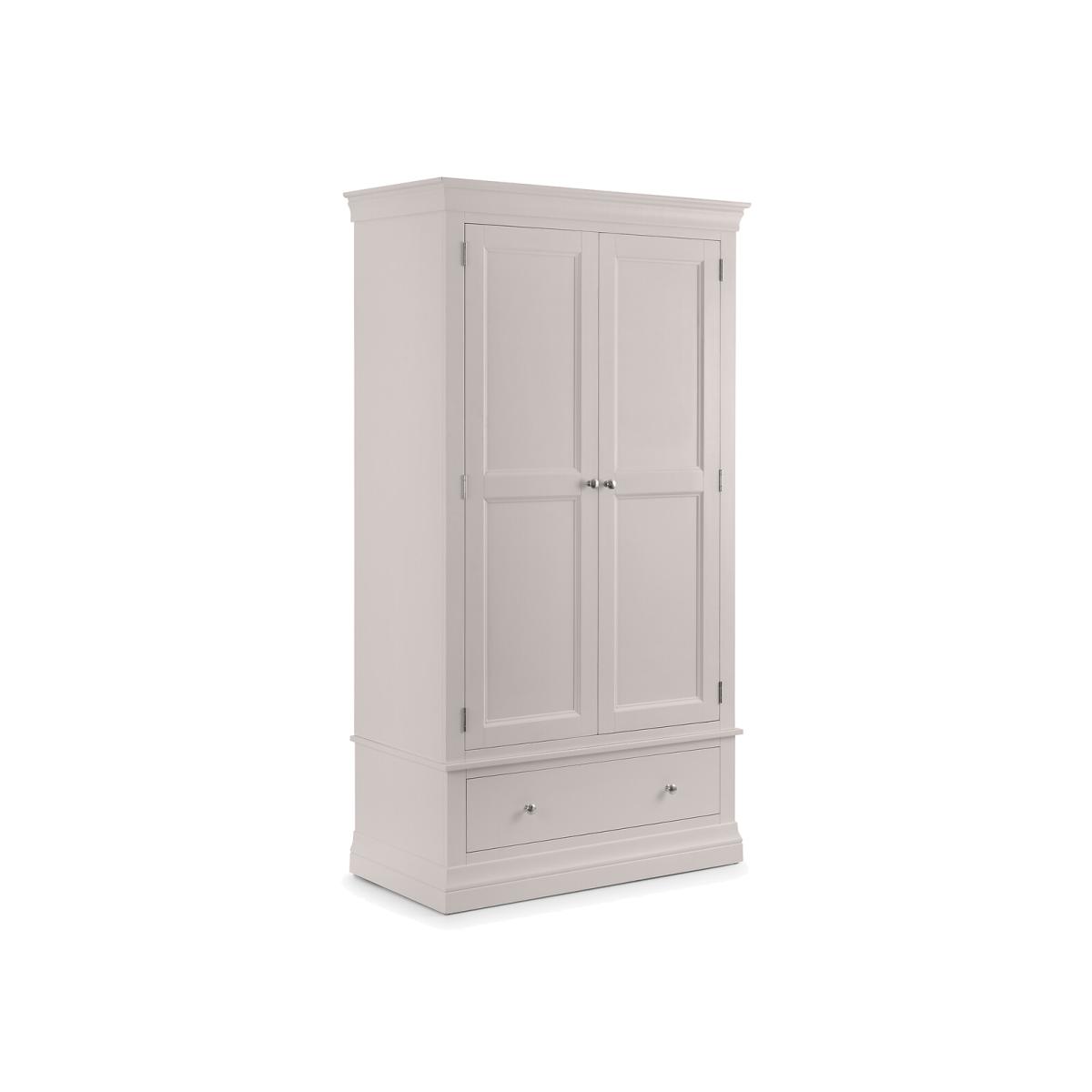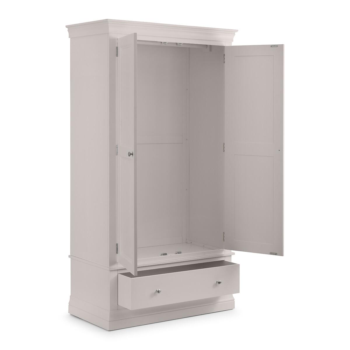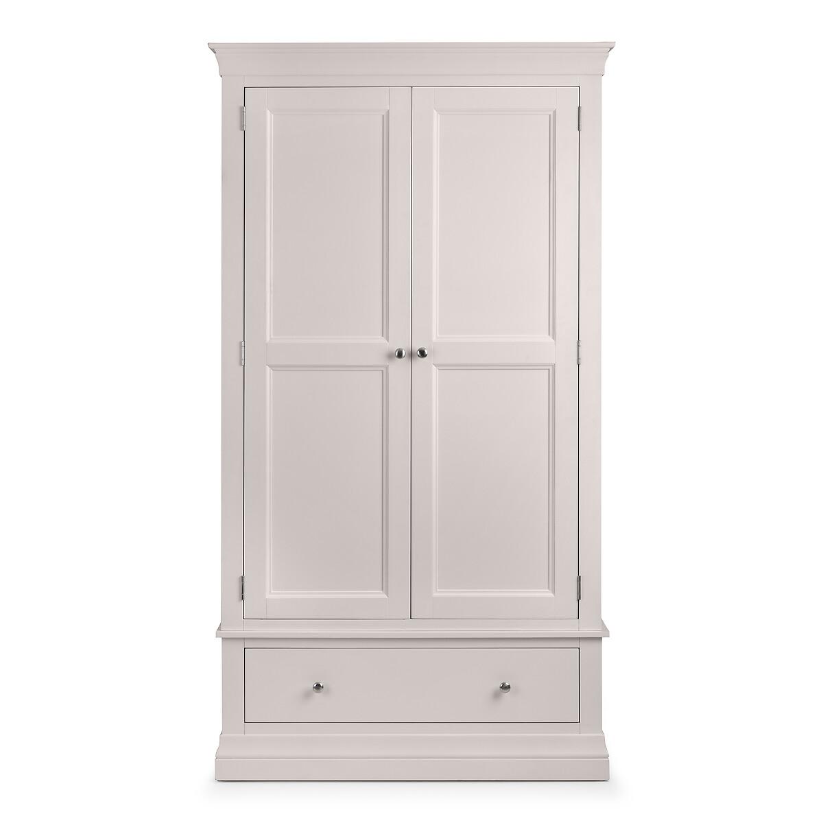 Elegant and French inspired, this beautifully designed wardrobe is sure to fit into any Parisian inspired boudoir. Finished in a striking lacquered finish, it has simple clear lines that add a feeling of light and space. Alongside generous hanging space, a full width drawer is perfect for storing shoes, handbags or knitwear. Product details • Solid pine and MDF construction • 2 door wardrobe • Single hanging rail • Storage drawer • Traditional panelled doors with painted finish • Rounded silver coloured handles • Cornice detailing • Plinth base • Assembly required • Fixings supplied • 12 month manufacturers warranty. Product Composition - 95% Wood, 5% Metal. Product Dimensions - 56 cm x110 cm x192 cm , Weight - 73.5 KGParcel 1 Packaged Dimensions - 159 cm x 110 cm x 17.5 cm, Weight 46 kg Parcel 2 Packaged Dimensions - 116 cm x 116 cm x 62 cm, Weight 39 kg. Please note: this product cannot be be delivered to all Offshore Islands Northern Ireland or Republic of Ireland. This product will be dispatched by one of our trusted suppliers. You’ll be contacted by their selected courier about your delivery.