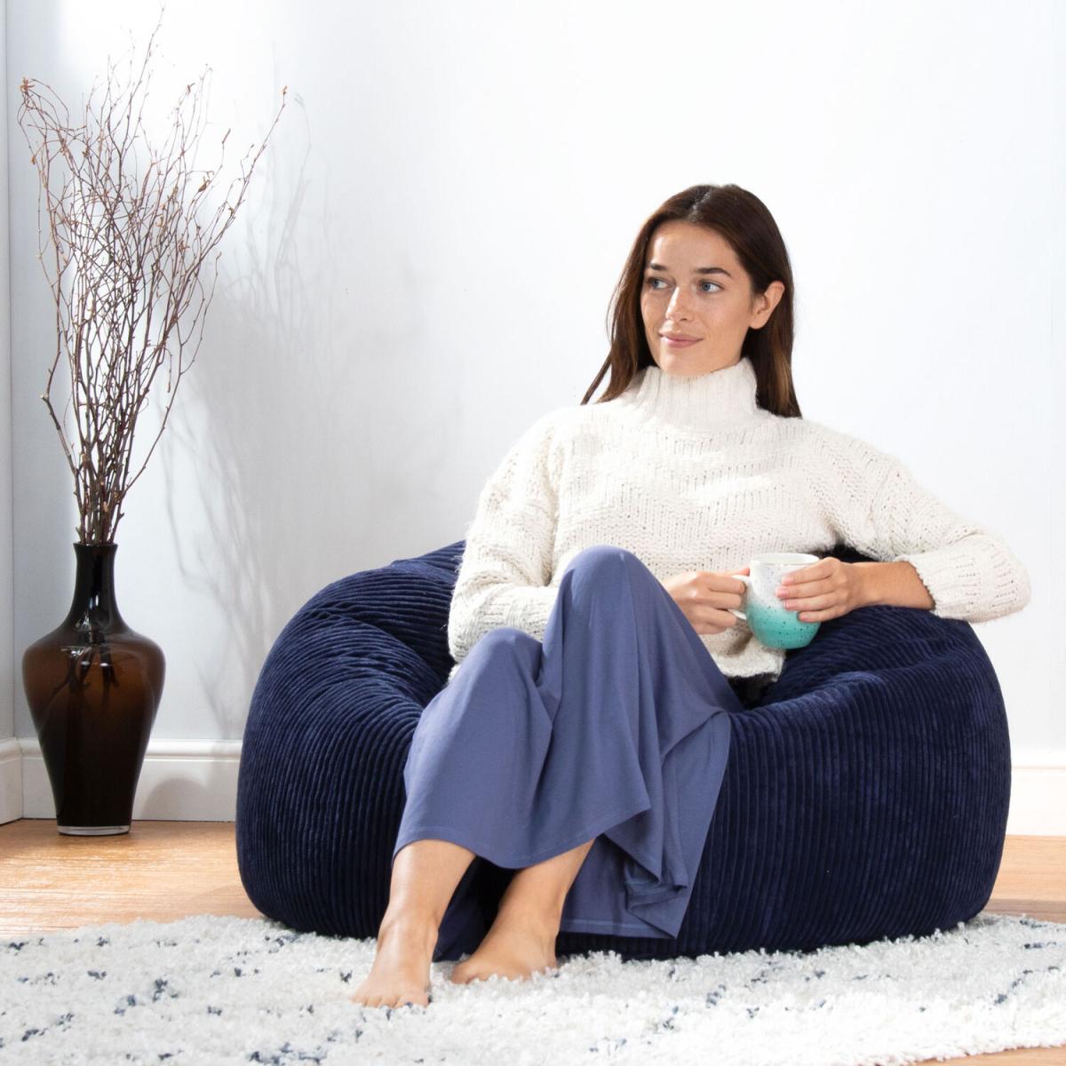 I love this bean bag for its plush cord texture and versatile navy tone, which makes it a great addition to both contemporary and cosy casual interiors. It works particularly well in living rooms, family dens, or even a relaxed bedroom corner, offering both comfort and style. Styling tips include pairing it with neutral-toned furniture to let the navy pop or mixing it with softer textiles like knits orsheepskins for extra layered comfort. The accompanying footstool adds practicality, making this perfect for lounging or casual seating, and it can easily be moved around to suit different seating arrangements or to create a cosy nook.