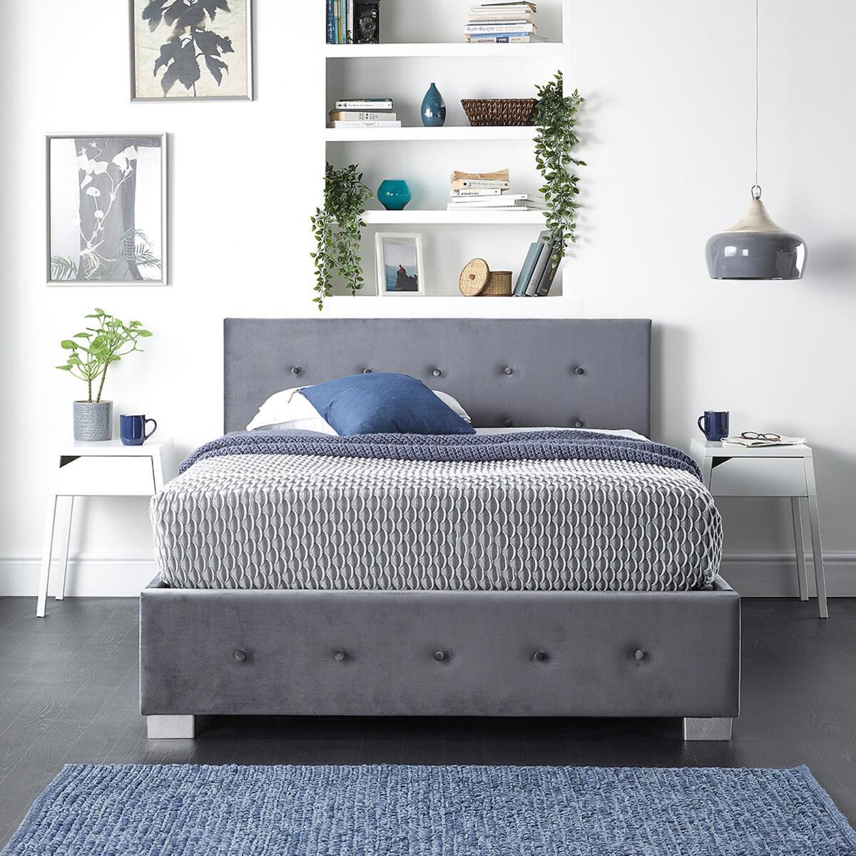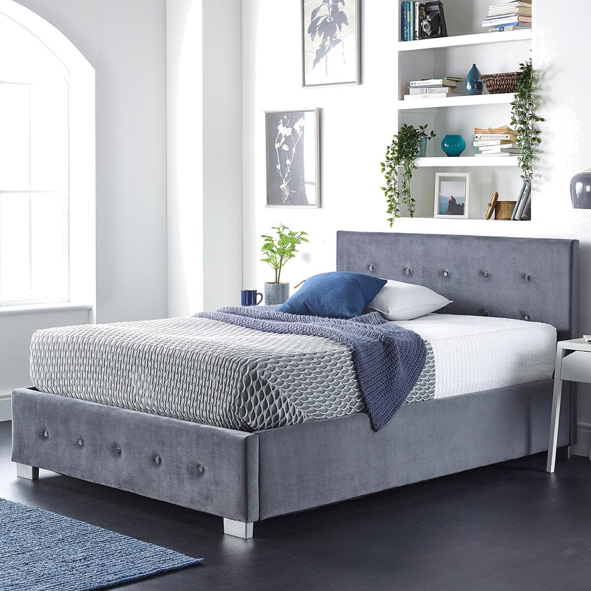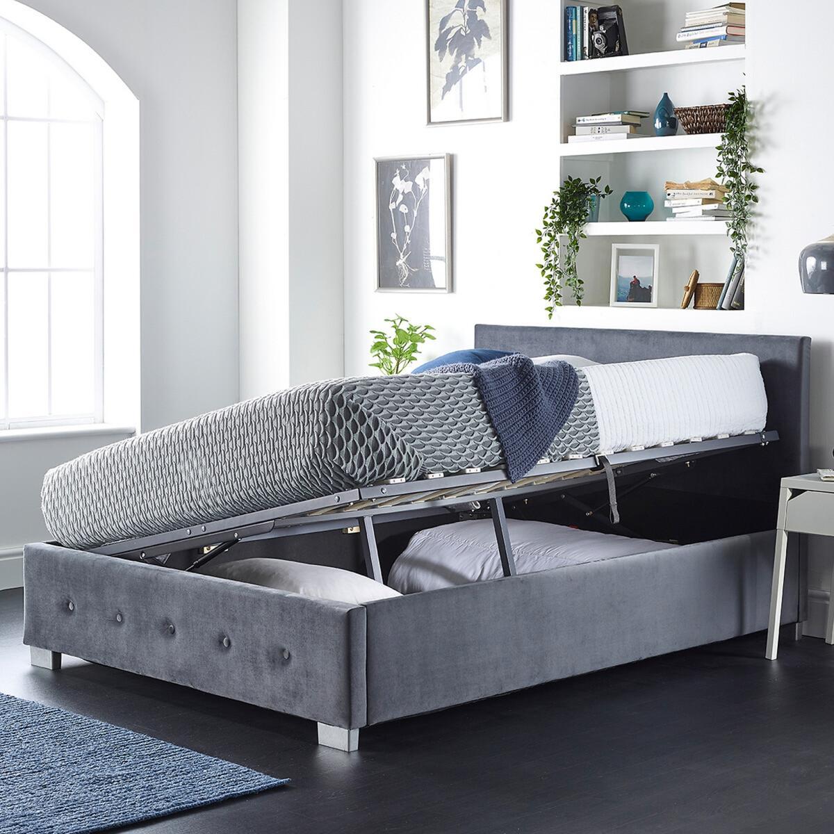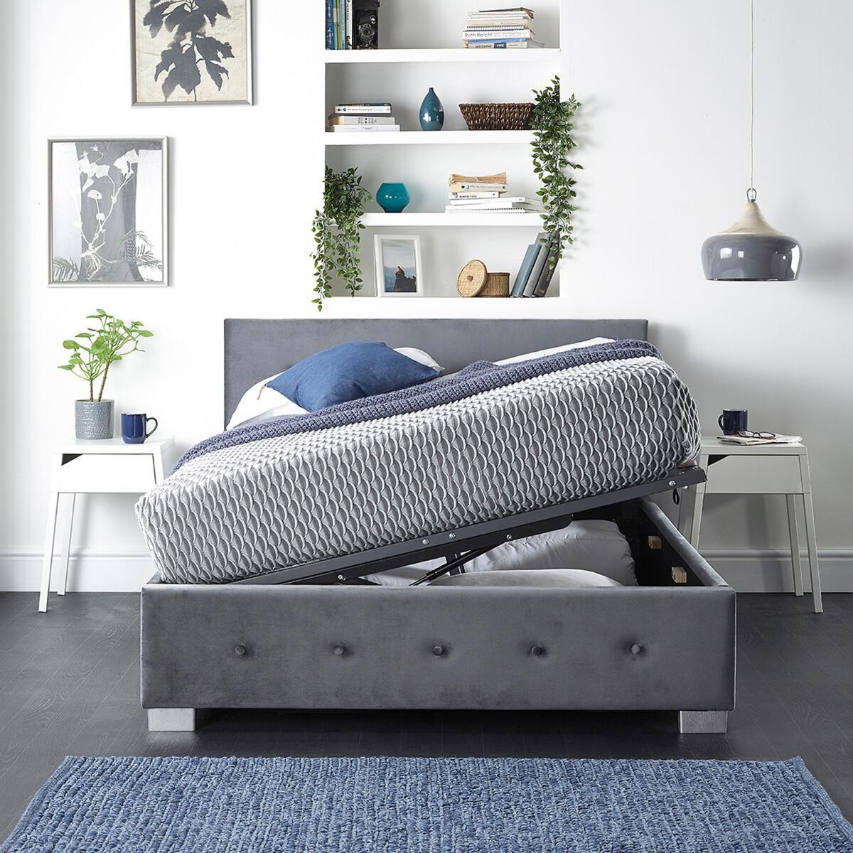 Please note: this product cannot be delivered to all Offshore Islands, Northern Island or Republic of Ireland. This product will be dispatched by one of our trusted suppliers. You’ll be contacted by their selected courier about your delivery. Please note this item will be delivered to your doorstep. A stylish and practical ottoman storage bed available in sumptuous plush velvet. The bed features a durable steel framework with quality, hard wearing 8 ply poplar sprung slats. The sprung slats increase comfort whilst also increasing mattress life span. Classic buttoned headboard with padding for added comfort when sitting up in bed. Matching buttoned footboard and attractive silver feet complete the design. Featuring quality gas lift pistons, the large storage area can be easily accessed enabling a large variety of items to be tidily stored away. The mechanism is set for side opening and can be constructed for either side to open. The base is covered with a black fabric cloth so stored items are not in contact with the floor. Suitable for use with all standard UK size mattresses. The bed meets all UK FR and safety standards. Supplied flat pack for self-assembly, approximate build time of 60-90 minutes. Swatch service: We offer a FREE swatch service. Please email samples@aspire-furniture.co.uk and include the below information:Please include 'La Redoute' in the title of your email. Name and address:Product: Essentials Ottoman Bed. Fabric: Velvet. Colour: Steel. Your swatches will be delivered within 10 working days (subject to availability) Product Dimensions: Single: 96.5cmx102cmx205cm. Small Double:96.5cmx132cmx205cmDouble:96.5cmx149cmx205cmKing:96.5cmx162cmx215cm Super King:96.5cmx192cmx215cm. Please remember to measure your available space before ordering. Single:Parcel 1 Packaged Dimensions 198cmx 32cmx 18cm Weight: 12kg Parcel 2 Packaged Dimensions 107cmx 96cmx 9cm Weight: 12kg Parcel 3 Packaged Dimensions 188cmx 24cmx 11cm Weight: 13kg. Small Double:Parcel 1 Packaged Dimensions 198cmx 32cmx 18cm Weight: 14kg Parcel 2 Packaged Dimensions 137cmx 96cmx 9cm Weight: 13kg Parcel 3 Packaged Dimensions 188cmx 24cmx 11cm Weight: 13kgDouble: Parcel 1 Packaged Dimensions 198cmx 32cmx 18cm Weight: 14kg Parcel 2 Packaged Dimensions 154cmx 96cmx 9cm Weight: 14kg Parcel 3 Packaged Dimensions 188cmx 24cmx 11cm Weight: 15kgKing: Parcel 1 Packaged Dimensions 208cmx 32cmx 18cm Weight: 17kg Parcel 2 Packaged Dimensions 167cmx 96cmx 9cm Weight: 15kg Parcel 3 Packaged Dimensions 198cmx 24cmx 11cm Weight: 22kg Super King:Parcel 1 Packaged Dimensions 208cmx 32cmx 18cm Weight: 21kg Parcel 2 Packaged Dimensions 207cmx 96cmx 9cm Weight: 19kg Parcel 3 Packaged Dimensions 198cmx 24cmx 11cm Weight: 24kg. Upholstered Fabric Composition: in a textured linen