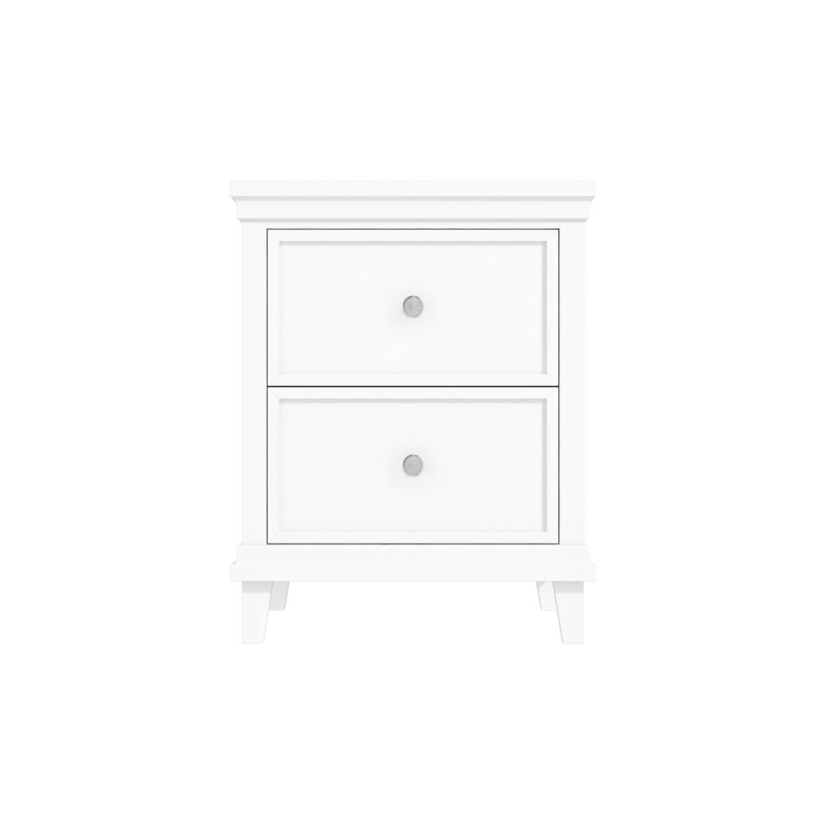This elegant bedside table is delivered fully assembled Made from solid pine wood with brushed silver coin handles Classic design and white painted finish go with any decor 2 spacious drawers for storing nighttime essentials Search 'Georgia white' to shop matching pieces in the range Need to know Number of drawers: 2 Weight: 23kg Colour: White and silver handles Finish: Painted Material: Solid pine wood frame, acacia (legs) and metal ball bearing runners Assembly required: No