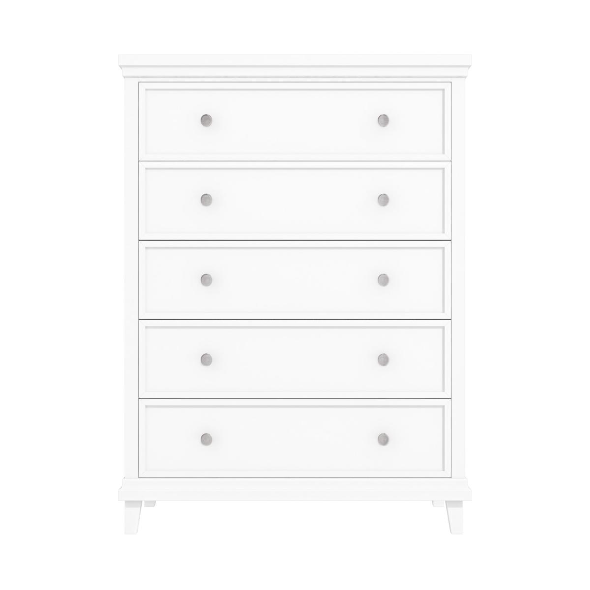 This elegant tall chest of drawers is delivered fully assembled Made from solid pine wood with brushed silver coin handles Classic design and white painted finish go with any decor 5 spacious drawers for storing folded clothing Search 'Georgia white' to shop matching pieces in the range Need to know Number of drawers: 5 Weight: 43kg Colour: White and silver handles Finish: Painted Material: Solid pine wood frame, acacia (legs) and metal ball bearing runners Assembly required: No