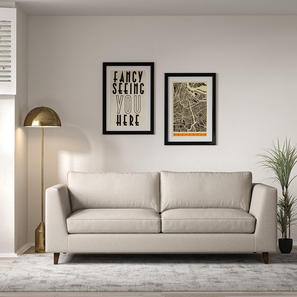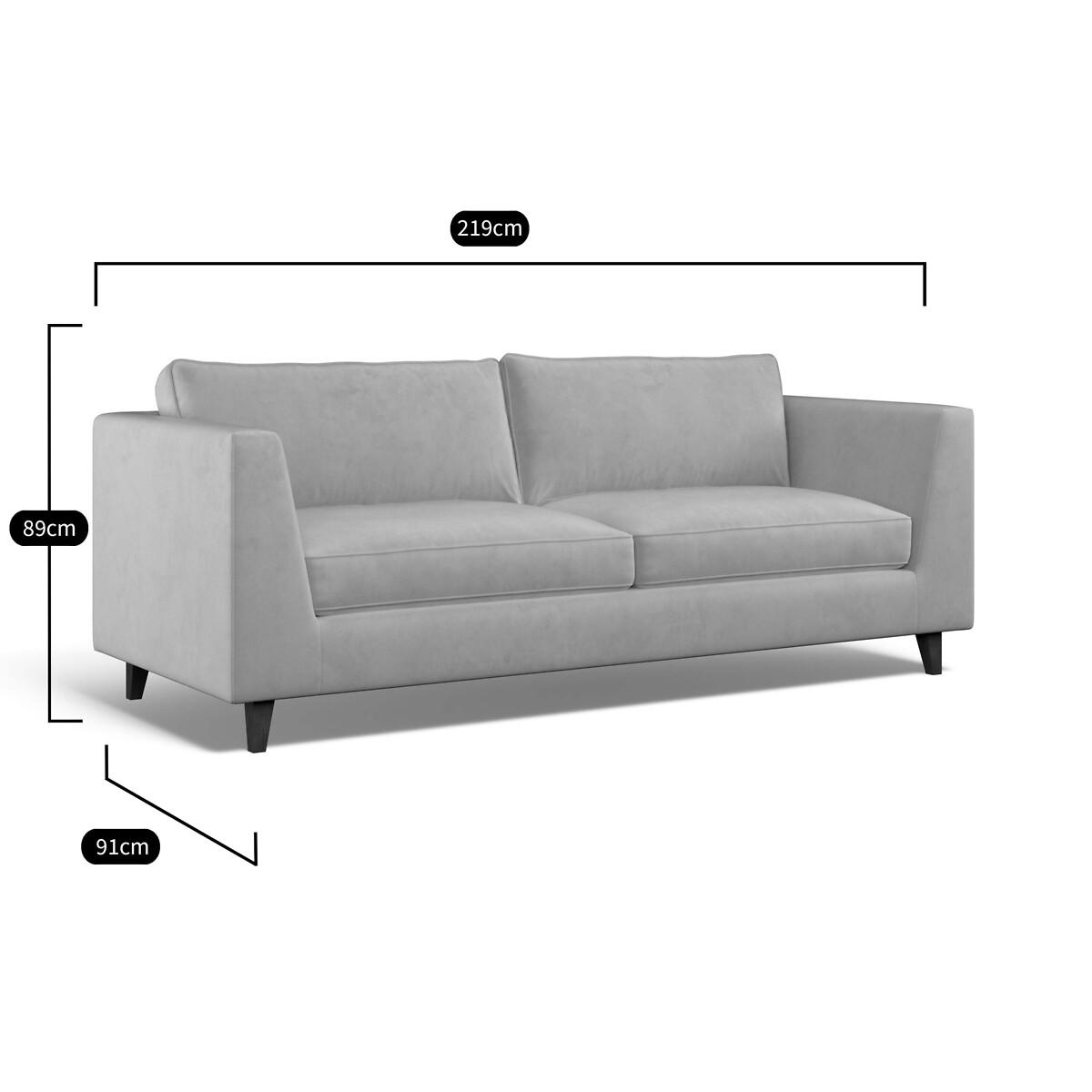 A fine-looking sofa if ever we saw one. The Claudia has a tailored apperance, with modern shapes and angled sides. But don't let these clean lines fool you - the Claudia is as comfortable as it is contemporary. A blissfully squidgy feathery seat is paired with a deep cushioned back, promising the comfiest sit. Choose from our soft brushed fabric for ultimate cosiness or velvet for luxe living. The Claudia is available as a 2 seater or a 3 seater sofa. Product details• Soft Brushed - A cosy and practical flat woven fabric featuring a subtle brushed handle for a superbly snuggly seat. Check it's right for you - order a FREE swatch above.• Created with medium density foam fillings for a sofa with a level of comfort suitable for most. • Luxury seating cushions made from a blend of foam, feather and fibres offer the best of both words. A foam core with a feather wrap gives the cushion increased resilience and support without compromising on comfort, whilst fibre fillings add softness and body. Feather fillings allow air to circulate better, whilst being great at retaining heat in colder months. • Fibre backs provide extra softness and give you that "sink in" feeling.• Just flip to freshen up - the back cushions are fully finished both sides and reversible so it's easy to keep your sofa looking its best. Seat cushions are not reversible but are removable. • Both seat and back covers are removable (zip fastening)• FSC® solid beech hardwood frame - made of wood from responsibly managed forests that provide environmental, social and economic benefits.• Tapered feet crafted entirely from solid wood ensure durability and stability.• Removable feet.• Lovingly handmade in the UK.All our made to order sofas are carefully manufactured in the UK.Each hardwood frame is dowelled, glued, and screwed before being paired with the finest fabrics and fillings. And it doesn't stop there - for customer peace of mind and safety, all frames and fabrics are rigorously examined, inspected, and tested to the highest standards. All filling material(s) and covering fabric(s) meet the requirements for resistance to cigarette and match ignition in the 1988 safety regulations. This sofa comes with a 3 year manufacturer warranty from date of delivery (subject to terms and conditions)Product composition• Fabric - Soft Brushed (100% polyester)• Seat fillings - foam/fibre/feather• Back Fillings - Fibre• Frame - Beech Hardwood (FSC), OSB (UK origin, FSC)• Feet - Solid Wood. Product Dimensions Overall width: 219 cm. Overall depth: 91 cm. Overall height: 89 cm. Seat height: 48 cm. Seat depth: 58 cm. Seat width between the arms: 171 cm Arm width (at highest point): 13 cm. Back height (from base): 73 cm. Back height (from seat): 40 cm. Arm height (from floor): 77 cm. Arm height (from seat): 29 cm Clearance to floor (leg height): 16 cm. Please remember to measure your available space before ordering to be sure your sofa will fit. Don't forget to measure accessways and corners, and consider any obstacles. Package DimensionsL22. 0 cm x W91 cm x H73 cm, Weight 55 kg. This product will be dispatched by one of our trusted suppliers. You’ll be contacted by their selected courier about your delivery. Your product will be delivered to your room of choice. Feet may be assembled on arrival. BELFI01