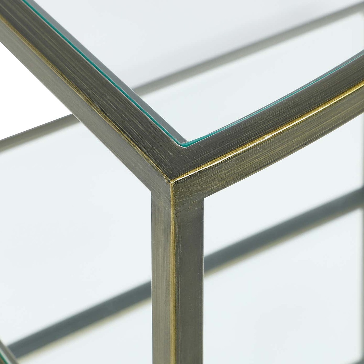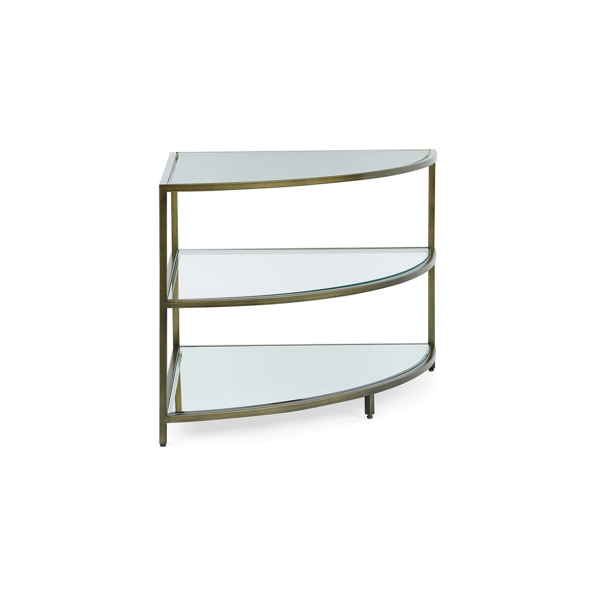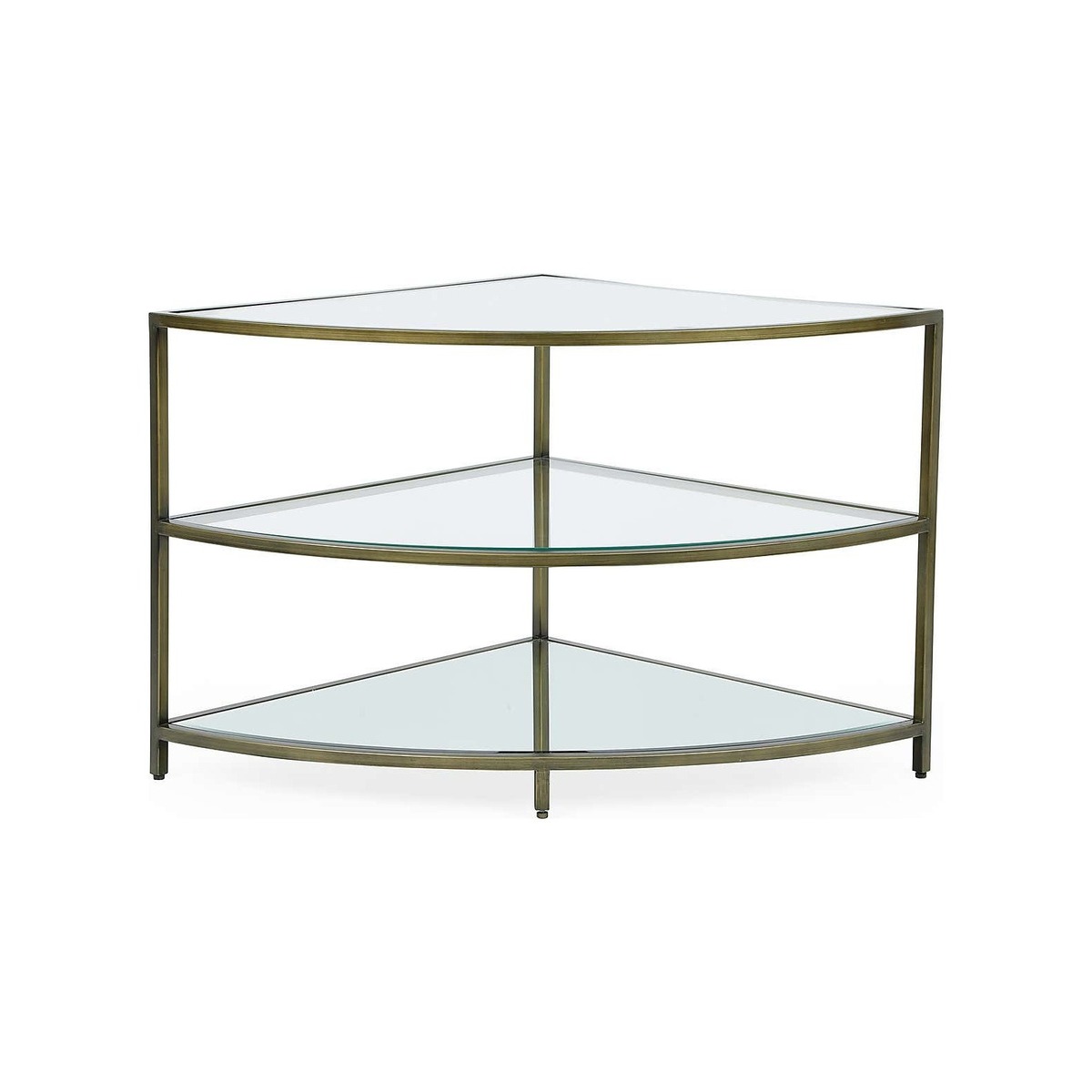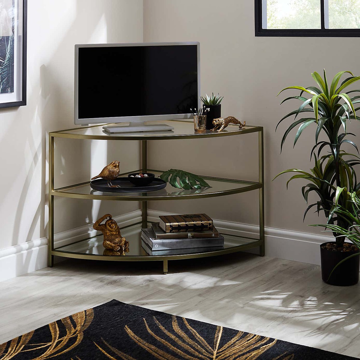 Dunelm Exclusive - Designed and Developed by Dunelm Featuring tempered glass tops, mirrored accents, and stunning brass effect finishes, the glamorous Claudia range would add a modern, elegant touch to any room. With its sophisticated, space-saving design, the Claudia corner TV stand can accommodate up to a 40 inch TV, as well as plenty of consoles and media devices thanks to the spacious, open shelves. This TV stand boasts gorgeous mirrored and clear glass shelves to create a modern, fashionable look. Item fully assembled.