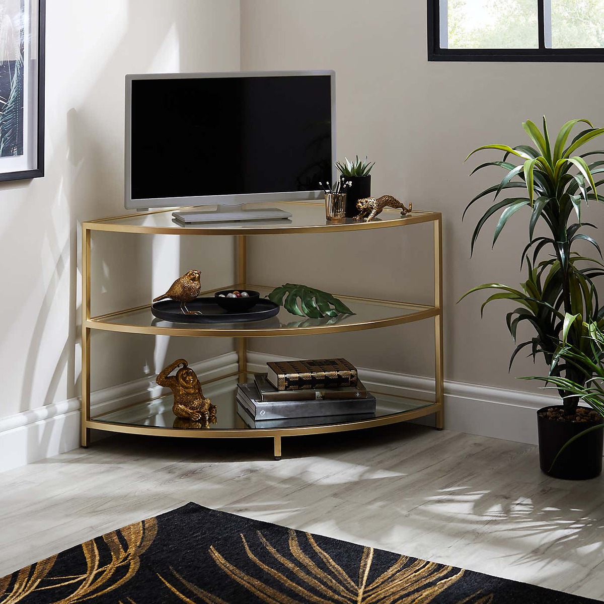 I really like the Claudia Gold Effect corner unit because its sleek gold frame adds a touch of sophistication without overpowering a space. It works particularly well in modern or glam-inspired interiors, where its metallic finish can complement other luxurious accents. Practical styling tips include keeping the top surface uncluttered with minimal decorative objects or a statement vase, while using the open shelves for organising remotes or media accessories. It’s an ideal choice for smaller living areas or corner spaces, helping maximise the room while adding a stylish focal point. Pair it with soft textiles and neutral tones for a balanced look, or with bold colours and textures to make a statement.