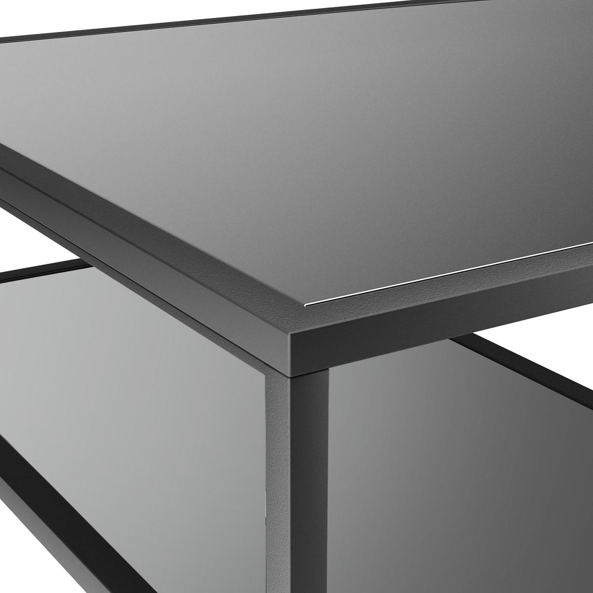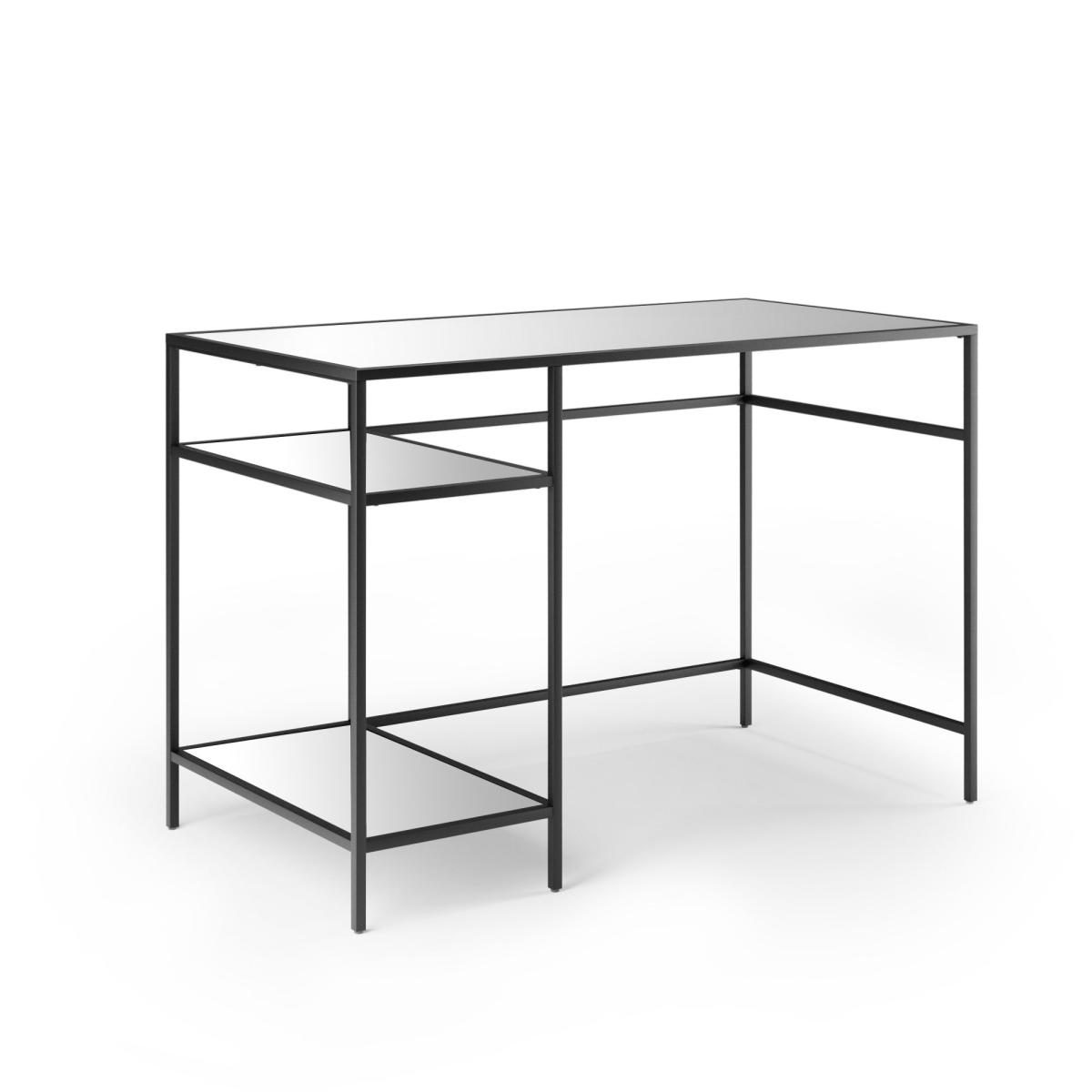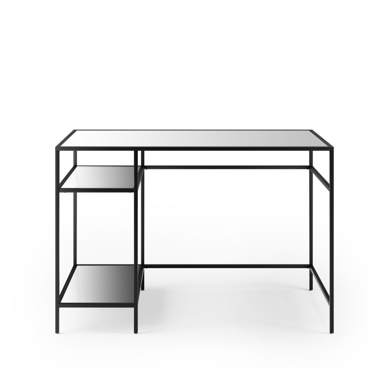 This stylishly modern Claudia Black Mirrored Desk features clean, sleek lines from the black finish metal frames and a trendy, mirrored desk top and shelves to create a luxe look that also helps to scatter light for a brighter feel. The Claudia desk comes with two shelves for extra storage space and a way to show off some stunning décor to match.