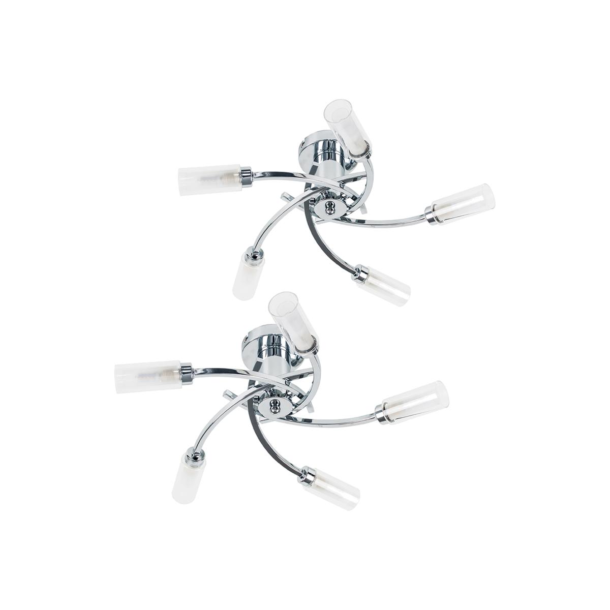 A pair of modern 5 way flush ceiling lights in a polished chrome finish with clear and frosted glass shades. With an elegant and contemporary swirl arm design. Perfect for hallways, kitchens, dining areas, living rooms and more. Ceiling lights are usually the main source of illuminating a room but with the many styles on offer today, also become a main focal point or talking point. The right fitting can make a real style statement and complete your living space look.