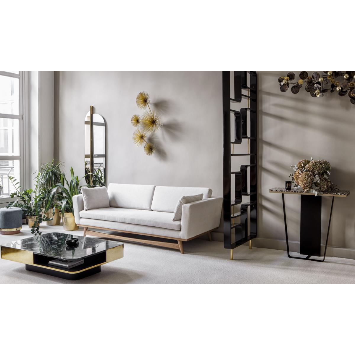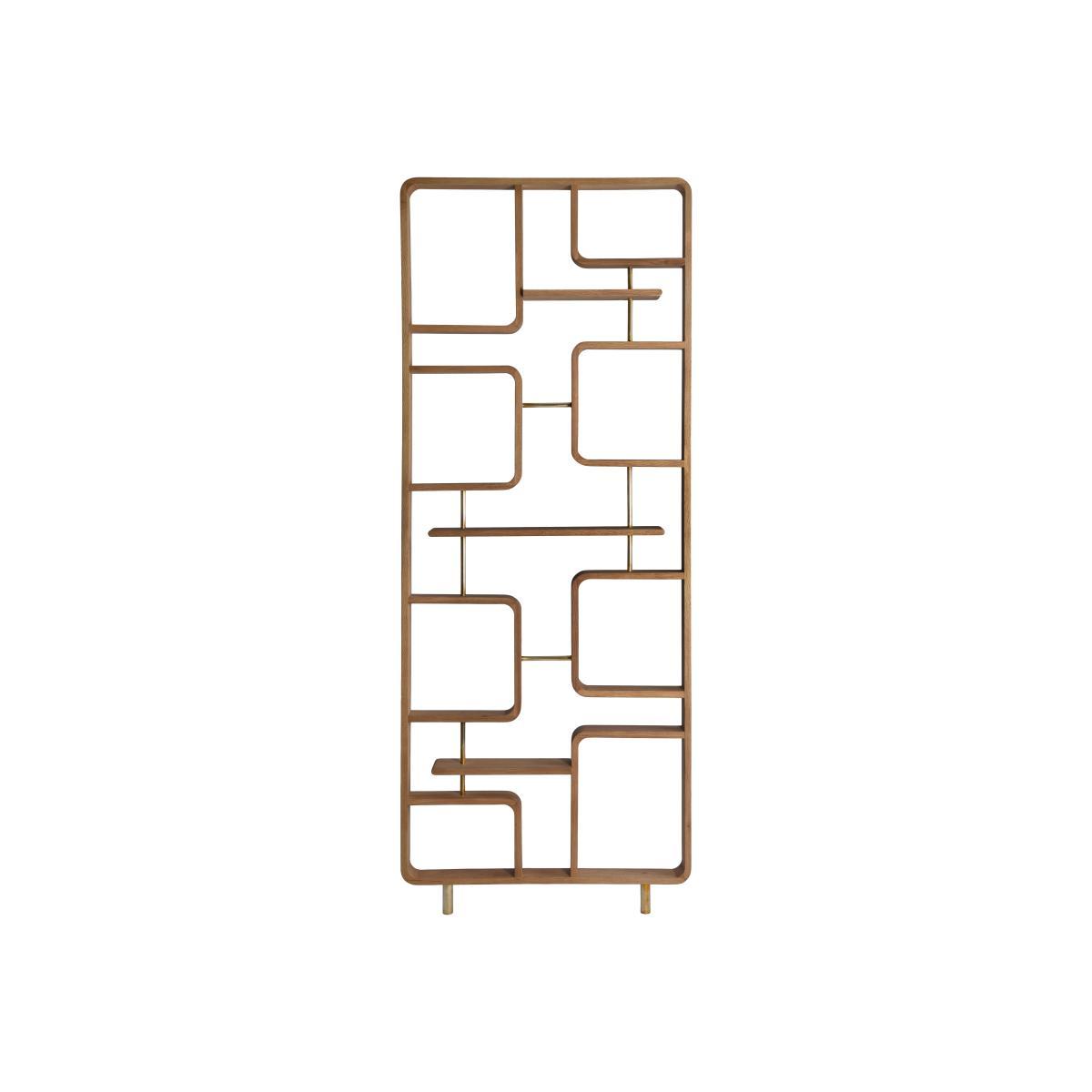 A luxurious, refined style for this openwork panel that has a vintage look inspired by the 60s. The openwork structure in solid rubberwood sports destructured lines. Highly graphic, this panel consists of a multitude of boxes of various dimensions arranged on different levels. This succession of rhythmic spaces creates a geometric, ethereal structure. The little shelves can remain empty or be decorated with plants or decorative objects. The natural wood structure is embellished with brass details that bring energy to the silhouette. This decorative partition is an elegant, original solution to separate spaces effortlessly. Easy to install, it lets in light and preserves sufficient privacy for all occupants. Holes on the side of the structure make it easy to attach to a wall.