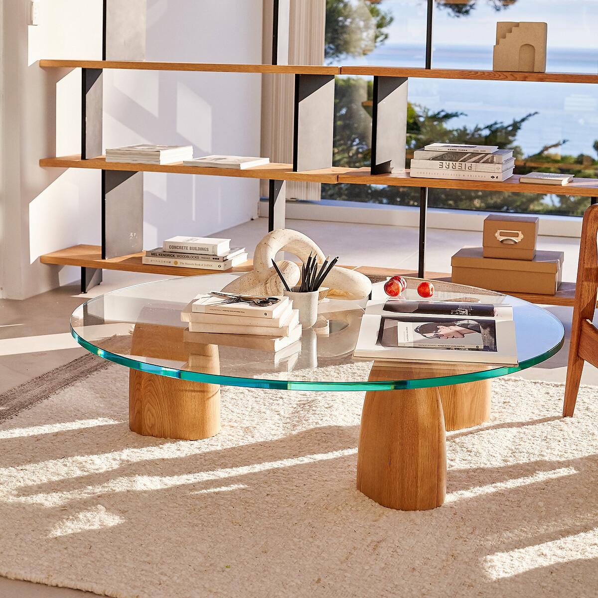 With its thick clear glass top and pebble-shaped legs, the Clay coffee table combines organic forms with sculptural design. The natural look is enhanced by the tempered glass top, which reveals three solid oak monolithic legs. Contemporary design and generous size, a coffee table by AMPM.Product Details • Thick round table top in extra-clear tempered glass, 1.6cm thick • 3 solid oak legs with polyurethane finish • FSC® certified wood Quality Info • Our table tops are made of tempered glass for your safety. Tempered glass is 5 times more impact resistant than conventional glass. • Extra-clear glass provides better visualisation. The absence of green colouring due to low iron oxide content gives higher light transmission. Dimensions • Diameter: 110cm • Height: 30cm • Sold pre-assembled. • WOOD FROM SUSTAINABLY MANAGED FORESTS. FSC® certified wood comes from forests that are environmentally, socially and economically well managed. Dimensions and weight of parcel2 parcels • L120 x H8 x D120cm, 50kg • L57 x H38 x D29cm, 16kg