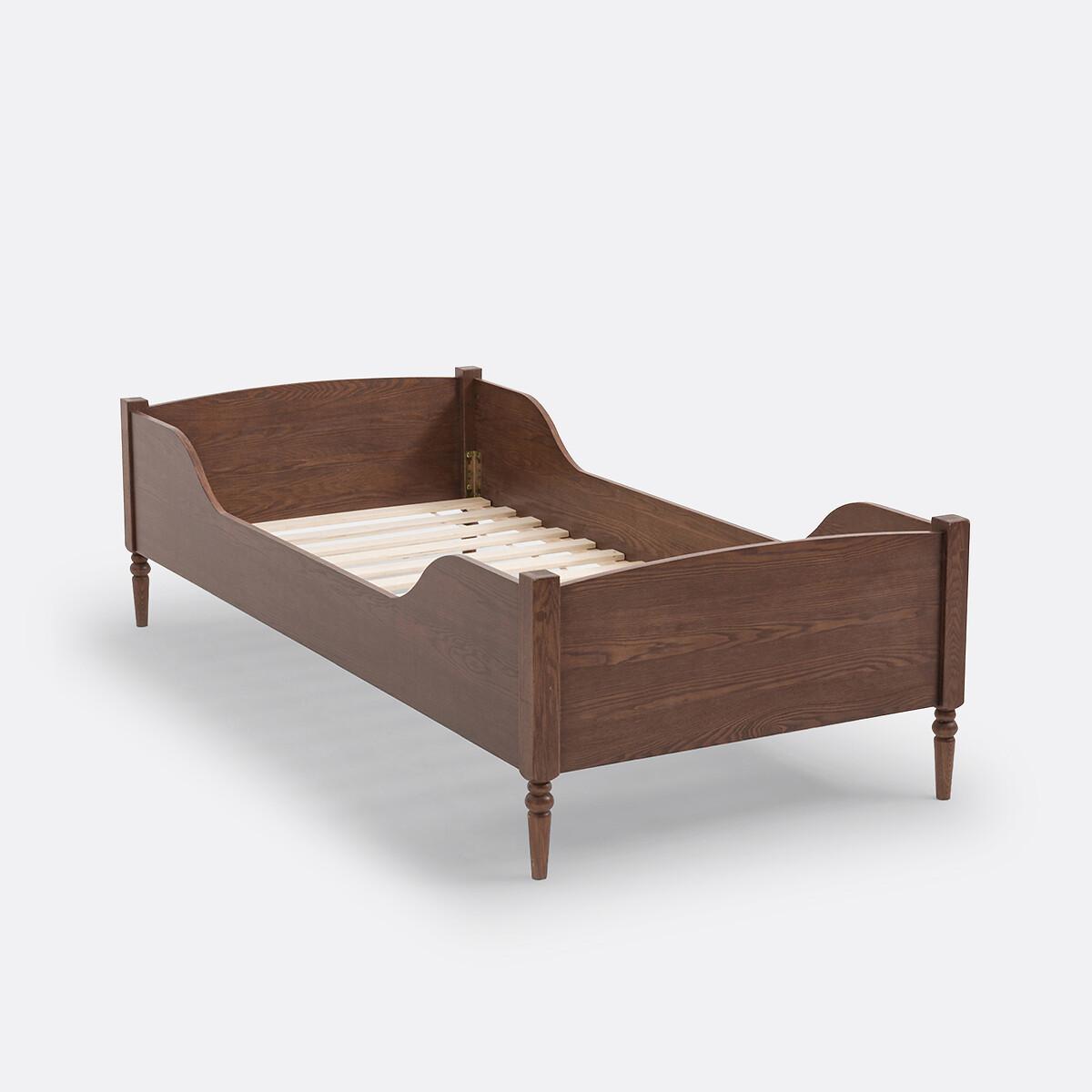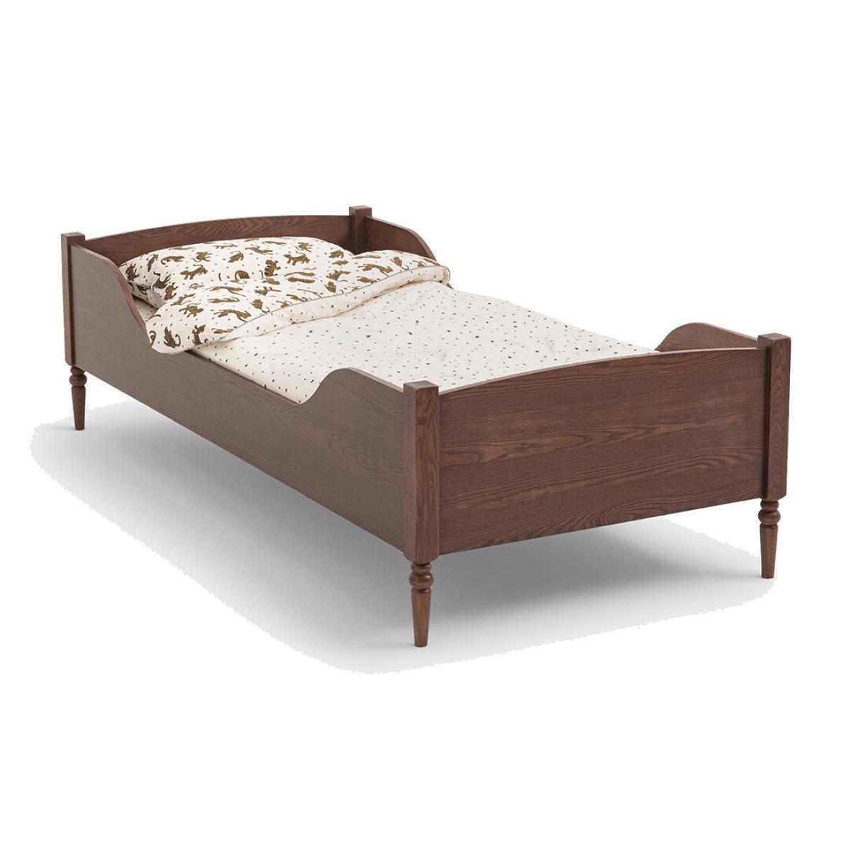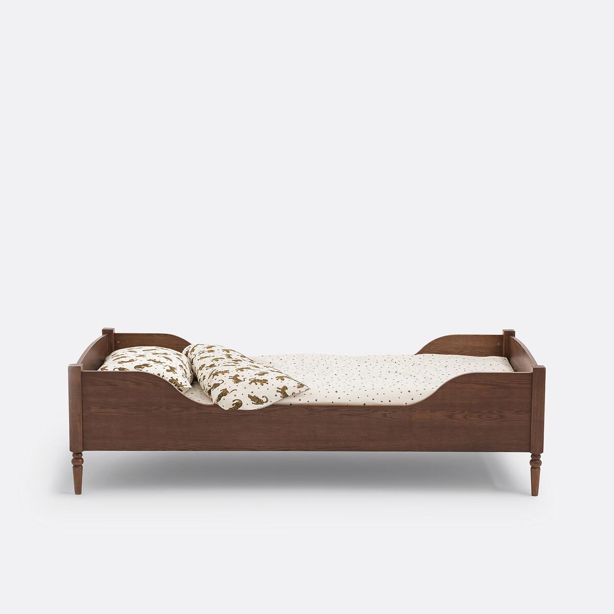 The Cléa children's bed. Delightfully retro with its curves and turned legs, the Clea child's bed brings a romantic touch that is still on trend. Product Details • Structure and base in walnut stained ash, water-based paint finish • Supplied with slatted base. To place on the interior frame of the bed. • Sleeping area 90 x 190cm • Recommended mattress height: 10cm. To move your bed, we advise you to lift it and not push or pull it. Quality Info • Not suitable for children under 3 years • This product complies with current safety requirements. Dimensions • Width: 96.4cm • Height: 56.5cm • Length: 201.3cm • Weight: 35kgDelivery:. This product is sold for self-assembly. Available for home delivery. Dimensions and weight of parcel2 parcels • L105 x H66.5 x D20.5cm. 23kg • L198 x H45 x D12cm. 17kg