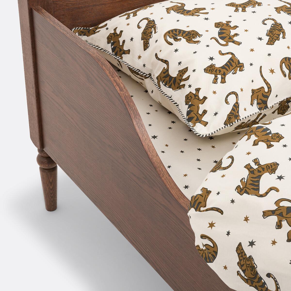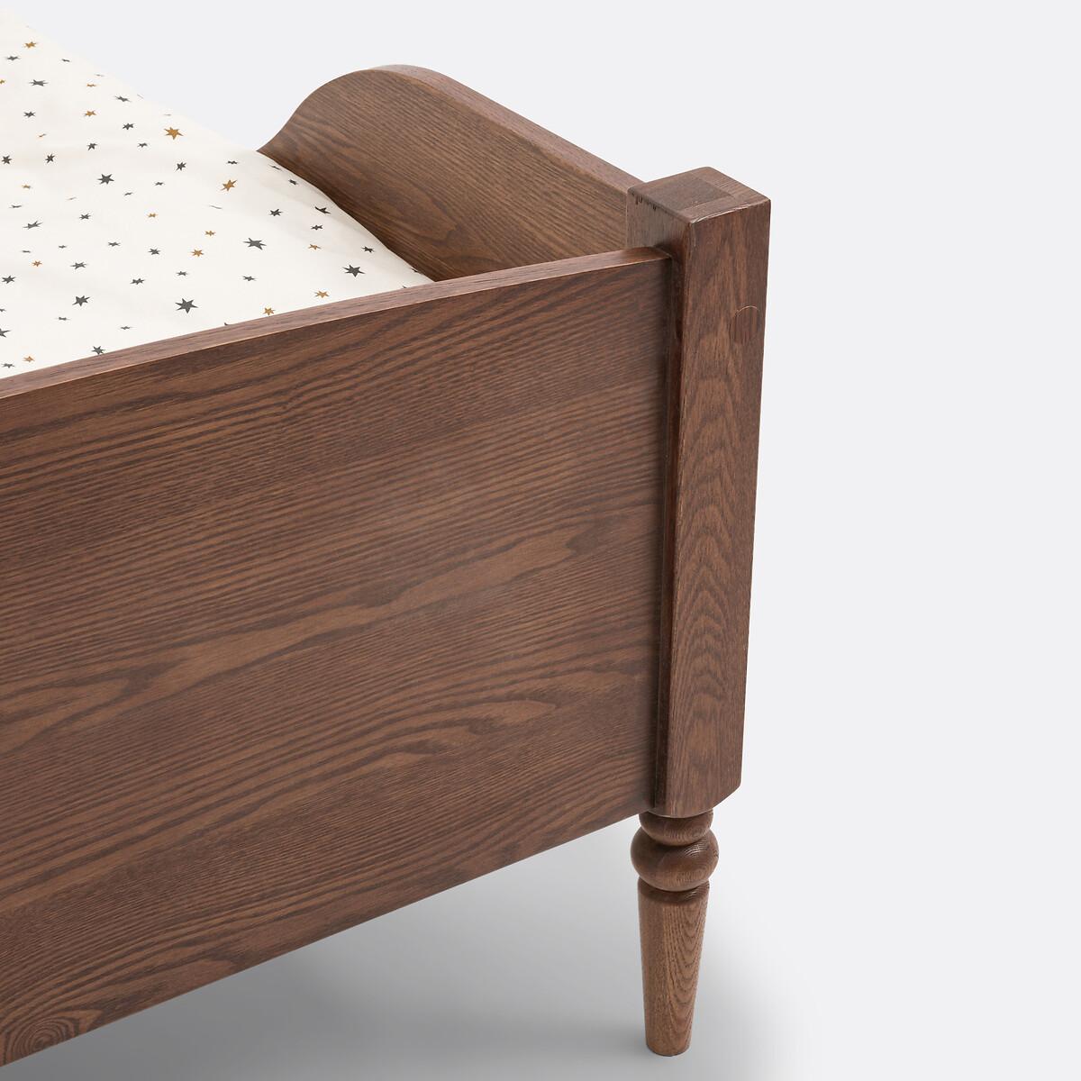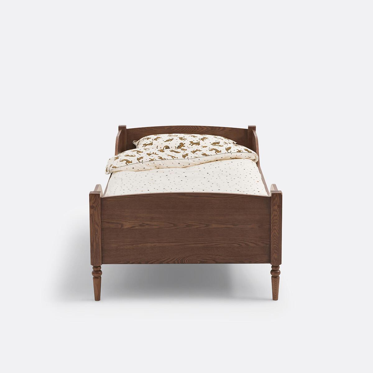 The Cléa children's bed. Delightfully retro with its curves and turned legs, the Clea child's bed brings a romantic touch that is still on trend. Product Details • Structure and base in walnut stained ash, water-based paint finish • Supplied with slatted base. To place on the interior frame of the bed. • Sleeping area 90 x 190cm • Recommended mattress height: 10cm. To move your bed, we advise you to lift it and not push or pull it. Quality Info • Not suitable for children under 3 years • This product complies with current safety requirements. Dimensions • Width: 96.4cm • Height: 56.5cm • Length: 201.3cm • Weight: 35kgDelivery:. This product is sold for self-assembly. Available for home delivery. Dimensions and weight of parcel2 parcels • L105 x H66.5 x D20.5cm. 23kg • L198 x H45 x D12cm. 17kg