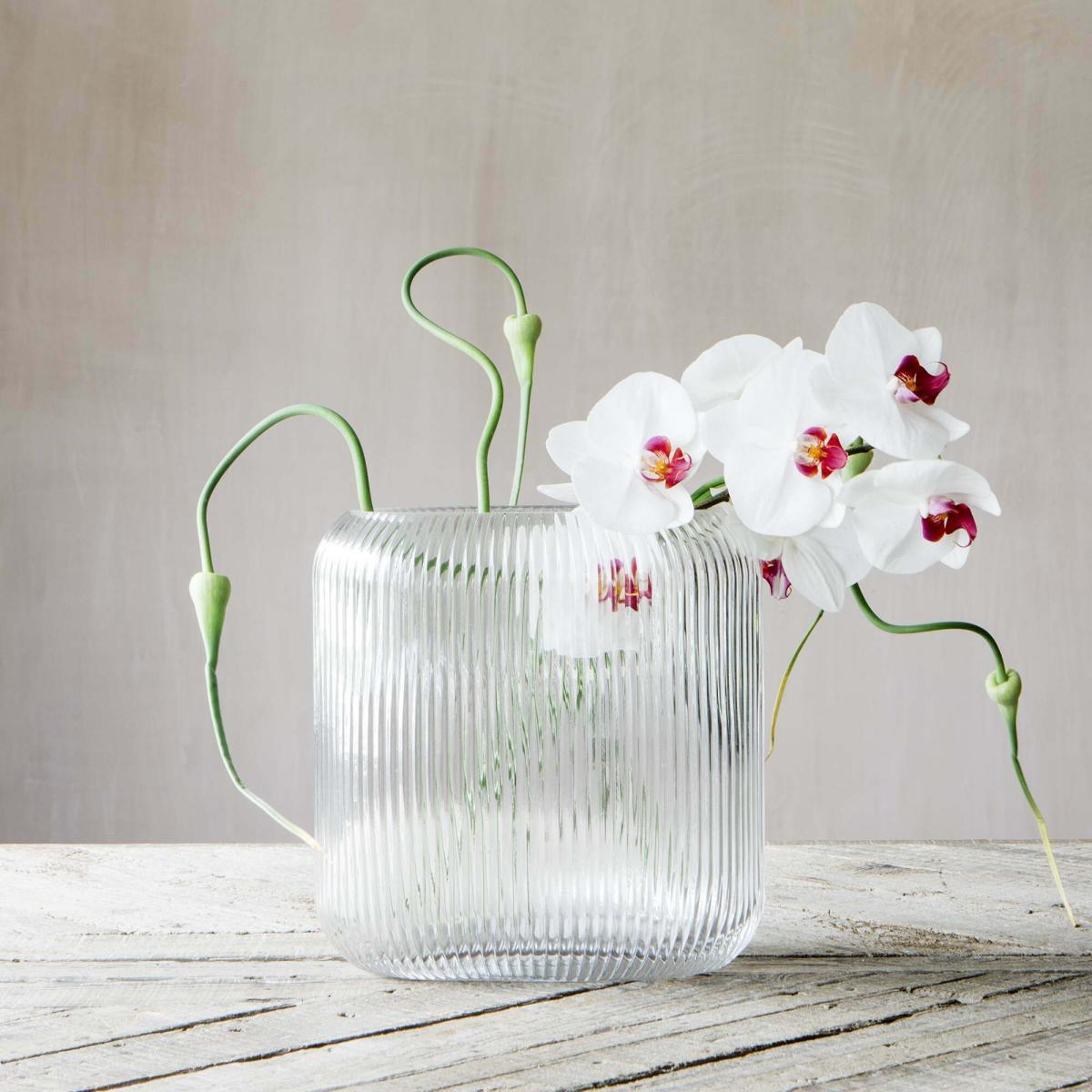 I love this clear ribbed vase for its understated elegance and versatility. Its minimalist design works well in both contemporary and vintage-inspired interiors, adding a subtle texture without feeling overpowering. It's perfect for showcasing single stems or small floral arrangements, like the orchids shown, which benefit from its transparent quality. Practical styling tips include layering it with other glassware for a modern tablescape, or using it alone as a statement piece on a sideboard or windowsill. Its neutral look means it pairs nicely with a range of colours and styles, making it a reliable choice for adding a touch of refined simplicity to any space.