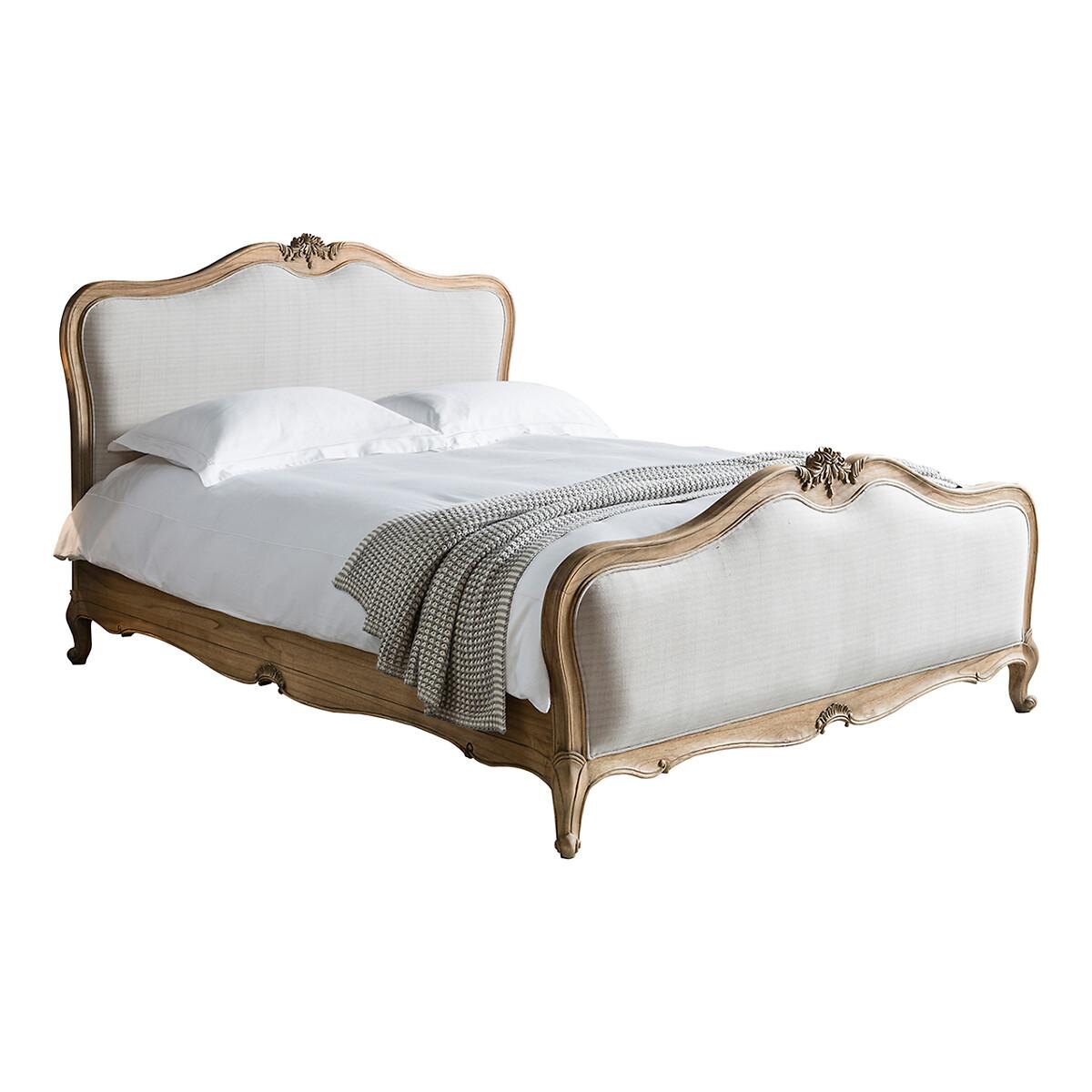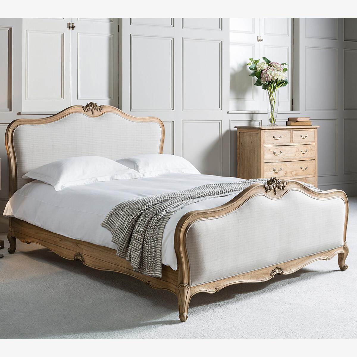 A stunning French style vintage mahogany bed with a linen headboard and hand carved sections, this piece is guaranteed to add a chateau-inspired touch to your bedroom. Product details. Linen headboard Hand carved sections. Supplied with slatted wood base Mattress not included. Actual Size of Bed King - L215 x W168 x H129cm. Super King - L215 x W201 x H129cm. Mattress Size:Double - 140 x 190cm. King - 160 x 200cm. Super King 180 x 200cm. Footboard Height - 75cm. Underbed Storage Height - 28cm Parcel Dimensions:King Box 1 - L174 x W133 x H29cm Box 2 - L208 x W34 x H33cm Super King Box 1 - L201 x W174 x H29cm Box 2 - L211 x W33 x H35cm. Full Assembly Required. Please note: this product cannot be delivered to all Offshore Islands, Northern Ireland or Republic of Ireland. This product will be dispatched by one of our trusted suppliers. You’ll be contacted by their selected courier about your delivery. GALLE01